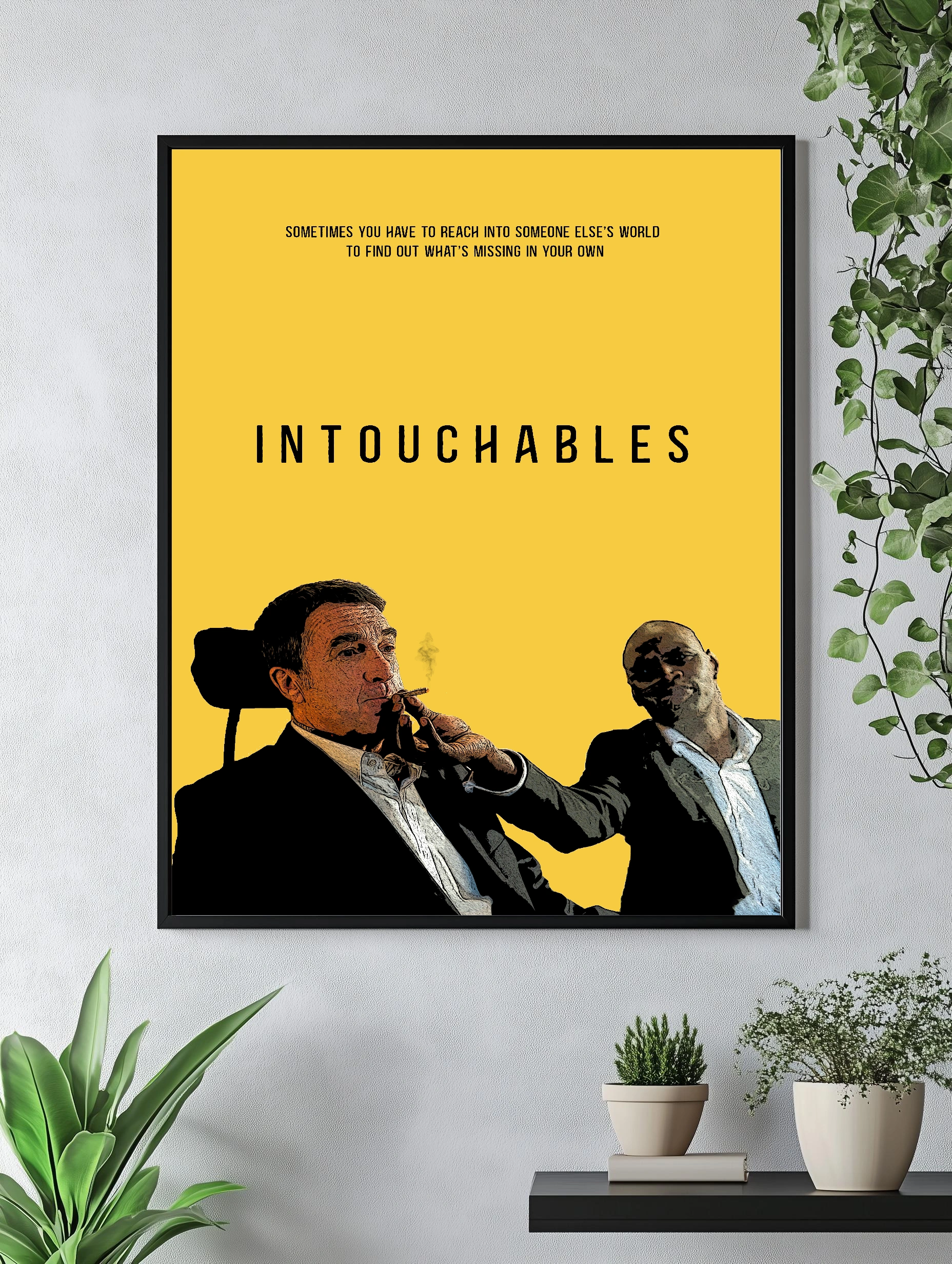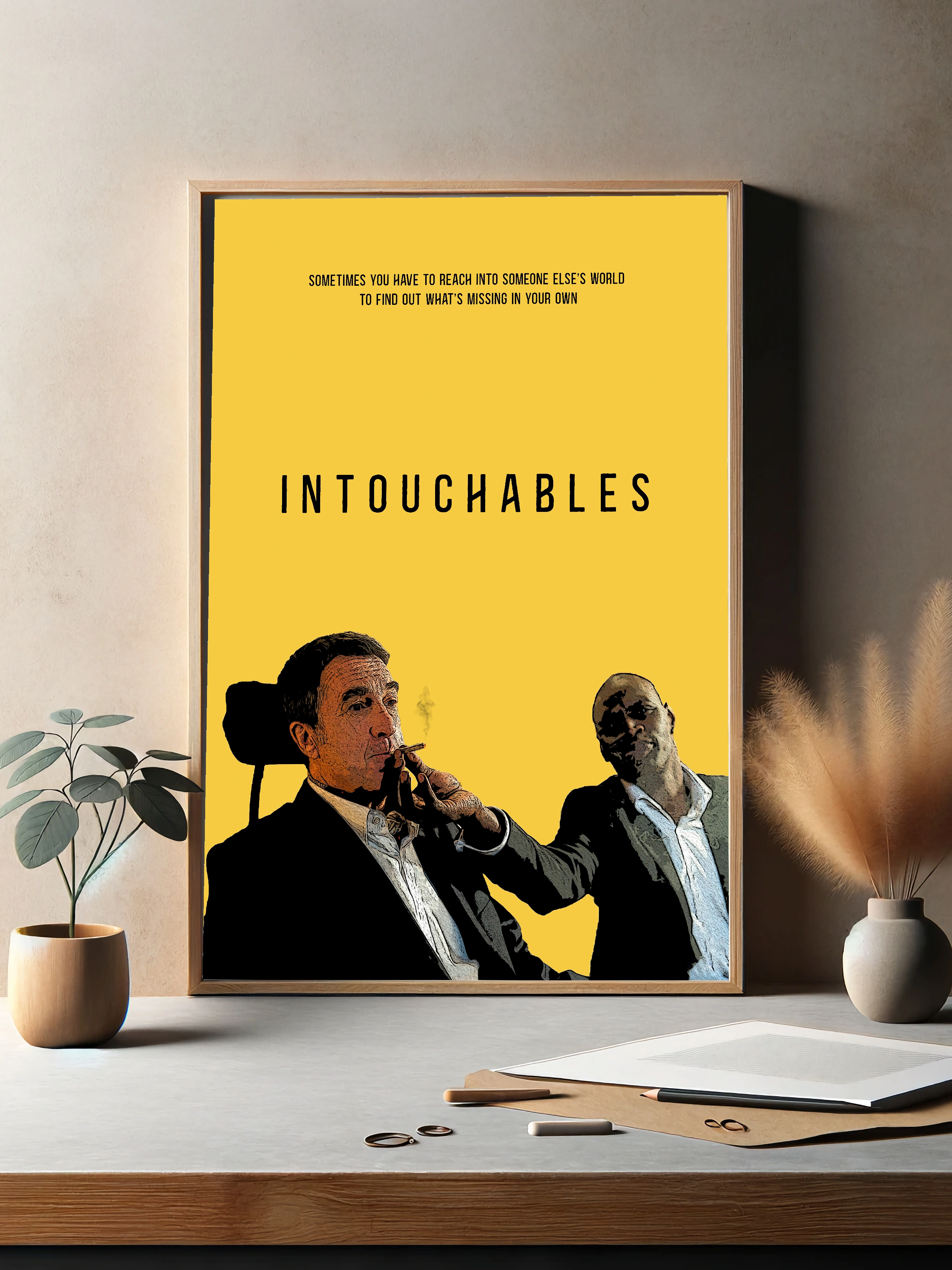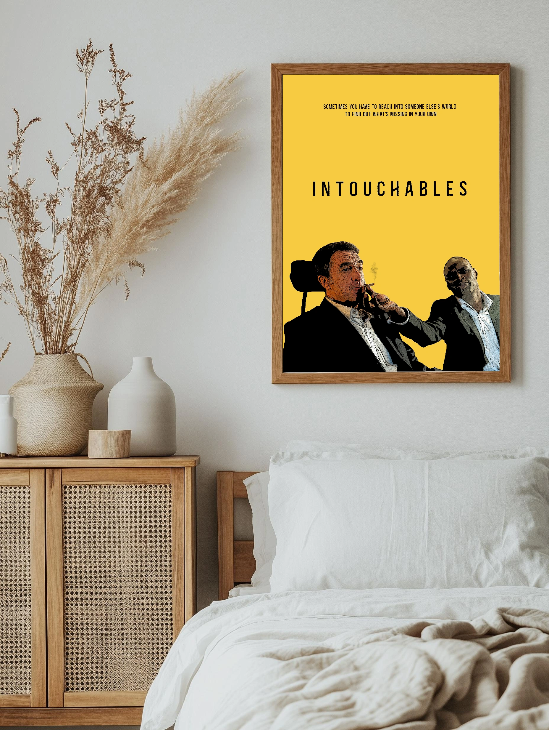 Этот интерьерный постер выполнен в минималистичном стиле с ярко-желтым фоном и изображением двух мужчин в полутона с выражением доверия и дружбы. Центральная надпись IN touchables намекает на фильм, подчеркивая ценность взаимопонимания и поддержки. Идеально подходит для декоративного оформления гостиной или офиса.