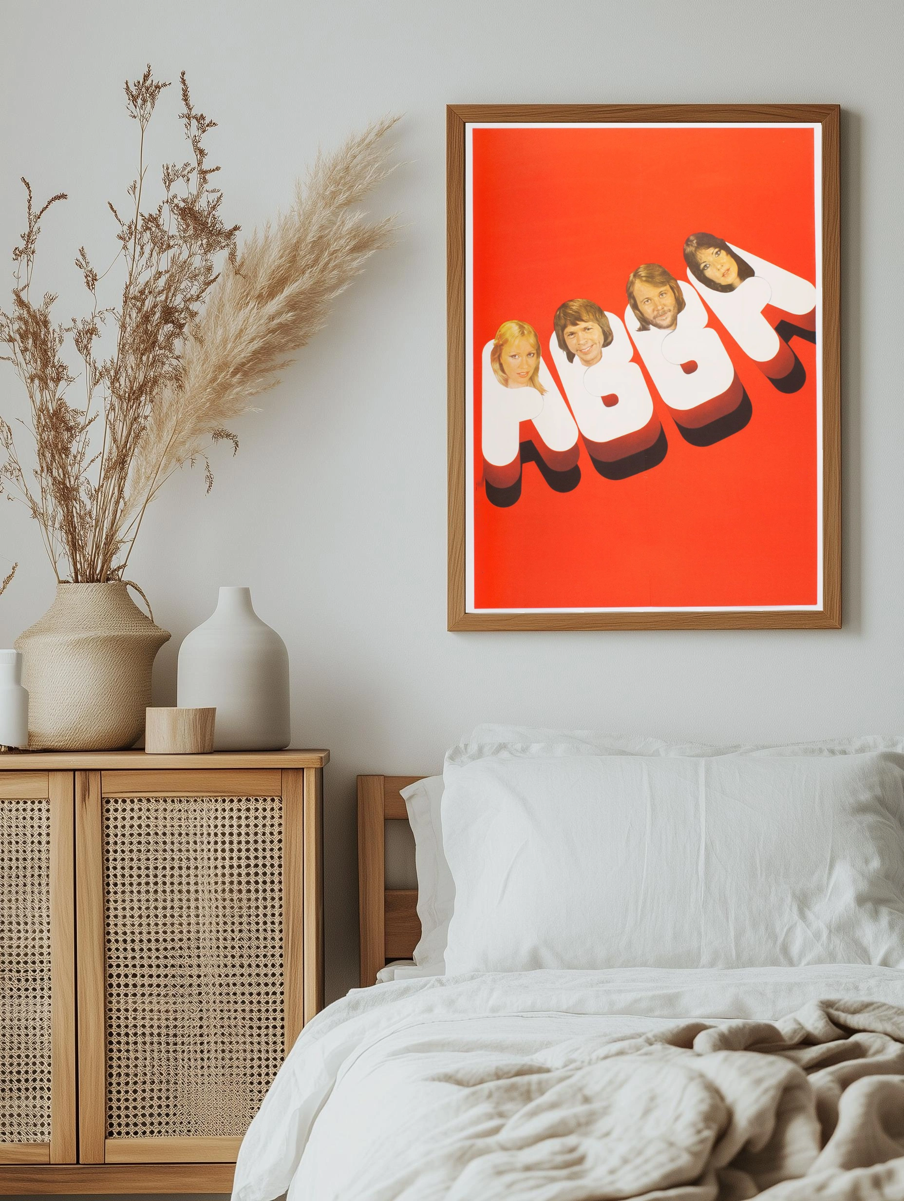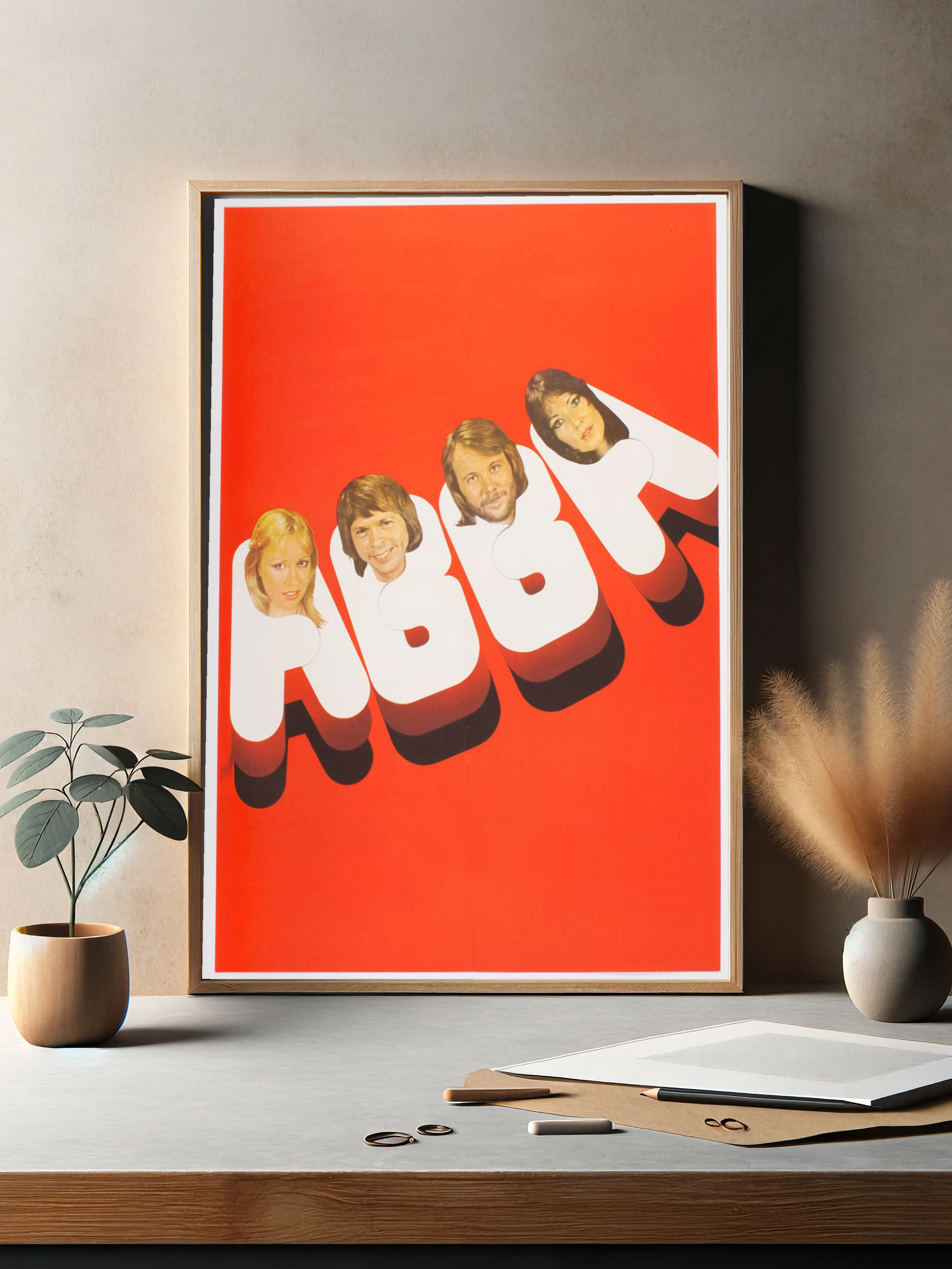 Интерьерное искусство с изображением участников легендарной шведской группы ABBA на ярком оранжевом фоне. Стильный декор стен с большими объемными белыми буквами и портретами музыкантов, создающий атмосферу ностальгии и музыкального прошлого. Идеально подходит для гостиной или офиса.