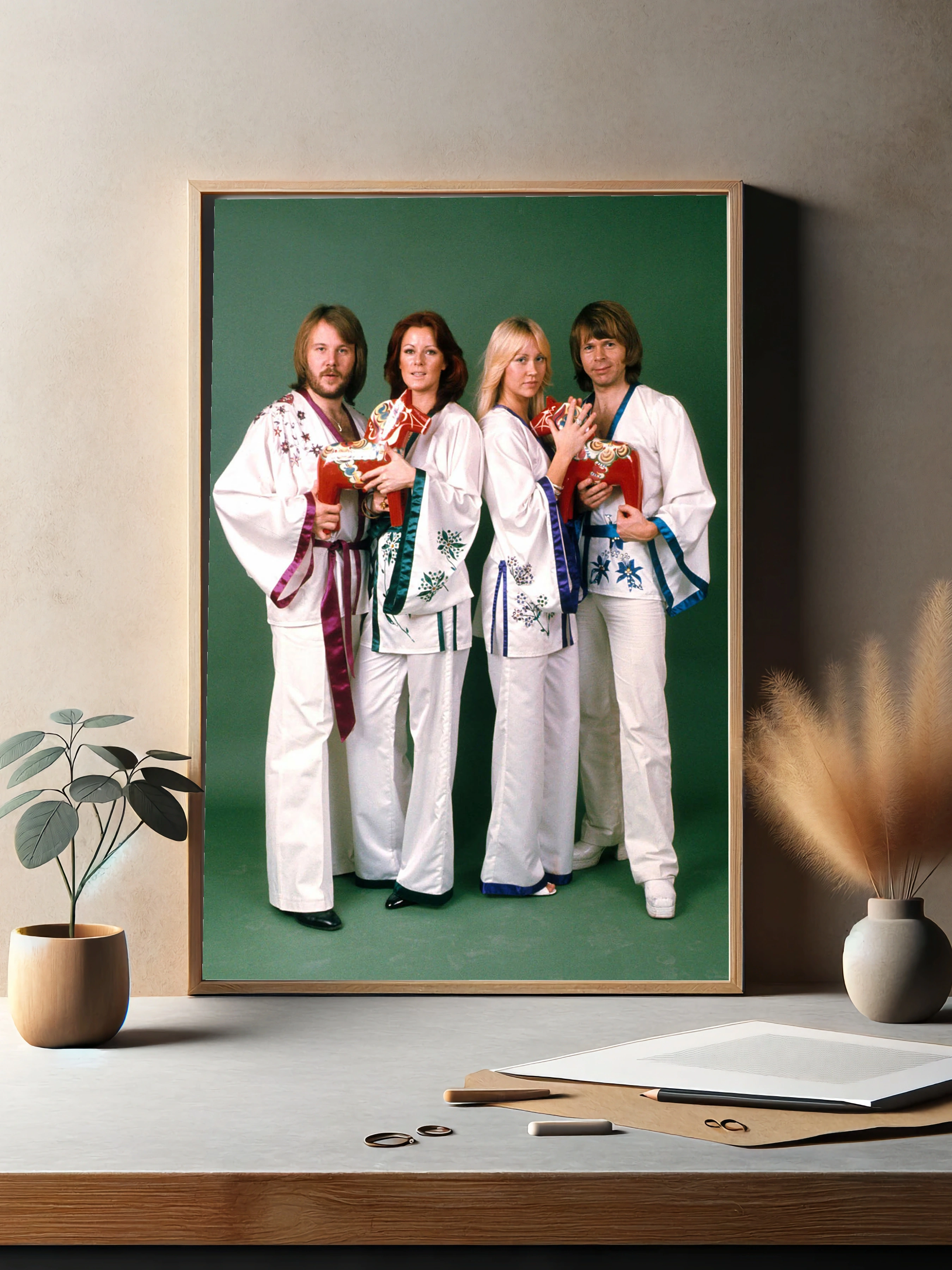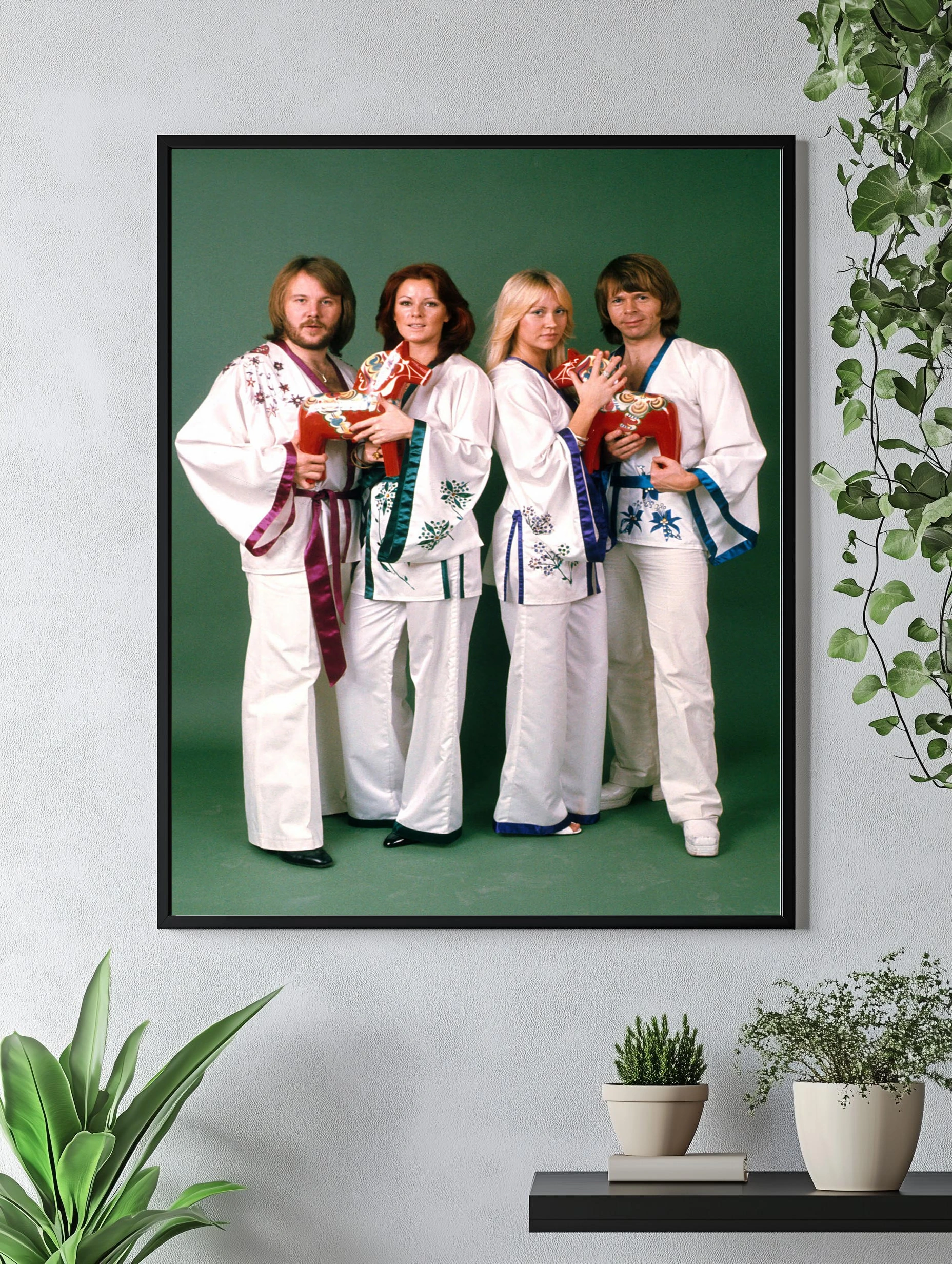 На изображении известная шведская группа ABBA в национальных костюмах белого цвета с цветочной вышивкой и разноцветными лентами. Четыре участника стоят на зеленом фоне, держа в руках красных лошадок — символ шведской культуры. Это арт в стиле музыкального ретро 70-х с акцентом на стильный интерьерный декор и фотопостер для гостиной или офиса.