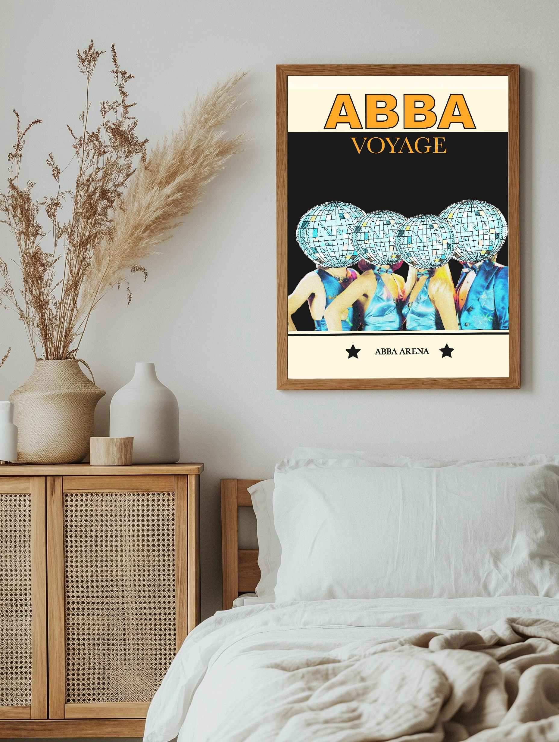 Декоративный плакат с изображением четырёх участников легендарной группы ABBA в ярких голубых нарядах и с рисунком глобусов вместо лиц на чёрном фоне. Заголовок ‘ABBA Voyage’ выполнен в жёлто-оранжевых тонах, создавая контраст и визуальный акцент. Отличное современное искусство для стен, подходящее для гостиной или офиса, привлекает внимание стильным декором.
