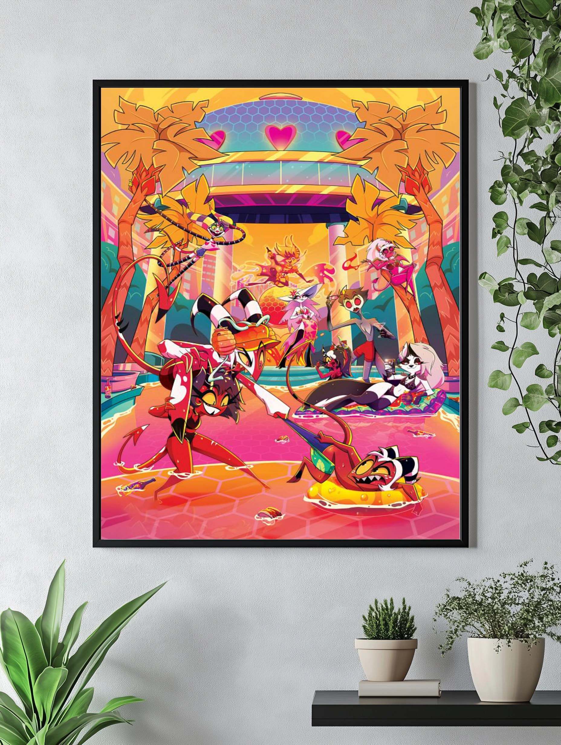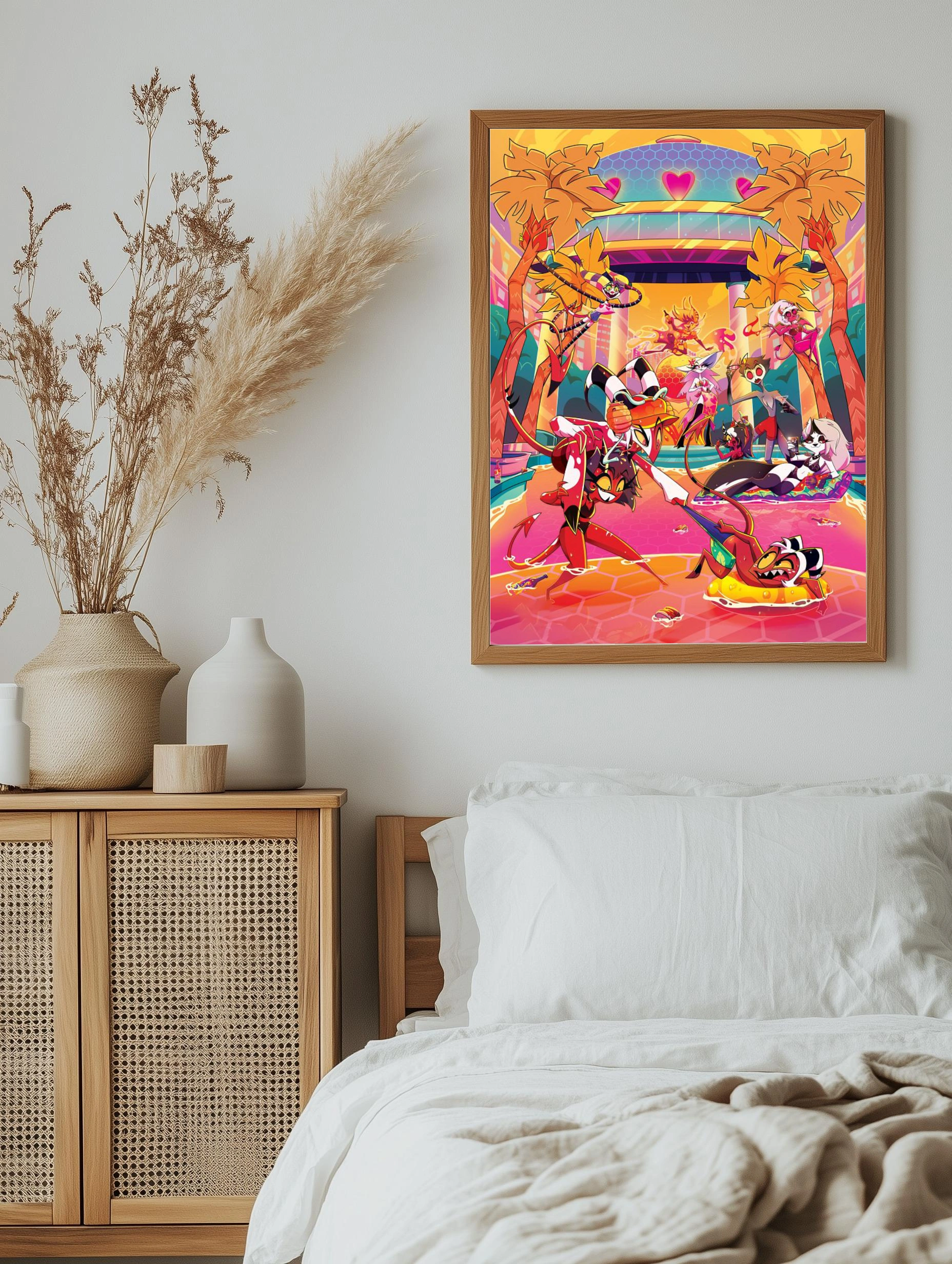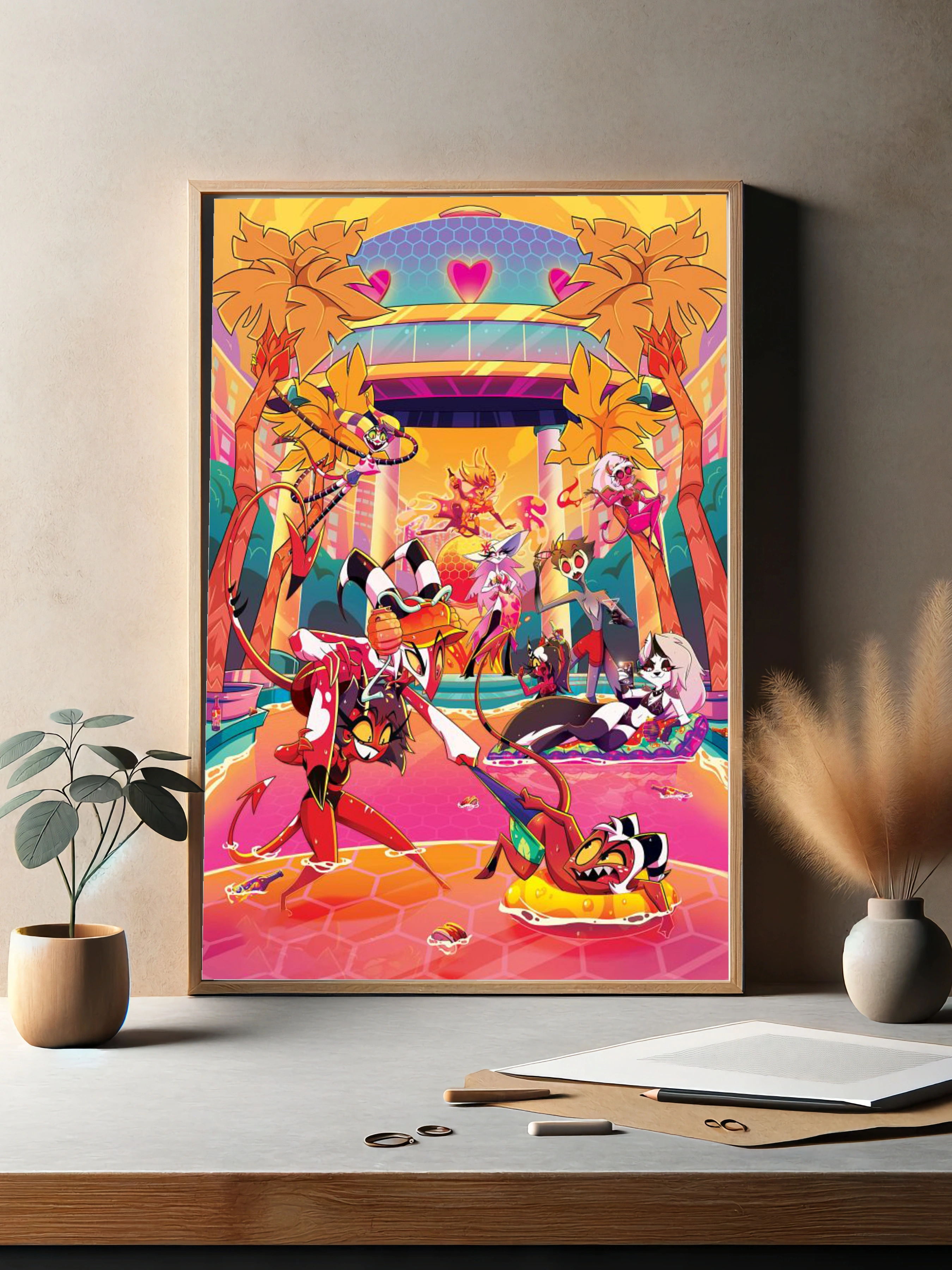 Декоративный плакат с яркими персонажами из анимационного сериала Hazbin Hotel. На изображении динамичные герои в стиле мультфильма на фоне футуристического интерьера с теплыми оттенками. Картина для гостиной и спальни, современное искусство для стен, стильный декор и интерьерное искусство.