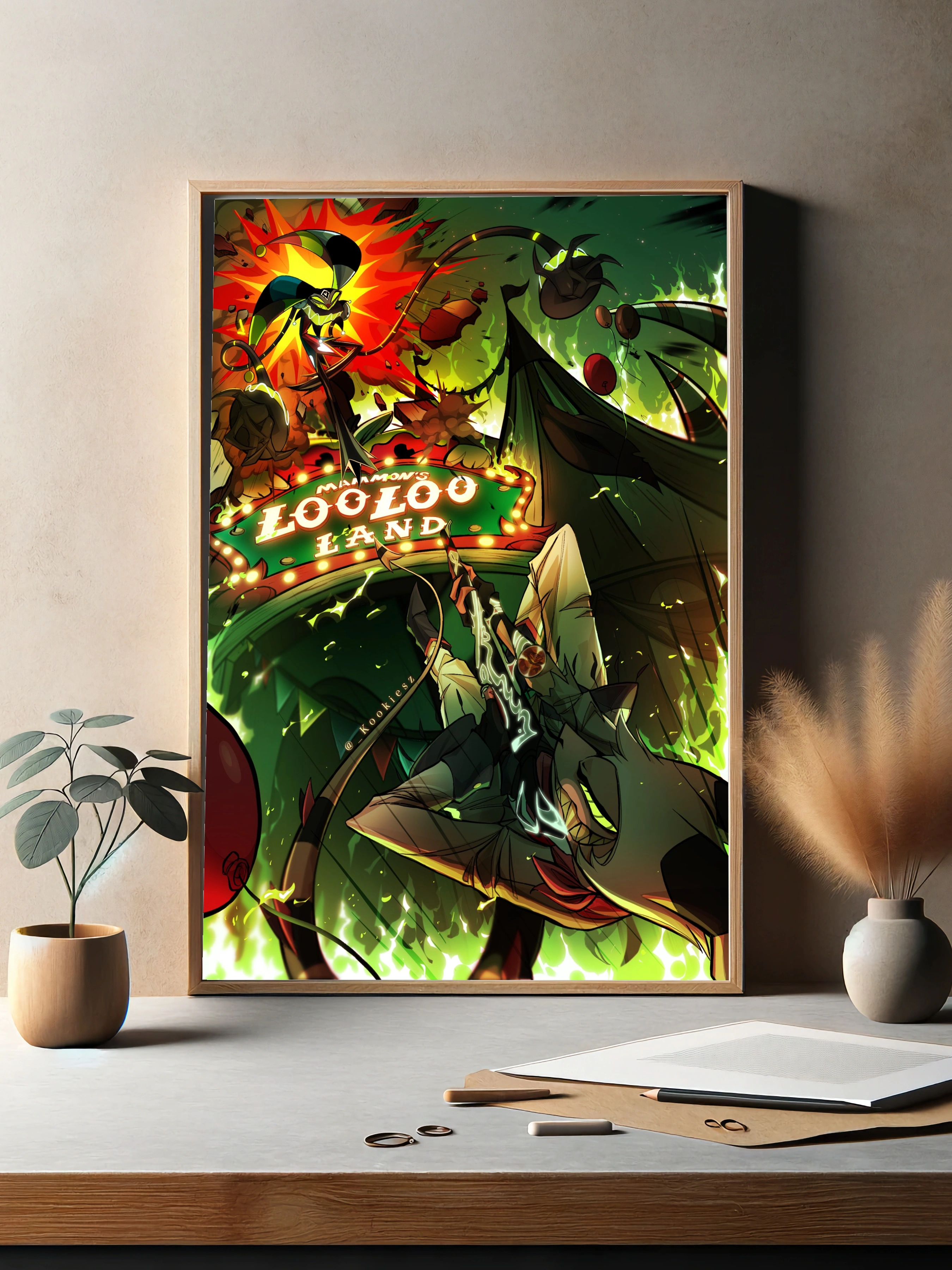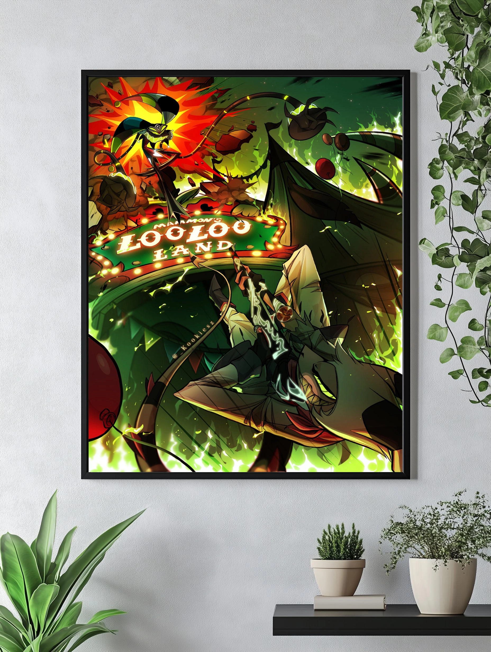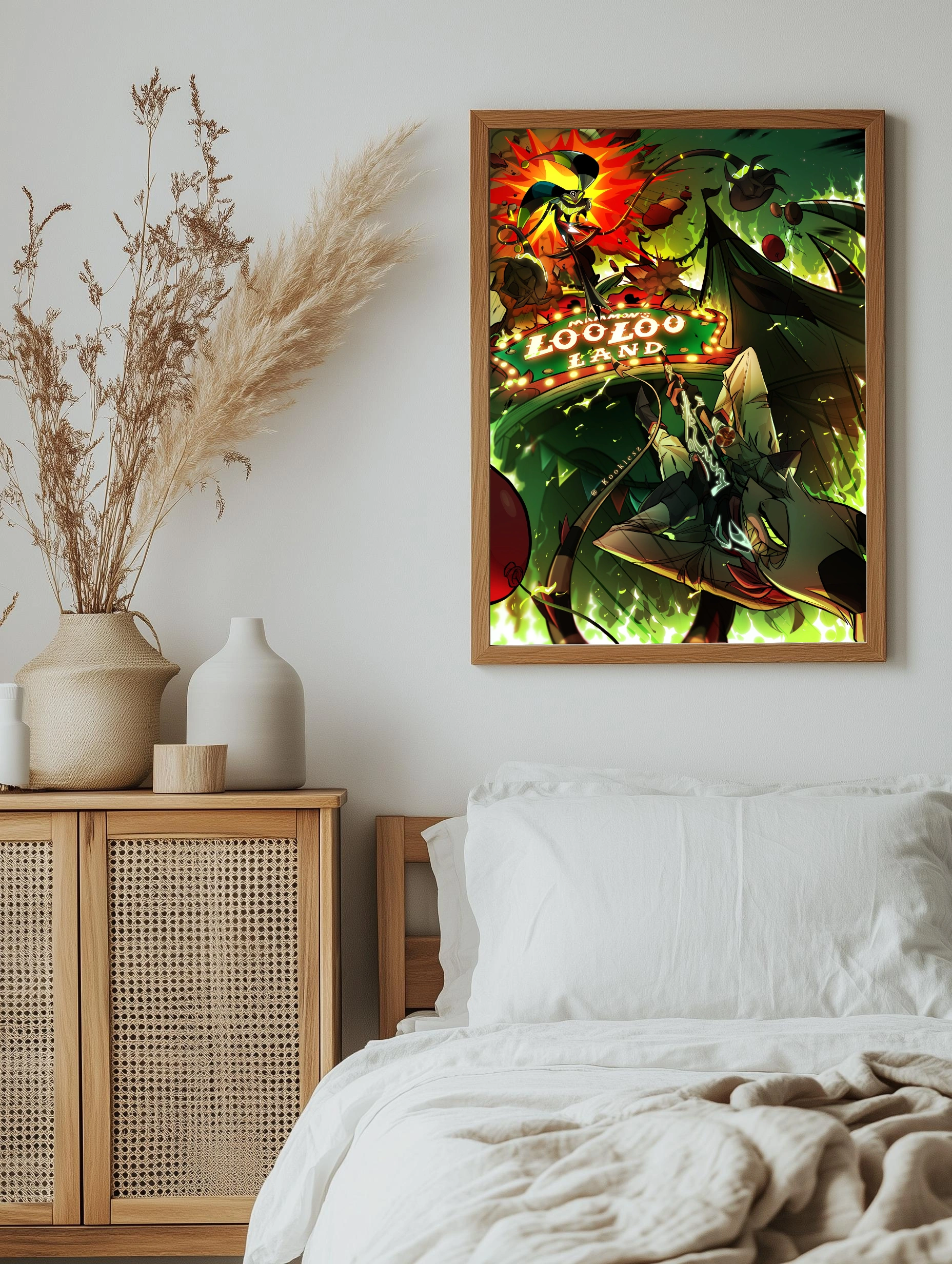 Яркая и динамичная картина с персонажем Лу Лу из мультсериала «Лоулуу». На изображении героиня окружена магической аурой, в центре композиции надпись «LooLoo Land». Изобилие зелёных и жёлтых оттенков создаёт атмосферу тайны и волшебства. Это отличный интерьерный арт для любителей современного искусства и анимации для стен.