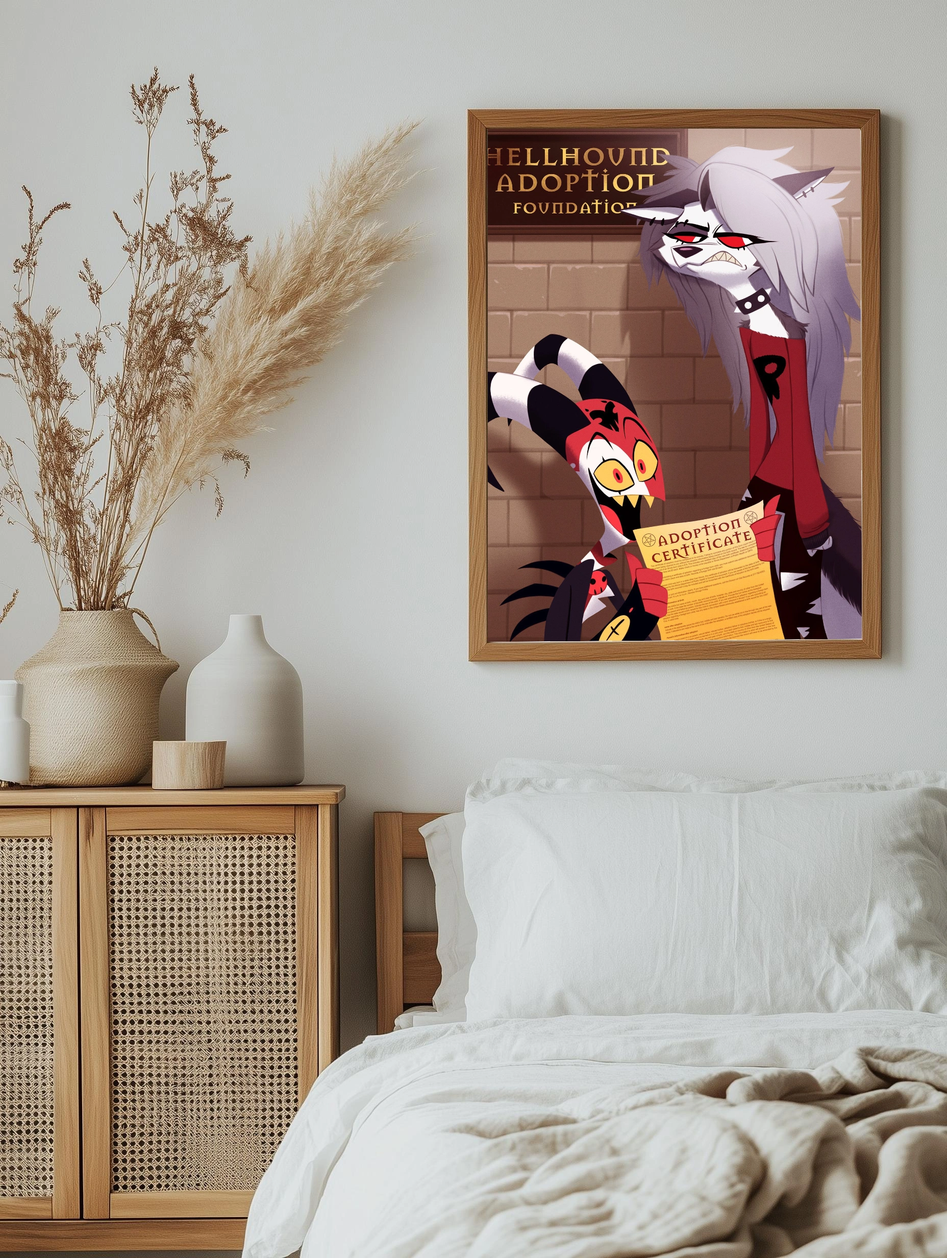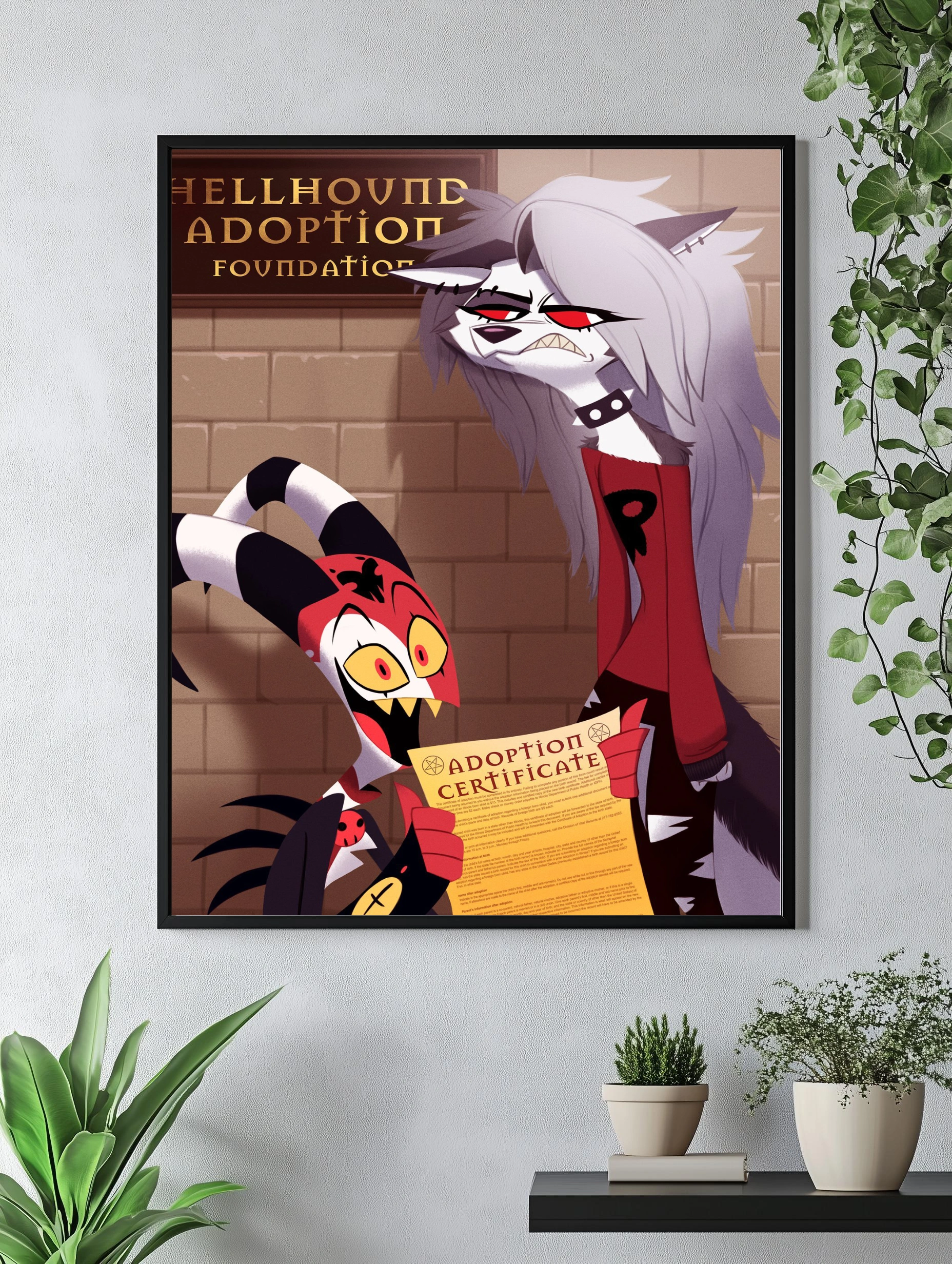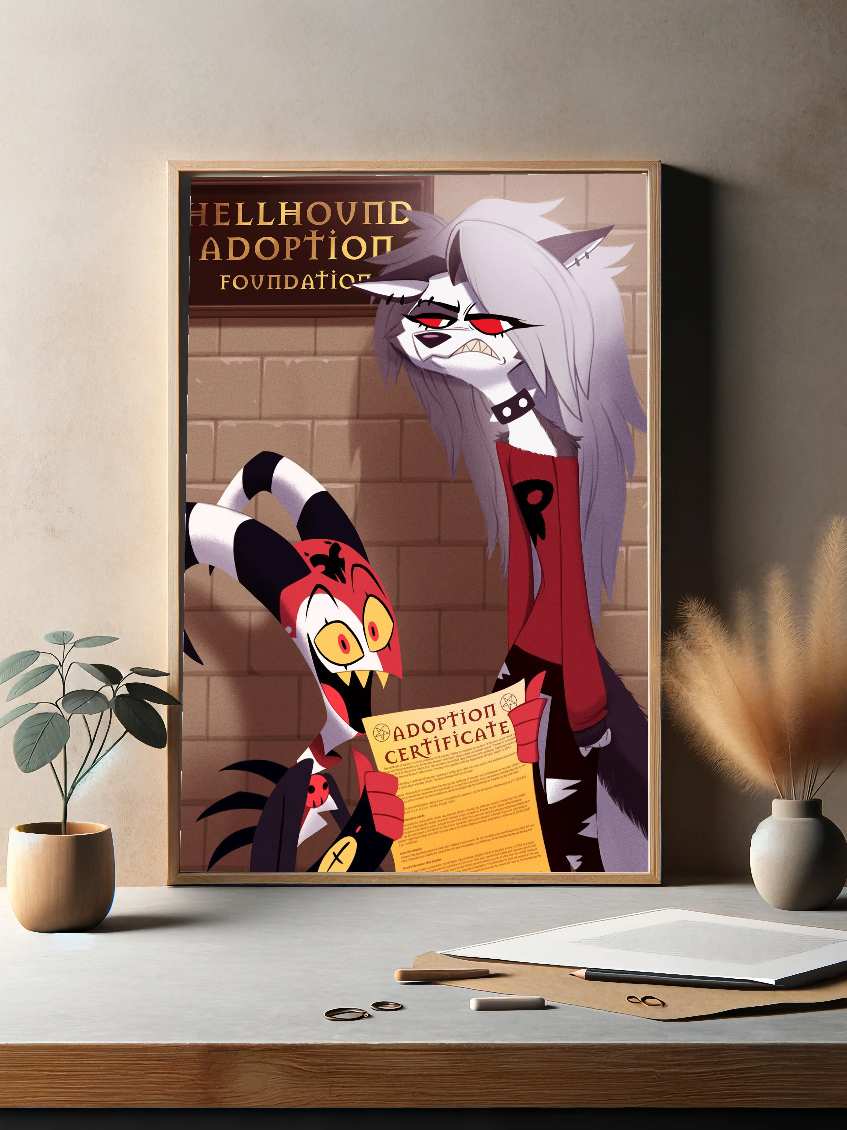 Изображение из анимационного сериала Helluva Boss, на котором представлены персонажи Хэллхунд и Азбесто. Визуальный стиль — мультяшный с выразительной графикой и чёткими контурами. Основной сюжет постера: Азбесто держит сертификат об усыновлении, а Хэллхунд выражает неодобрение. Цвета преимущественно красный, чёрный и серый. Отличный интерьерный арт с уникальными декоративными картинами для фанатов современного искусства для стен и стильного декора.
