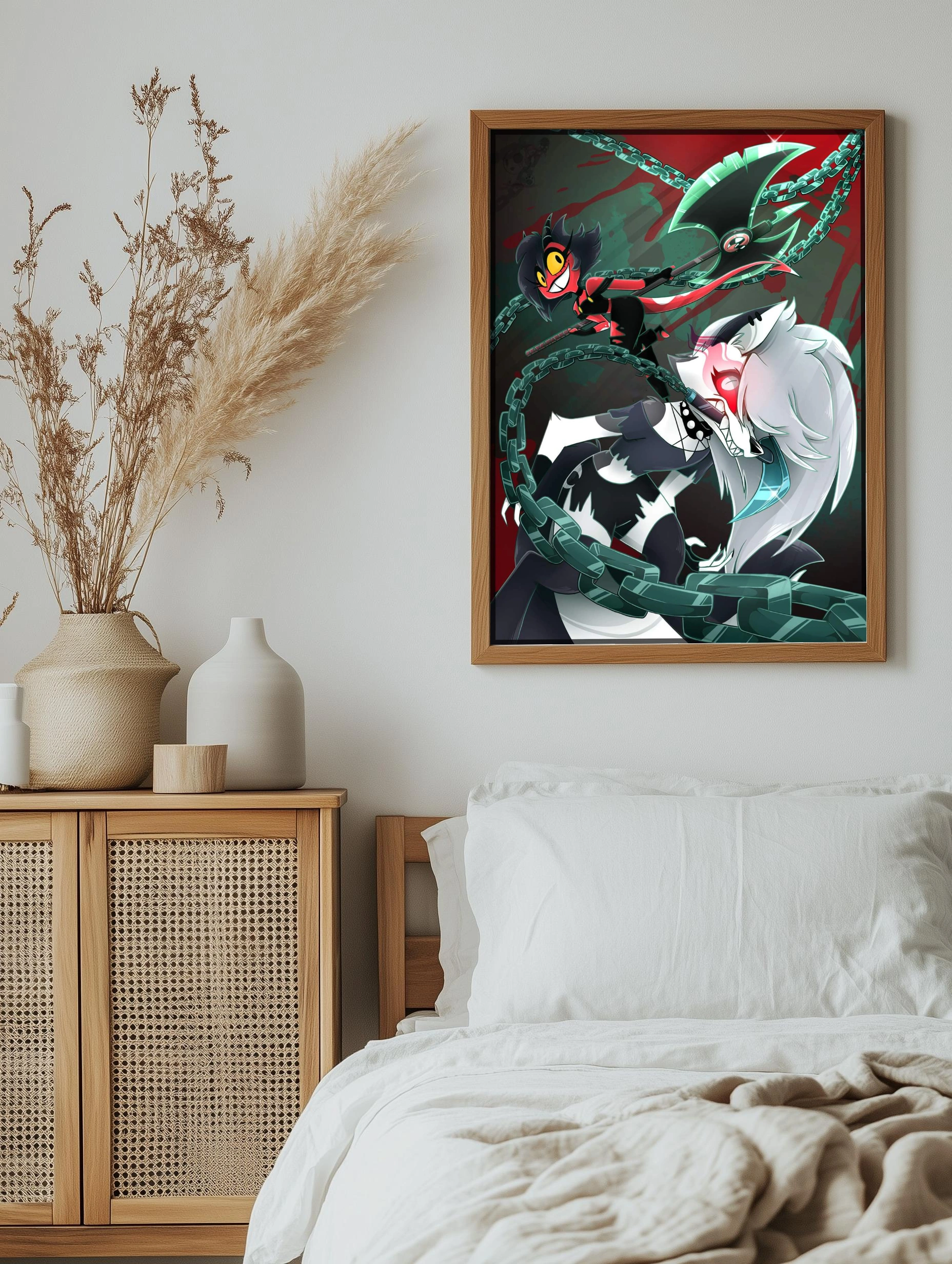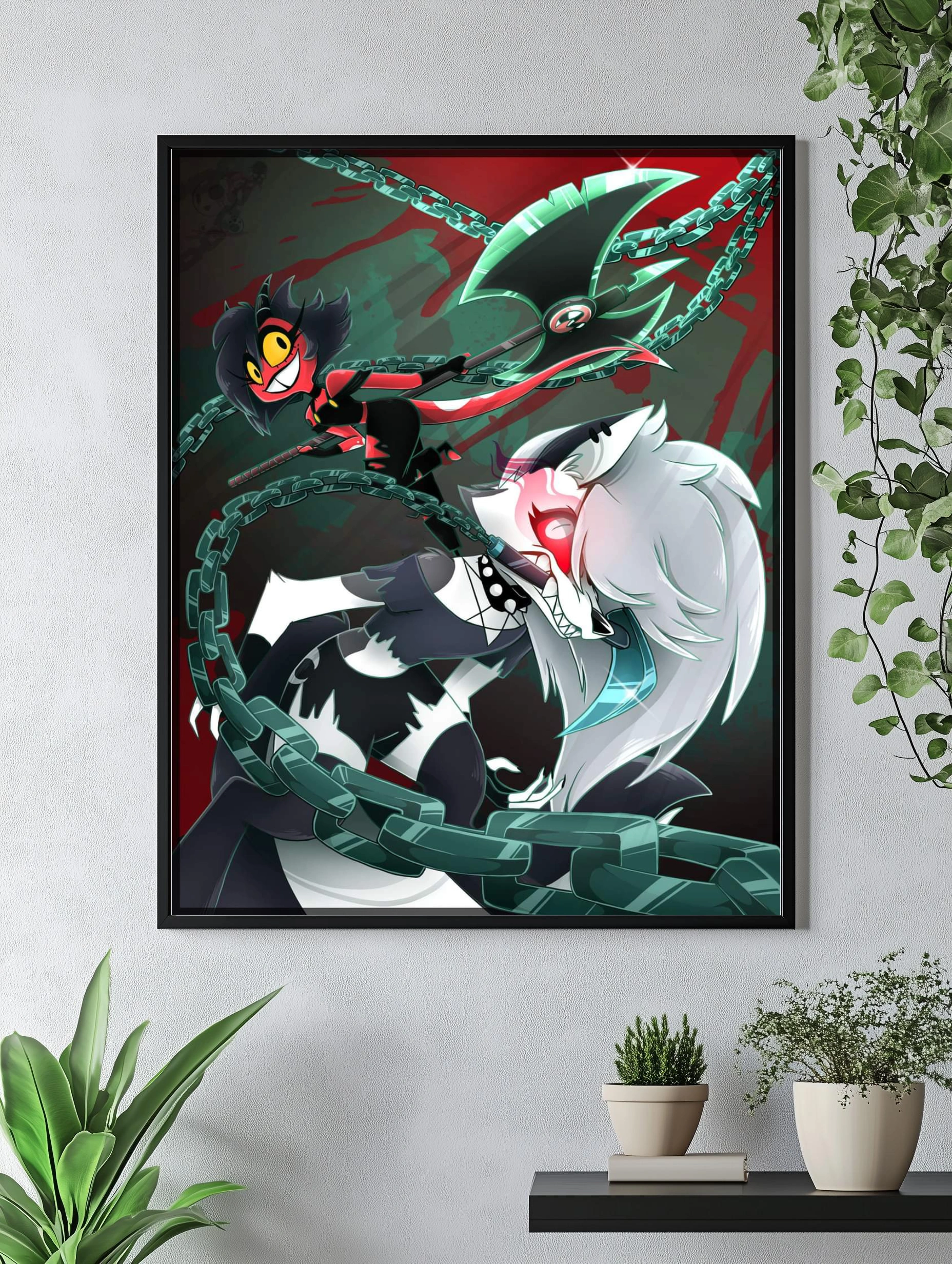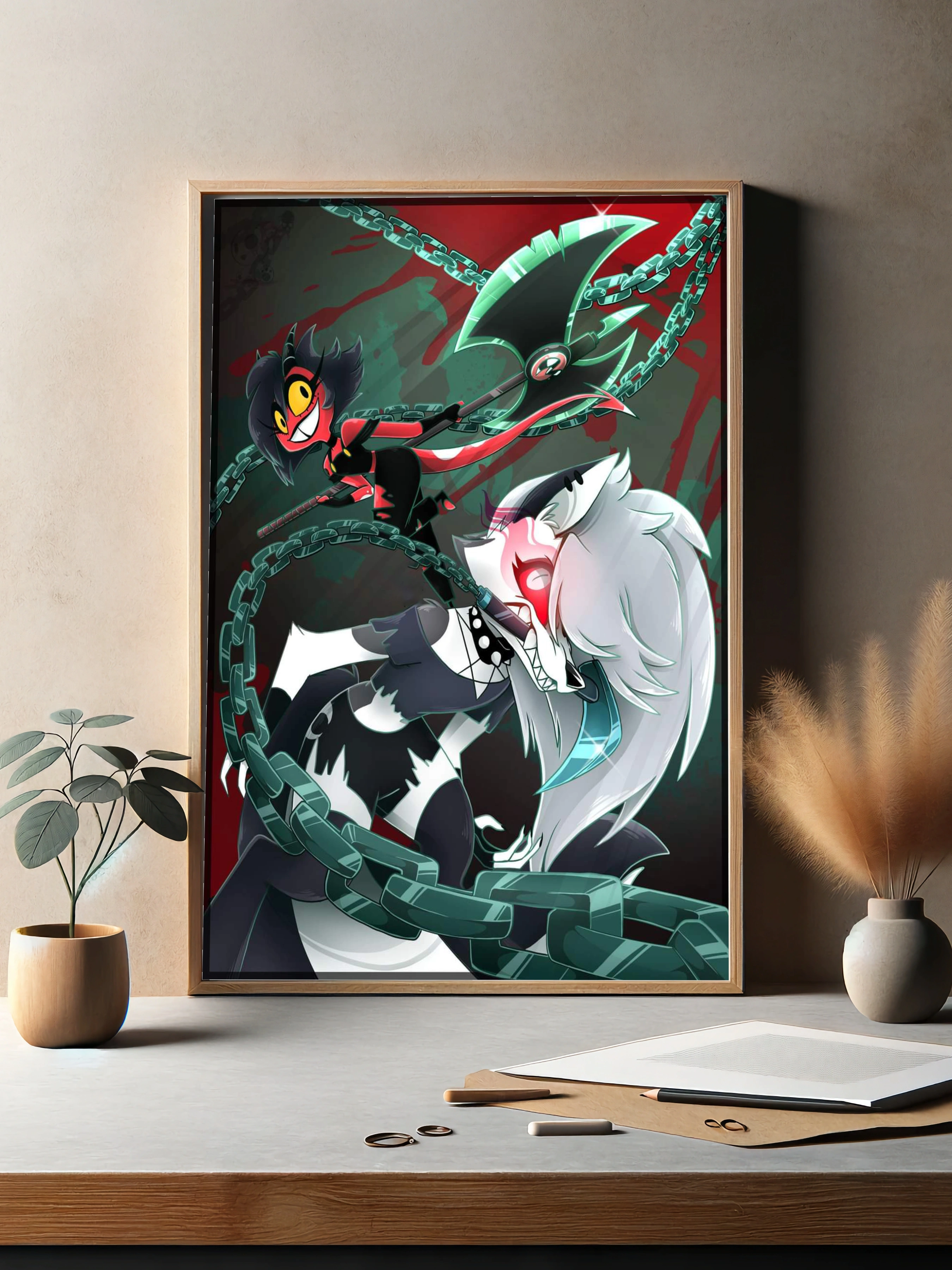 Изображение показывает двух персонажей из анимационного сериала Helluva Boss — Хеллкэт (Helluva Boss) и Спектрала (Blitzo). Художественный стиль динамичный, с яркими контрастными оттенками красного, черного и белого. Цепи и оружие создают напряжённое и мистическое настроение. Отличный интерьерный арт для поклонников современной анимации.