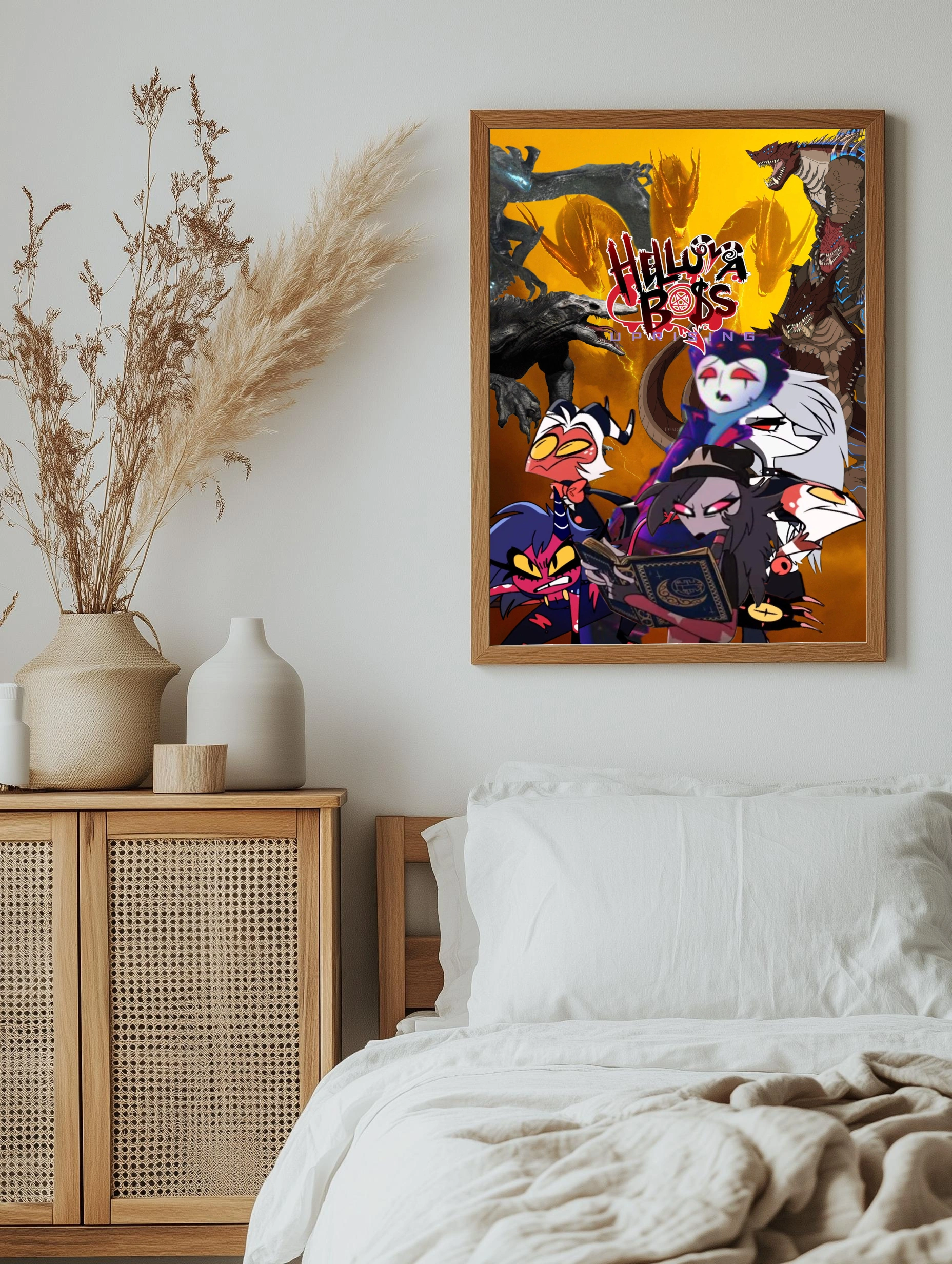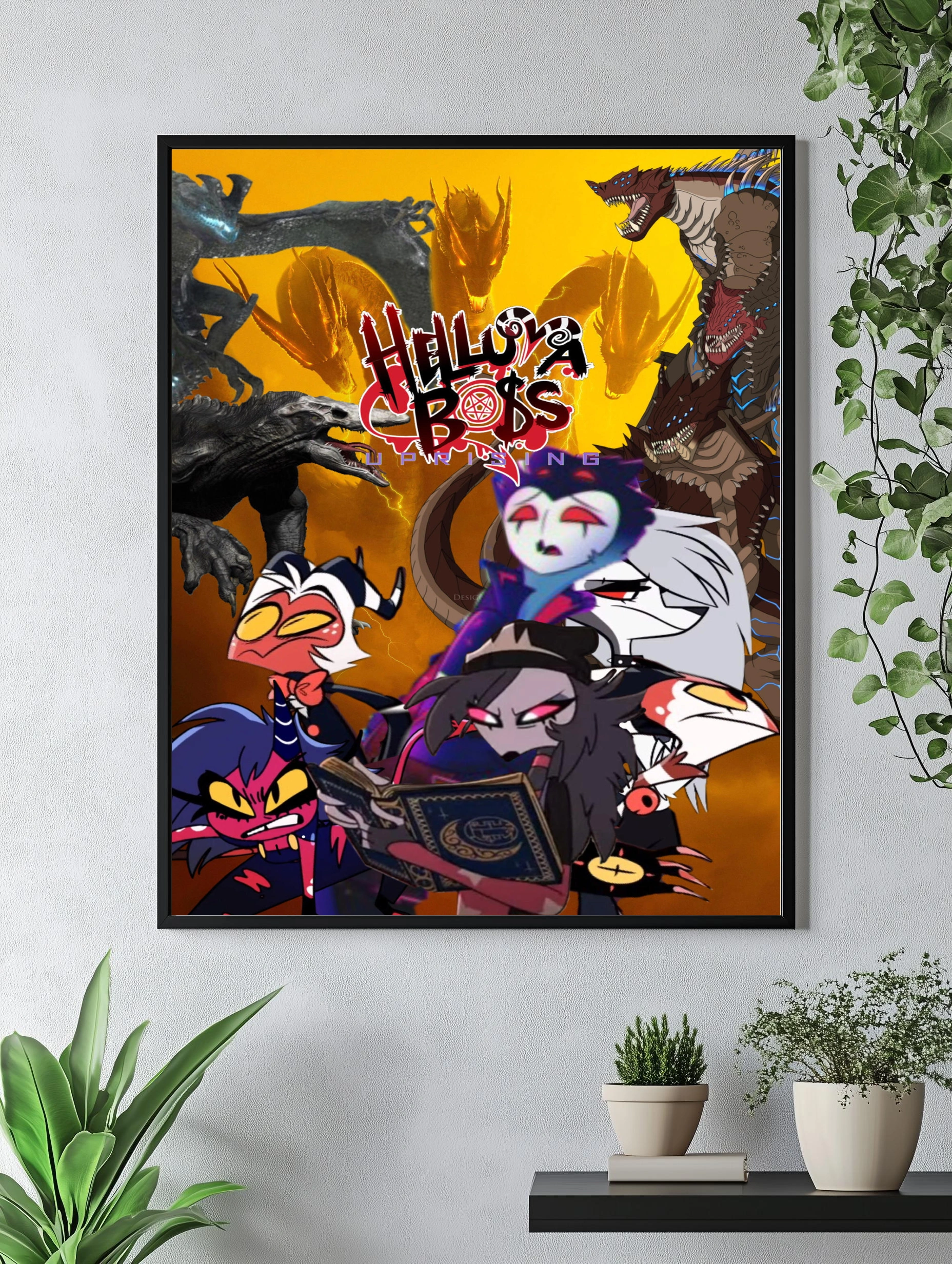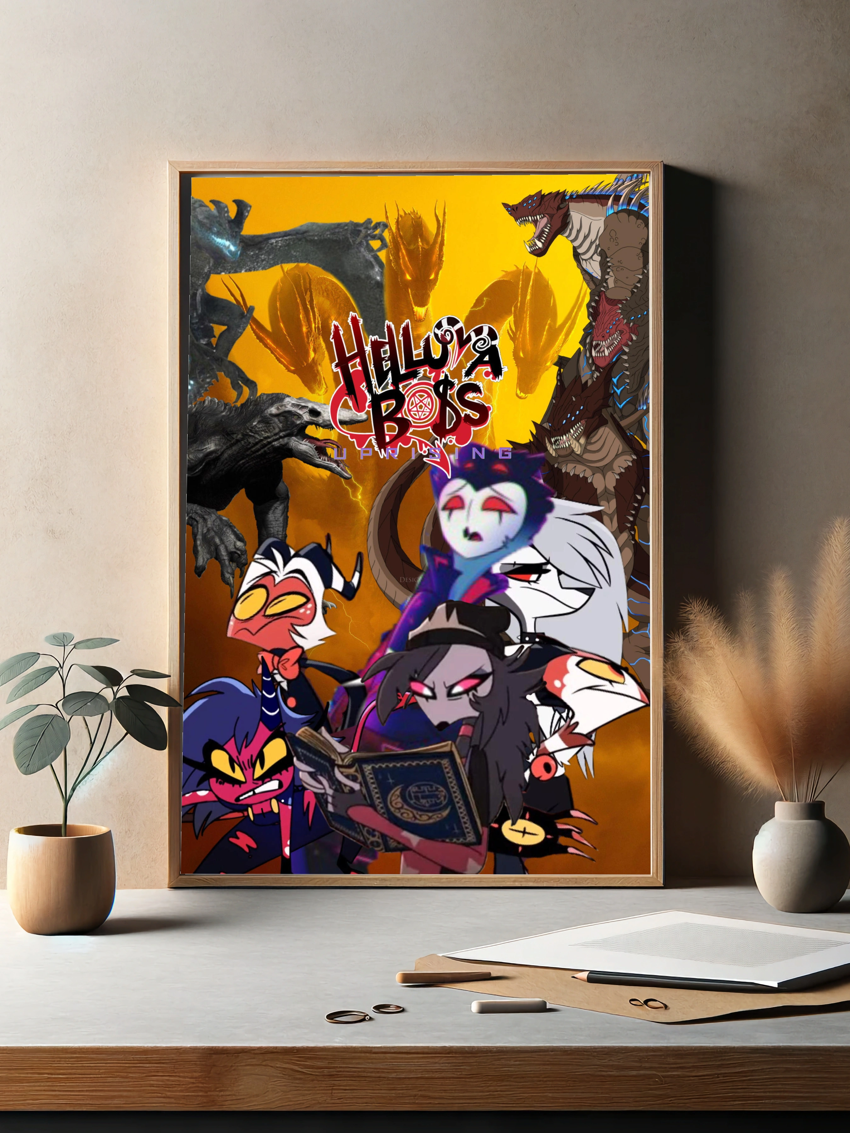 Этот интерьерный постер посвящён мультфильму Helluva Boss и изображает главных персонажей на фоне огненно-жёлтого неба с драконами и чудовищами. Яркий и динамичный дизайн, сочетающий тёмные и насыщенные цвета, отлично подходит для стильного декора стен, создавая атмосферу мистики и фэнтези.