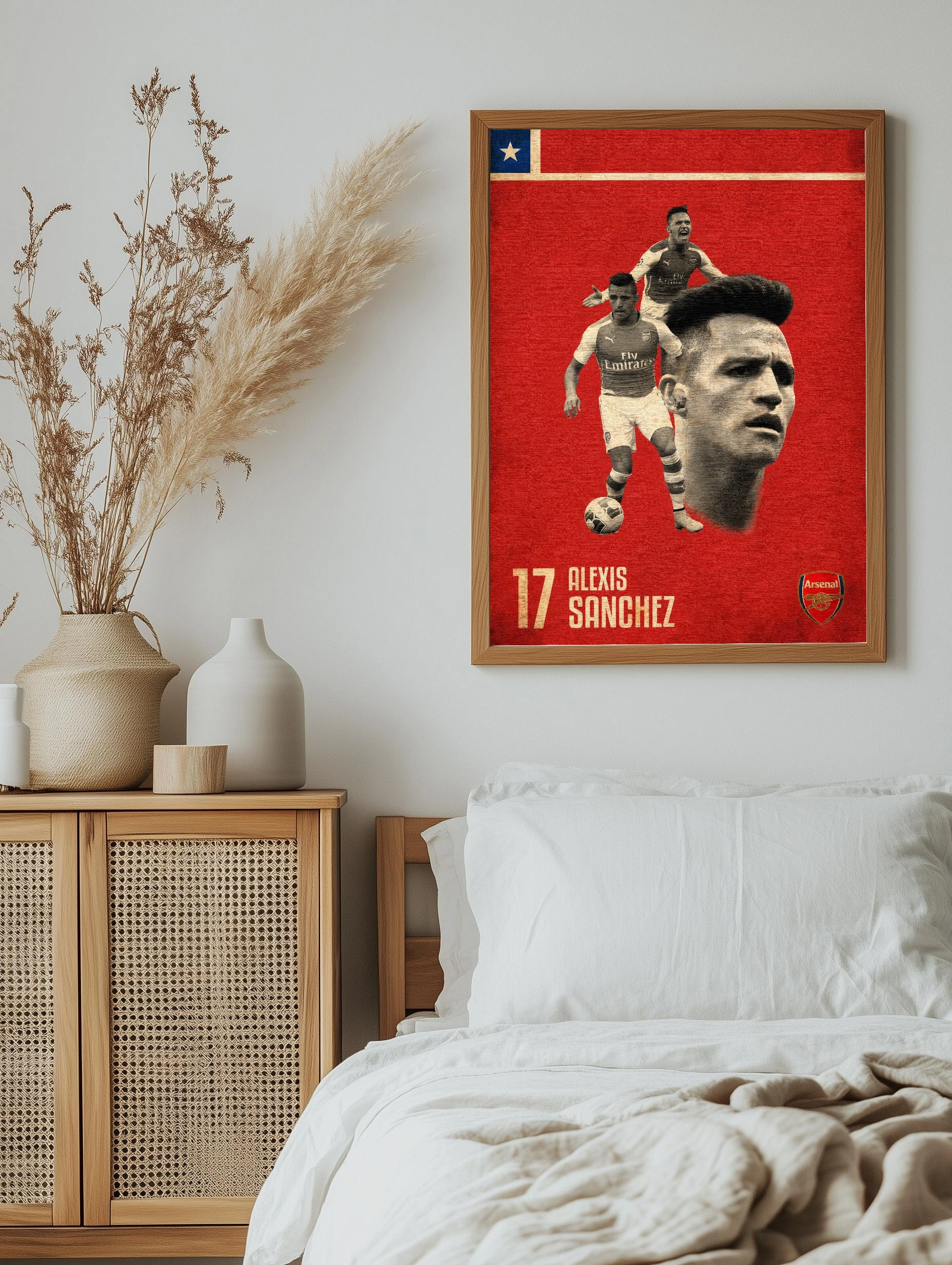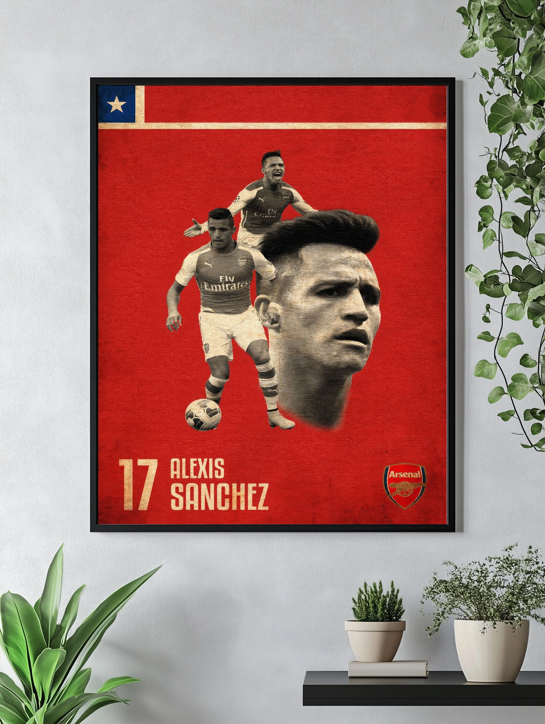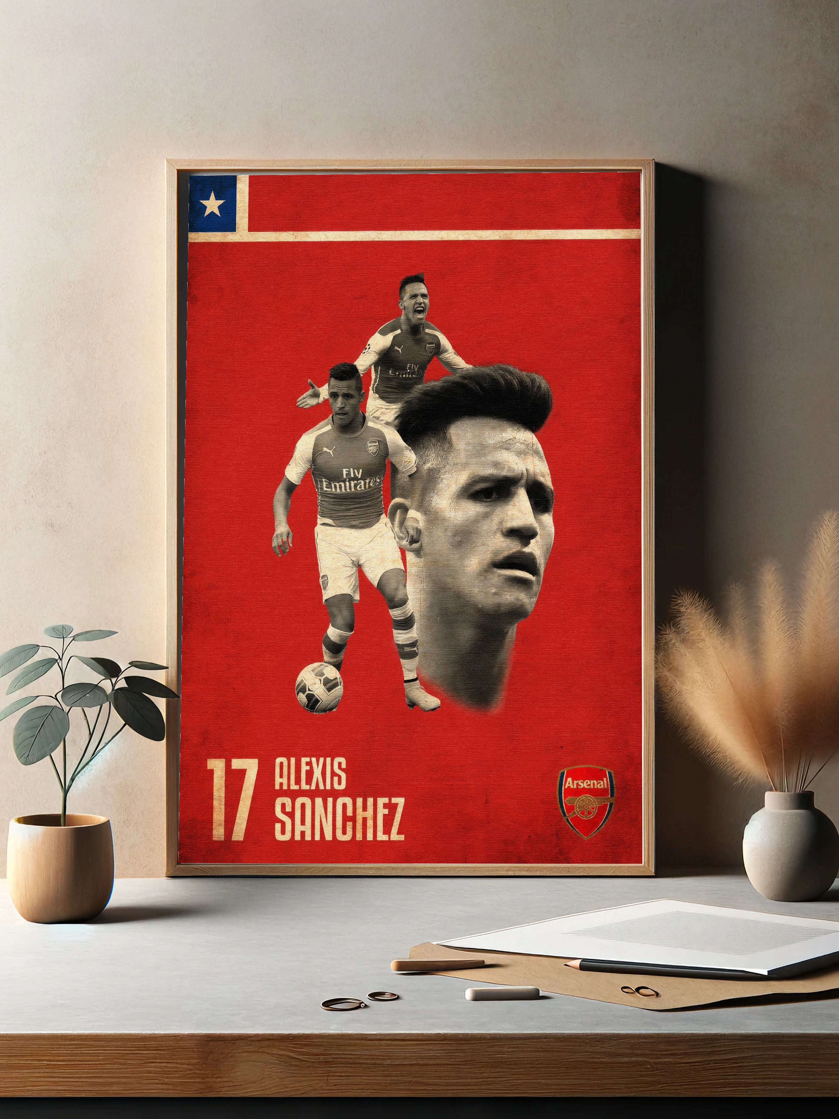 Интерьерное искусство с изображением знаменитого футболиста Алексиса Санчеса в форме Арсенала. Постер выполнен в красных и белых тонах с винтажным оттенком, подчёркивающим страсть и динамику игры. Идеально подходит для гостиной, спортзала или офиса, станет стильным декоративным плакатом для стен.