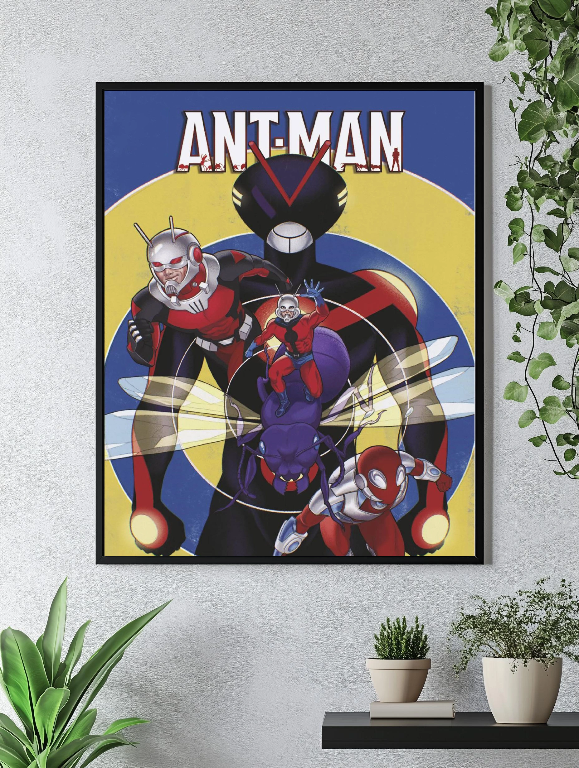 Яркий художественный плакат с изображением известного героя Marvel — Ant-Man. На фоне выделяется стилизованный круг с тёмным силуэтом муравья и несколькими вариациями персонажа в красно-белом костюме. Картина для гостиной и офиса, идеально подходит для современного интерьера, добавляя динамику и стильный декор стен.