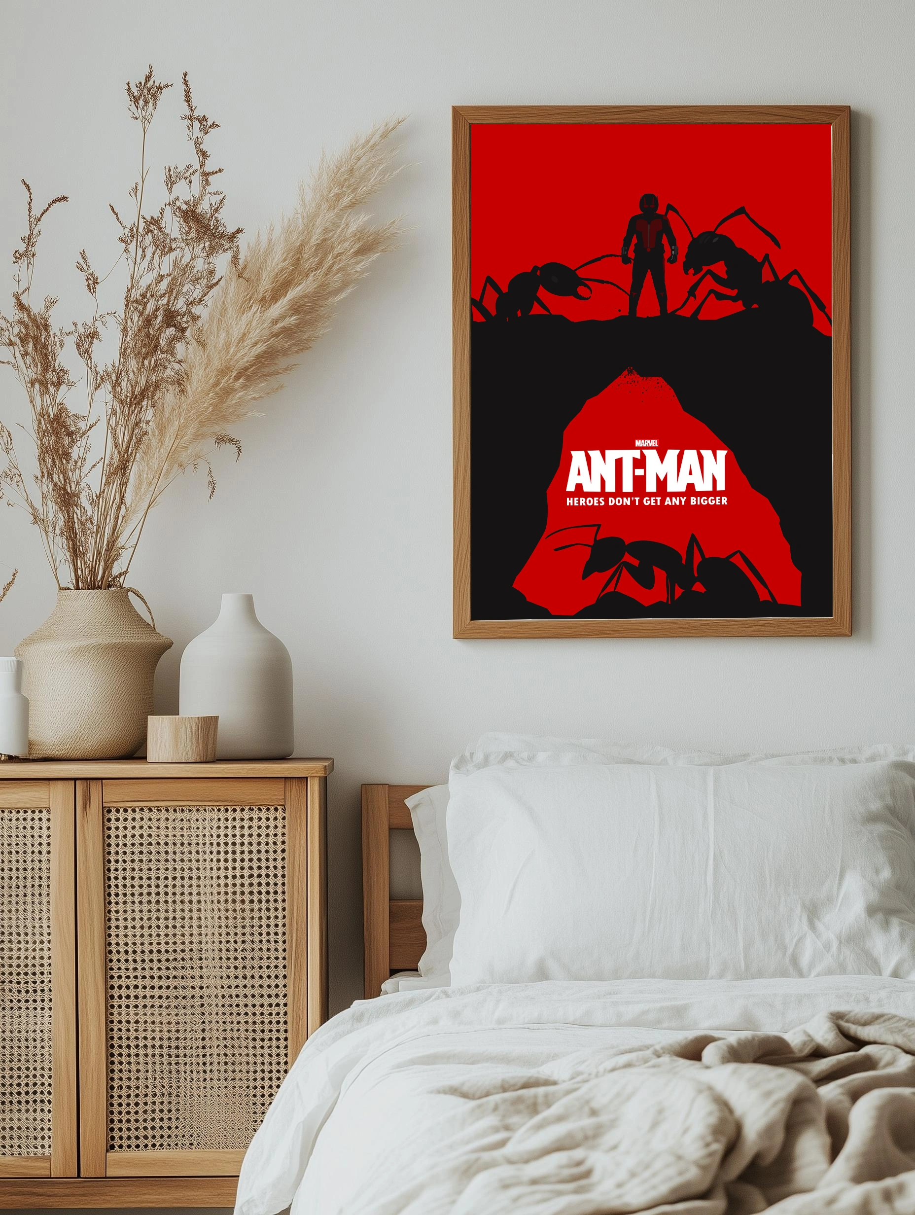 Декоративный плакат с изображением персонажа Marvel — Ant-Man, стоящего на фоне силуэтов муравьев на красно-чёрном фоне. Стиль минималистичный с контрастным сочетанием цветов, что подчёркивает тему масштабов и силы маленького героя. Идеальное современное искусство для стен в гостиной или офисе.