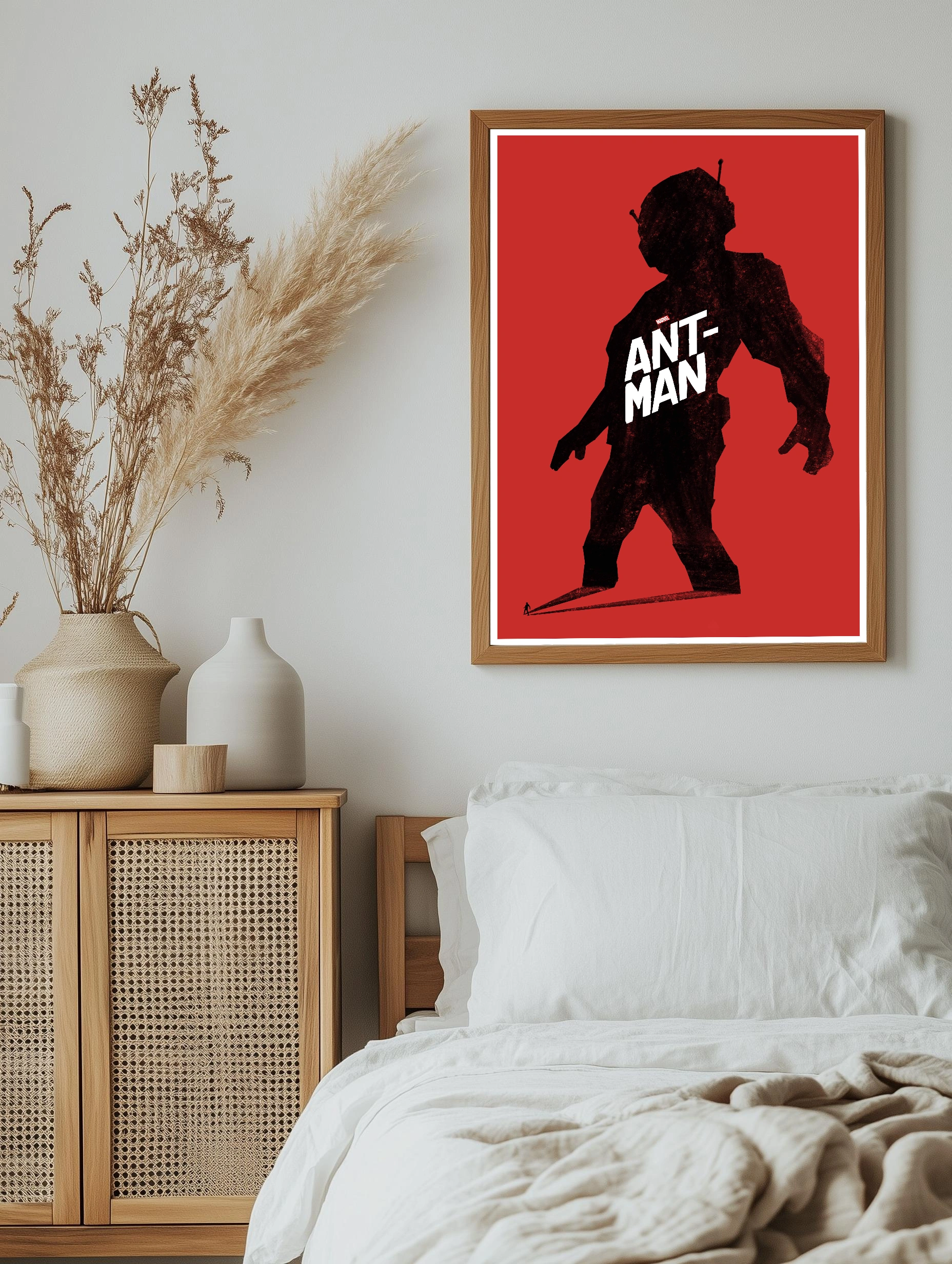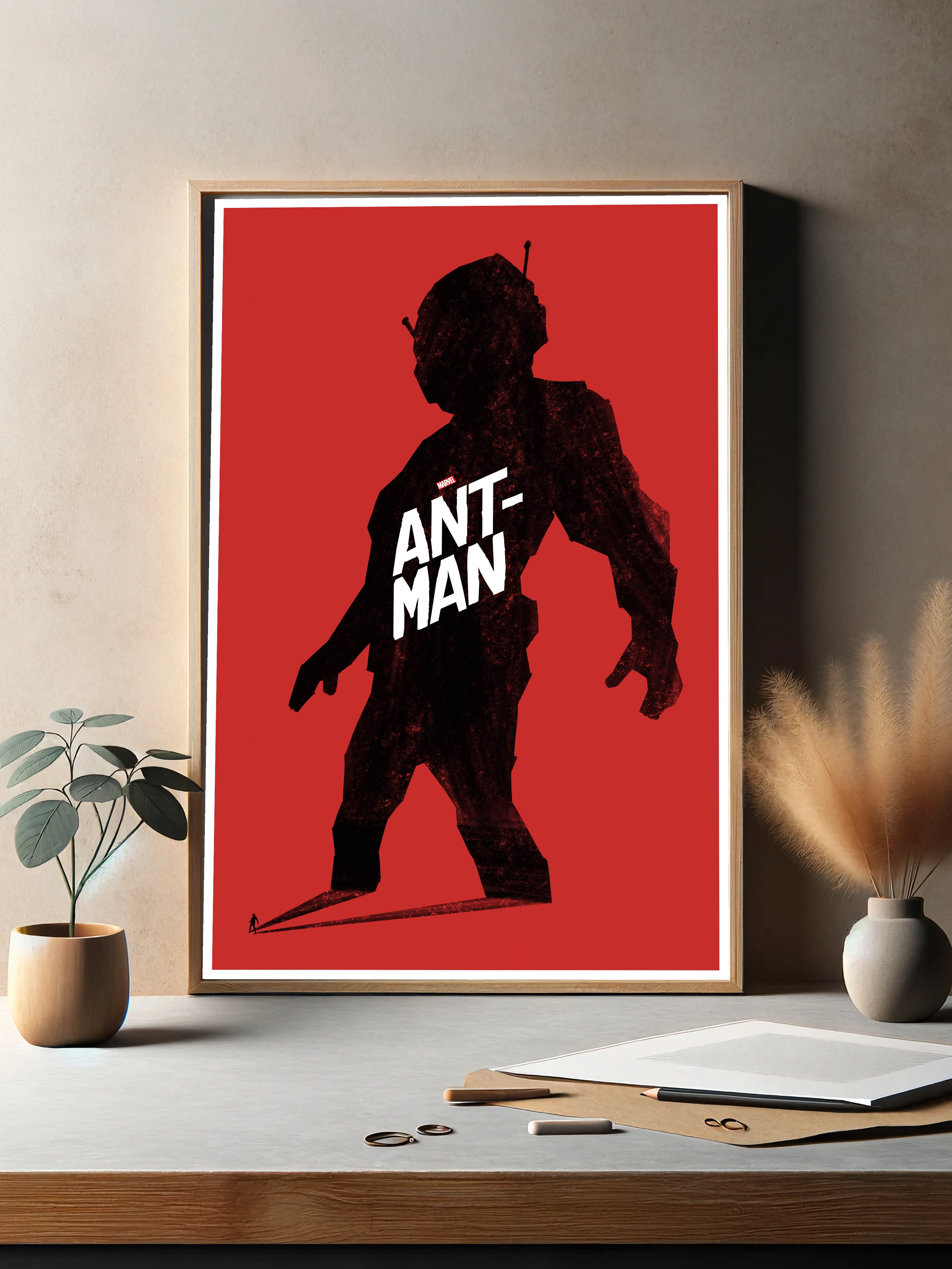 Декоративный плакат с изображением героя Marvel Ant-Man в уникальном стиле. Тёмный силуэт персонажа на насыщенном красном фоне создаёт эффект мощи и загадочности. Этот интерьерный арт идеально впишется в гостиную или офис, добавляя современное искусство для стен и стильный декор.