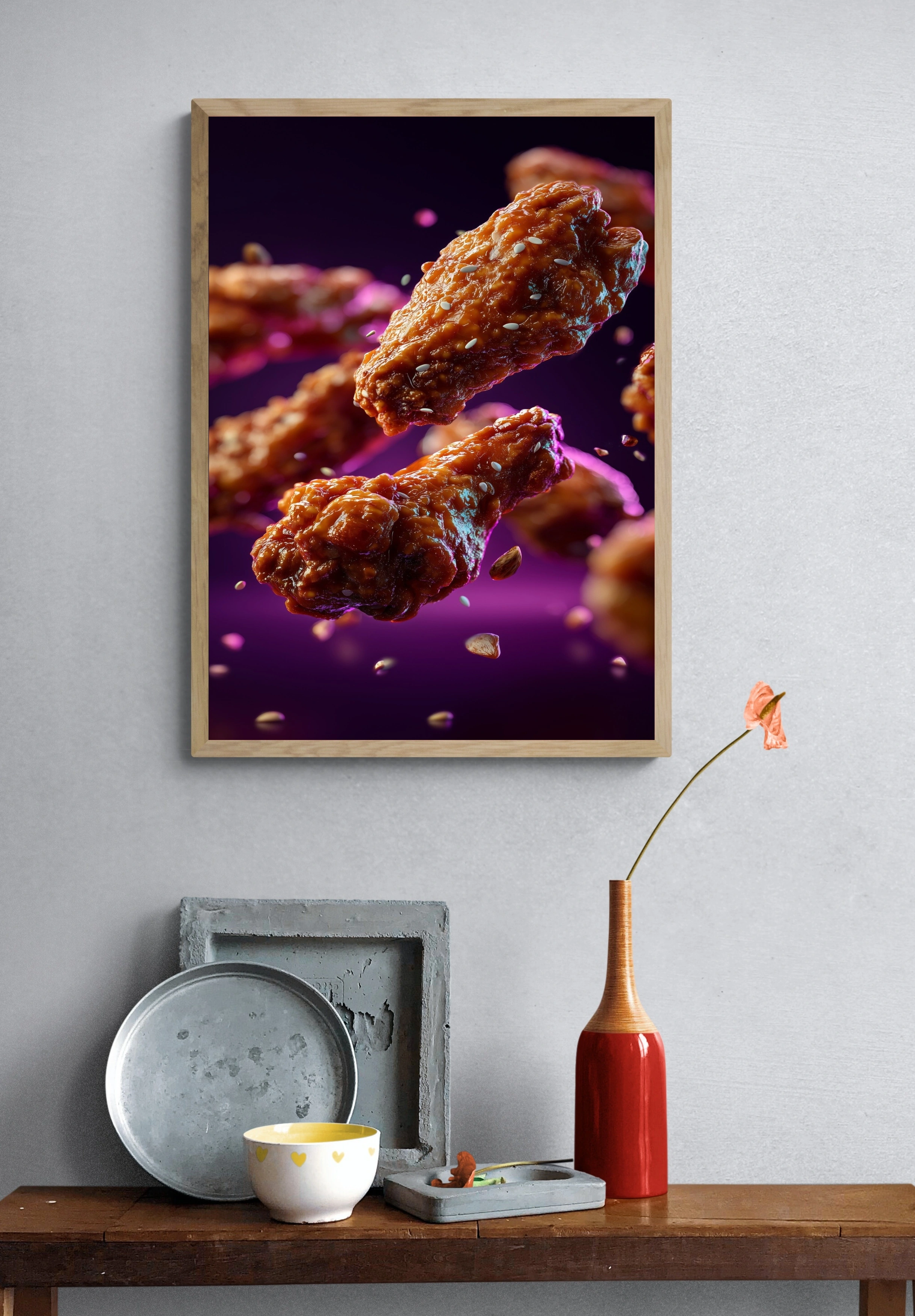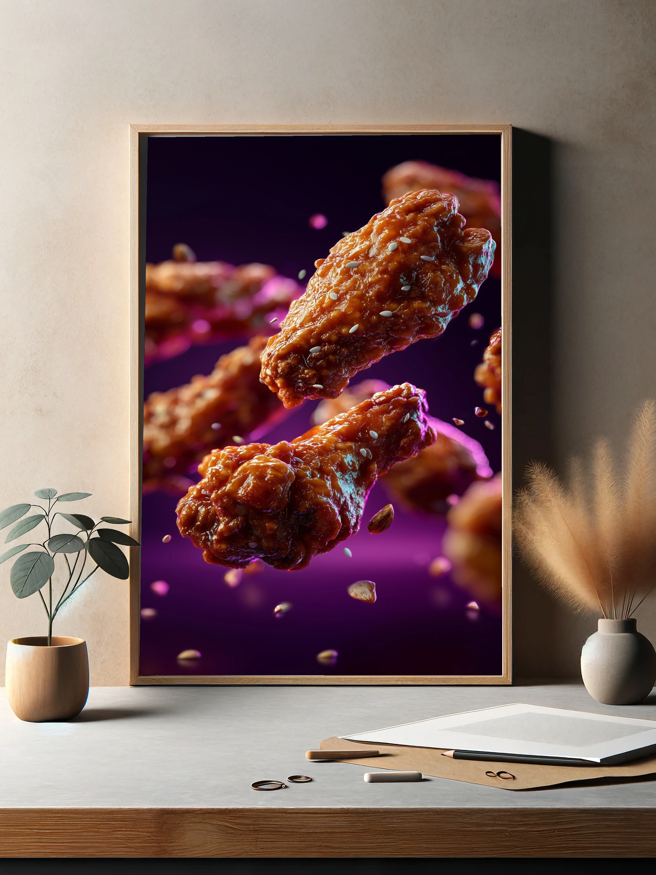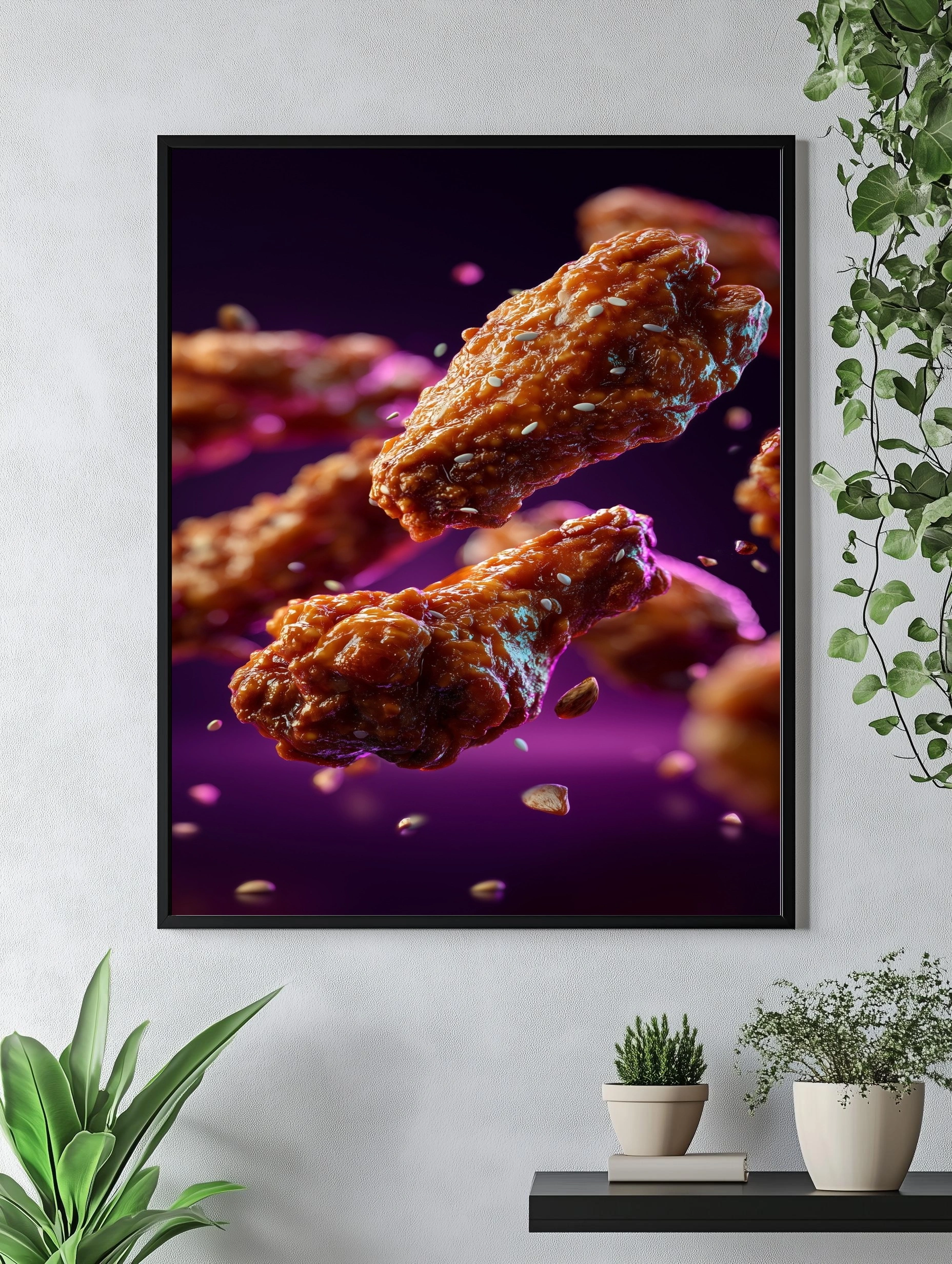 Погрузитесь в мир гастрономического наслаждения с этим ярким постером, на котором изображены аппетитные куриные крылышки, покрытые блестящим соусом. Каждое крылышко выглядит так, будто только что вышло из фритюра: золотисто-коричневый цвет соуса с карамельным оттенком и хрустящая текстура вызывают желание попробовать их немедленно. Вокруг крылышек парят капли соуса и кунжутные семена, создавая динамичную композицию. Фон выполнен в глубоких фиолетовых и розовых тонах, что добавляет яркости и контраста, подчеркивая аппетитность блюда. Этот постер станет отличным акцентом в кухне, столовой или кафе, привлекая внимание гурманов и любителей вкусной еды. Идеален для молодежной аудитории, семей и всех, кто ценит кулинарное искусство.