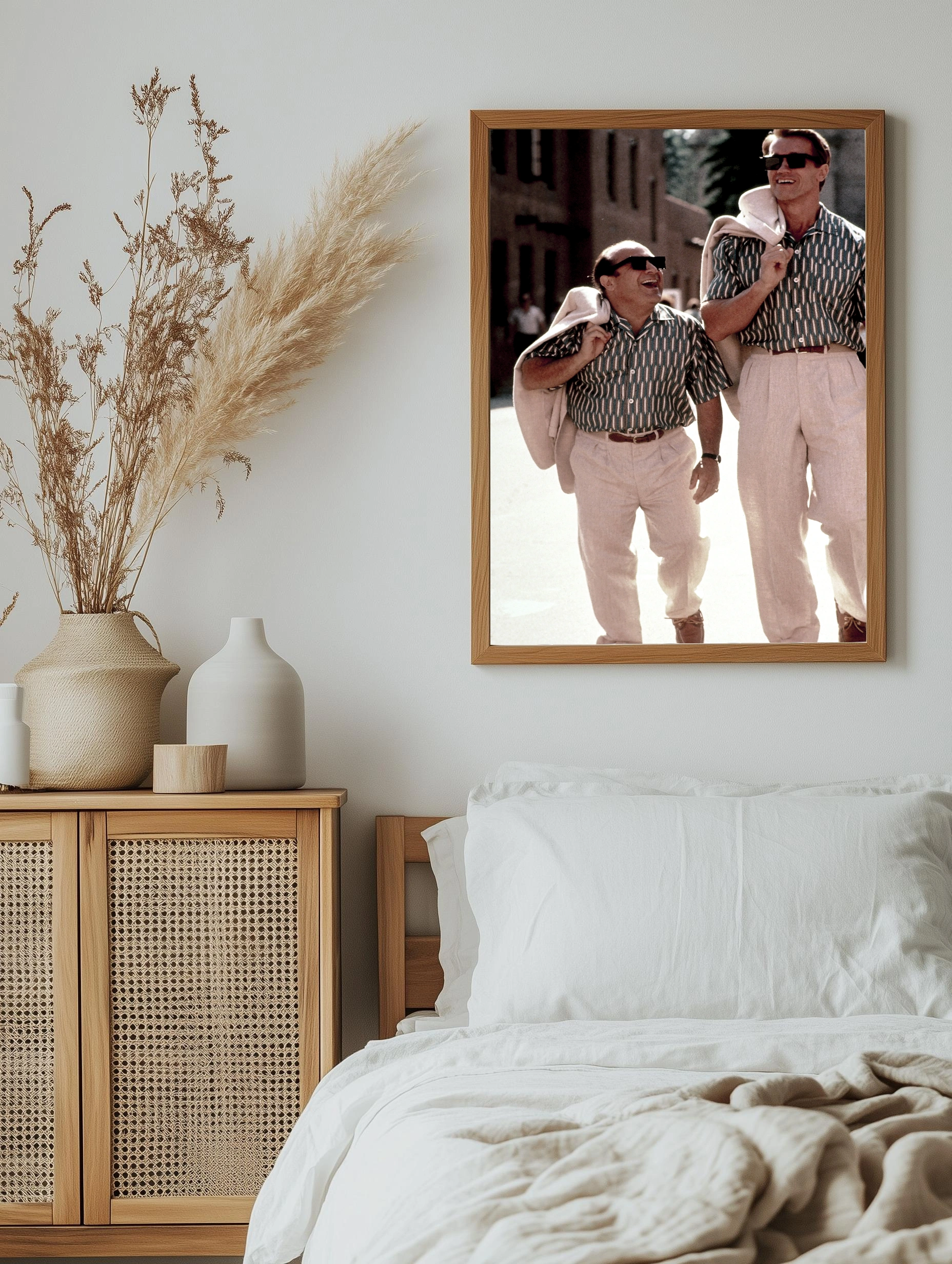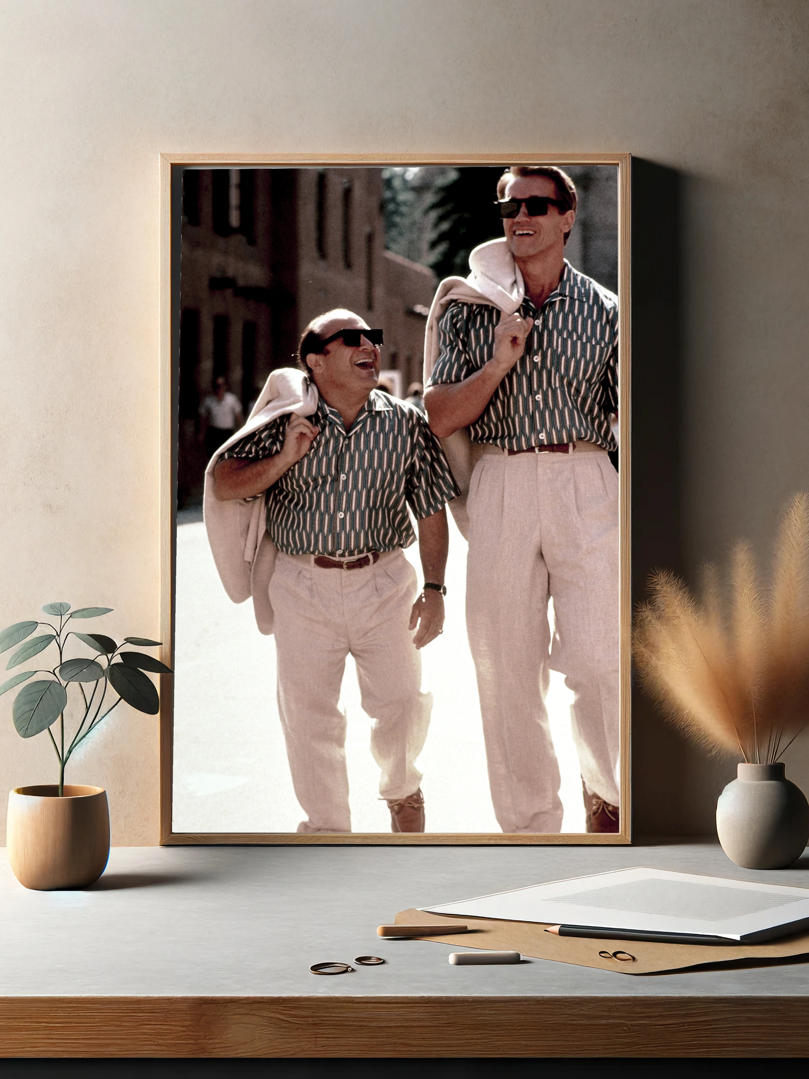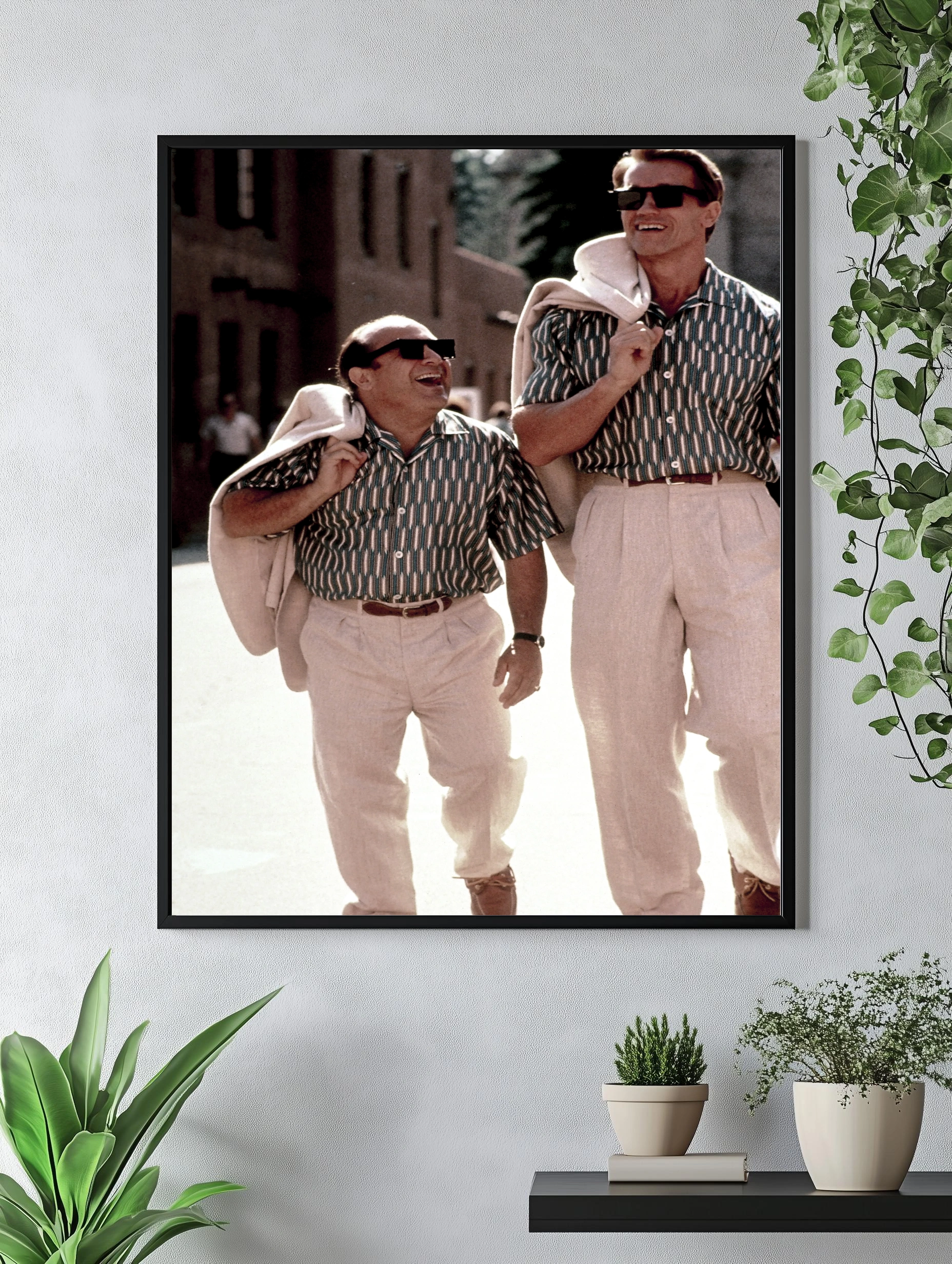 На изображении запечатлена культовая сцена из фильма с участием Арнольда Шварценеггера и Дэнни Де Вито. Они одеты в идентичные рубашки и светлые брюки, несут пиджаки через плечо, улыбаются и выглядят расслабленно. Это интерьерный постер с атмосферой лета и легкости, подходящий для декора гостиной или офиса.