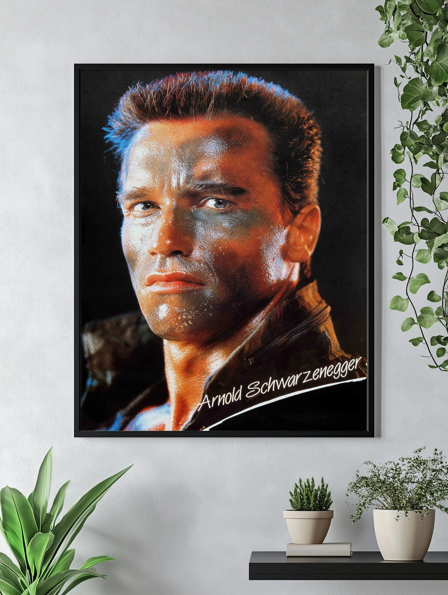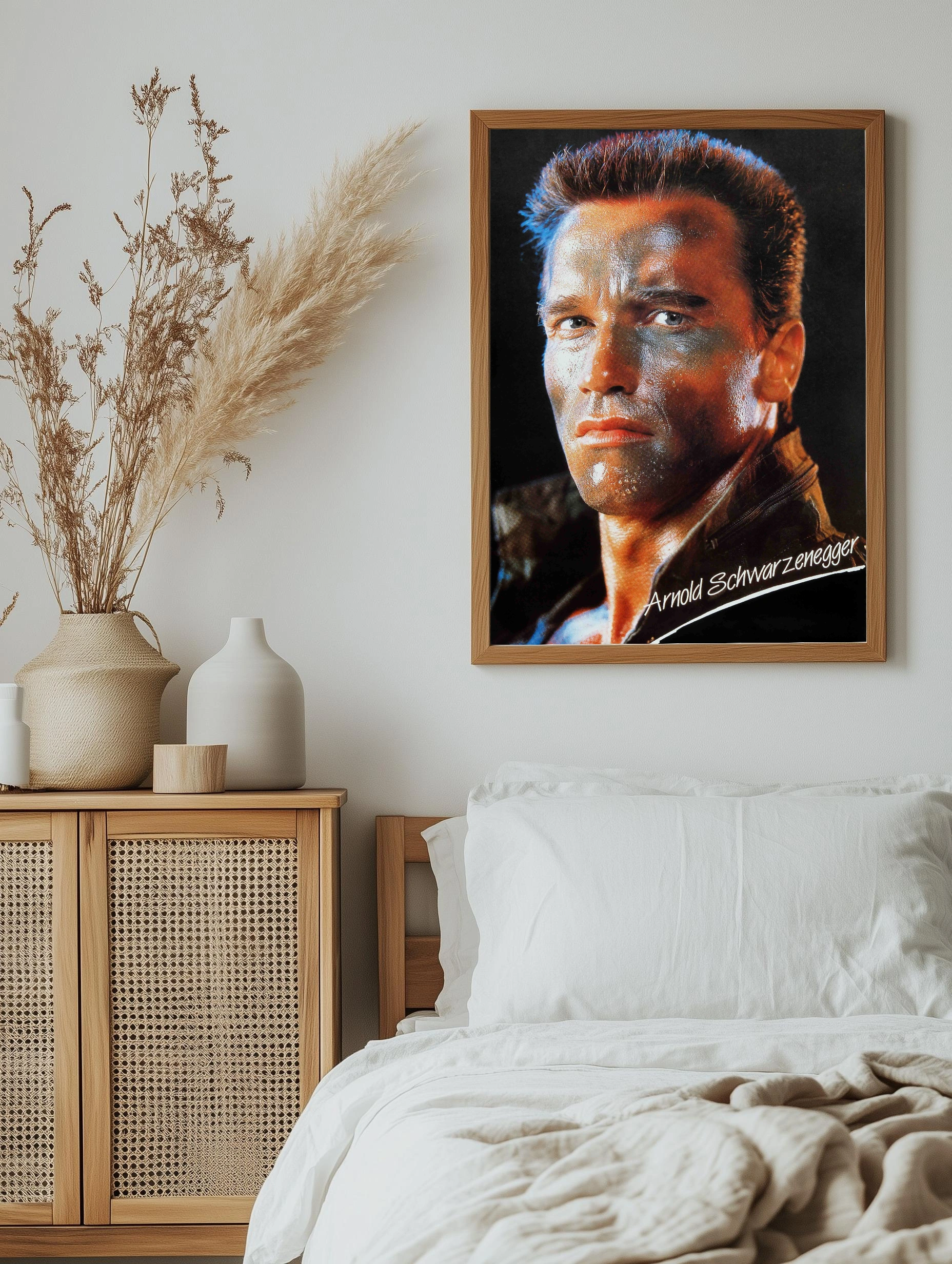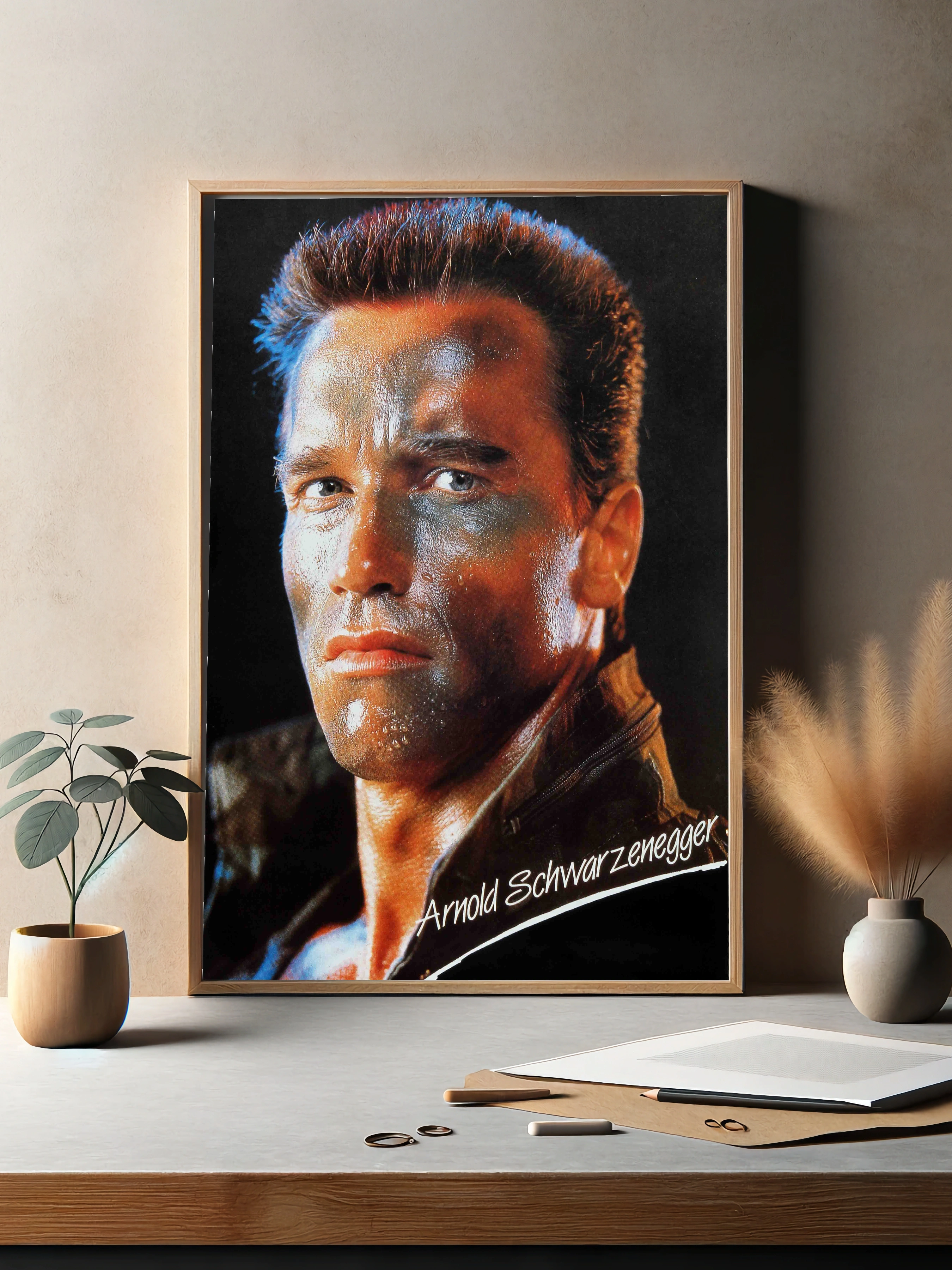 На изображении представлен портрет Арнольда Шварценеггера с сосредоточенным выражением лица, покрытого каплями пота. Фотография выполнена с высокой детализацией, подчёркивая мужественность и силу актёра. Это интерьерное искусство для стен с уникальным художественным плакатом, отлично подходящим для гостиной или офиса.