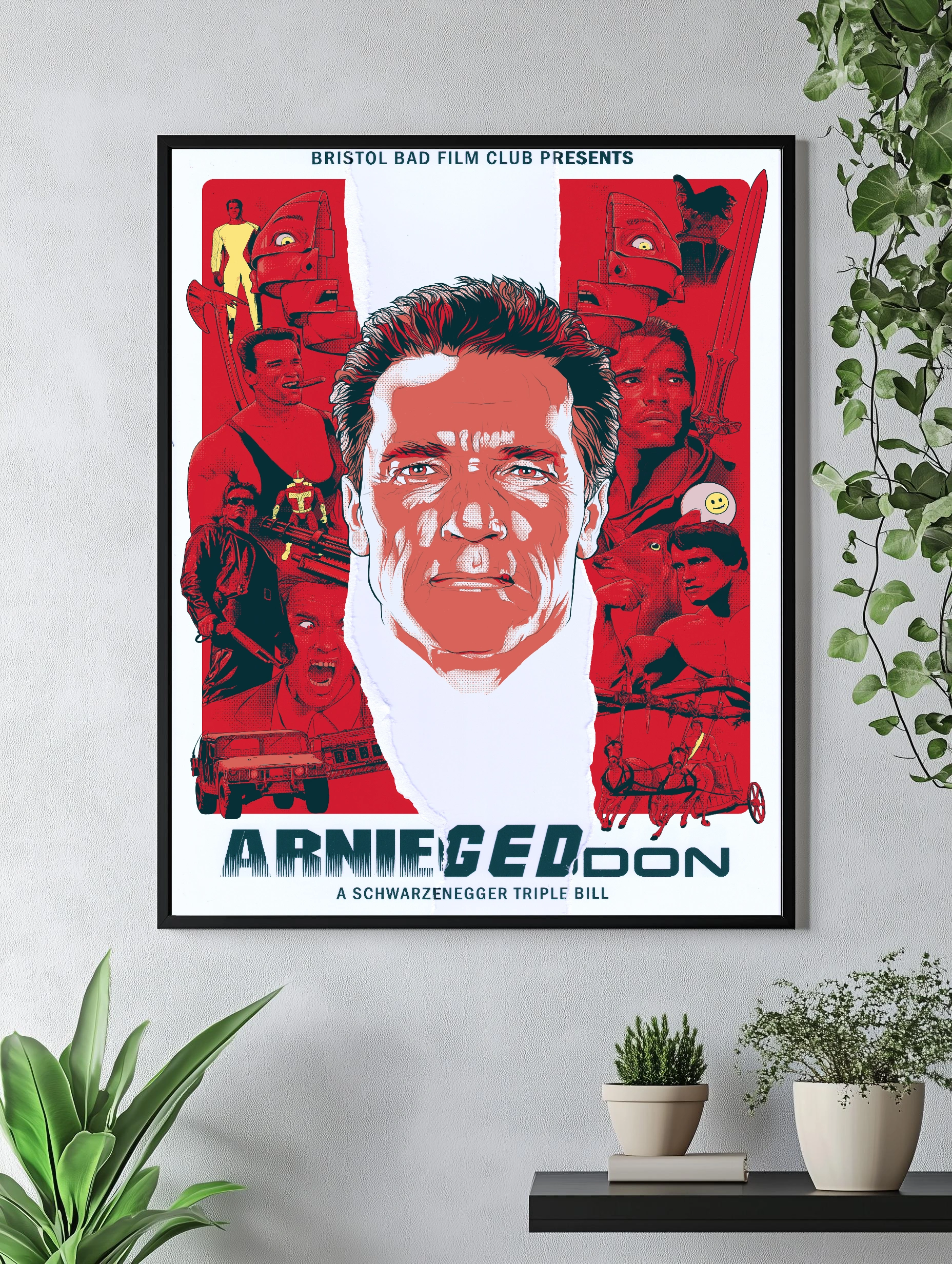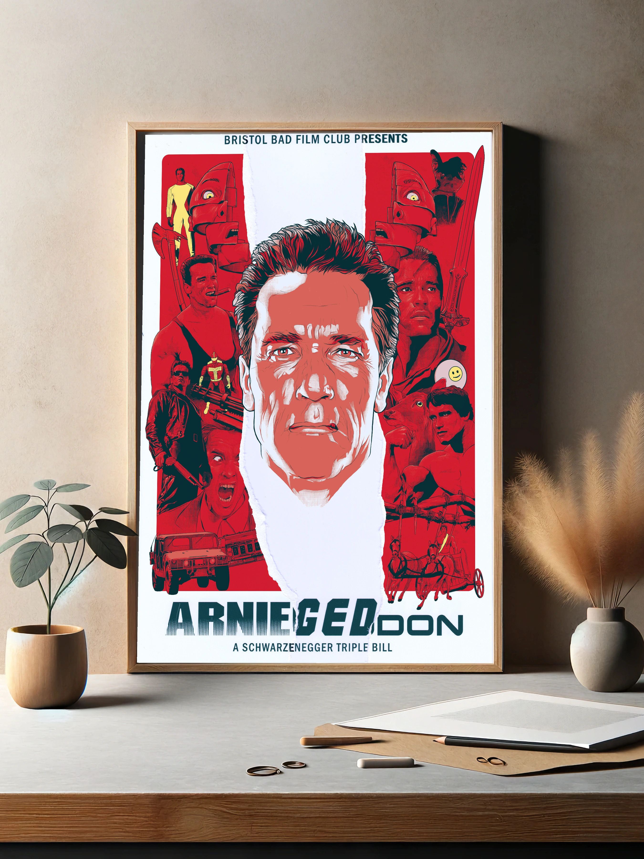 Яркая картина с изображением Арнольда Шварценеггера в центре, на фоне выдержанных в красных тонах силуэтов героев и сцен из его самых знаменитых фильмов. Этот интерьерный постер на холсте подчеркнет уникальность и стиль любого пространства, будет отличным декоративным элементом в гостиной или офисе. Художественный плакат объединяет кинематографическую тему и современное искусство для стен.
