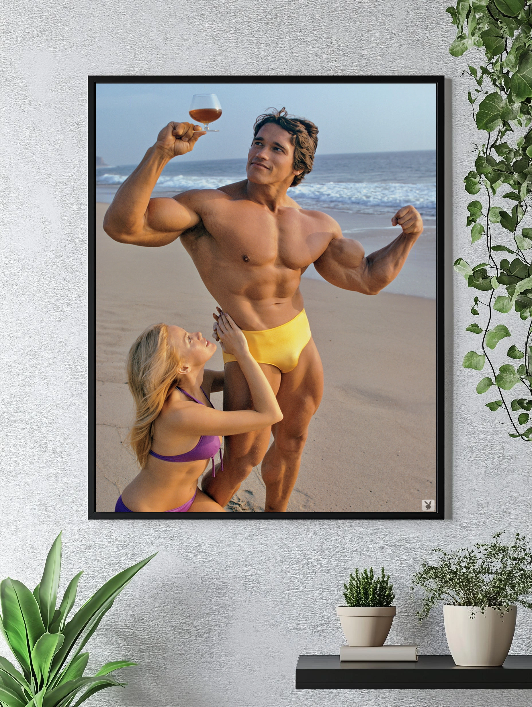 На изображении представлен известный актер и культурист Арнольд Шварценеггер в возрасте молодости, стоящий на пляже в жёлтых плавках и демонстрирующий мускулы. Рядом с ним женщина в фиолетовом купальнике, которая восхищённо смотрит на него. Фон — море с волнением и песчаный пляж. Это художественный интерьерный постер, подходящий для декора современного жилого или рабочего пространства.
