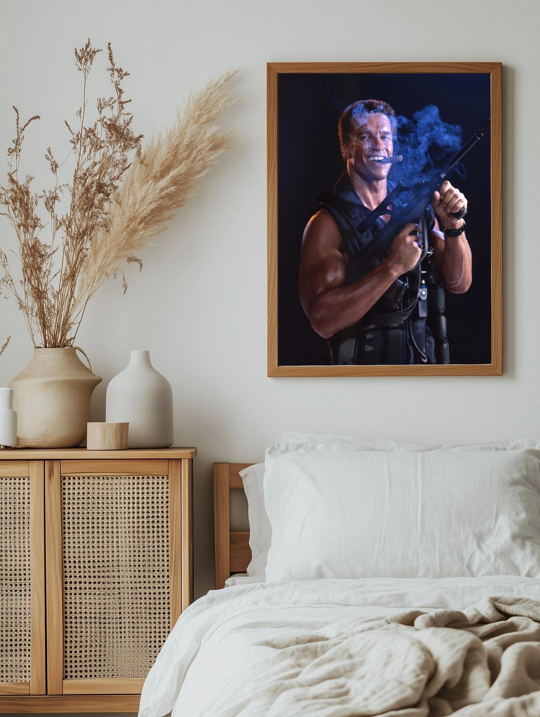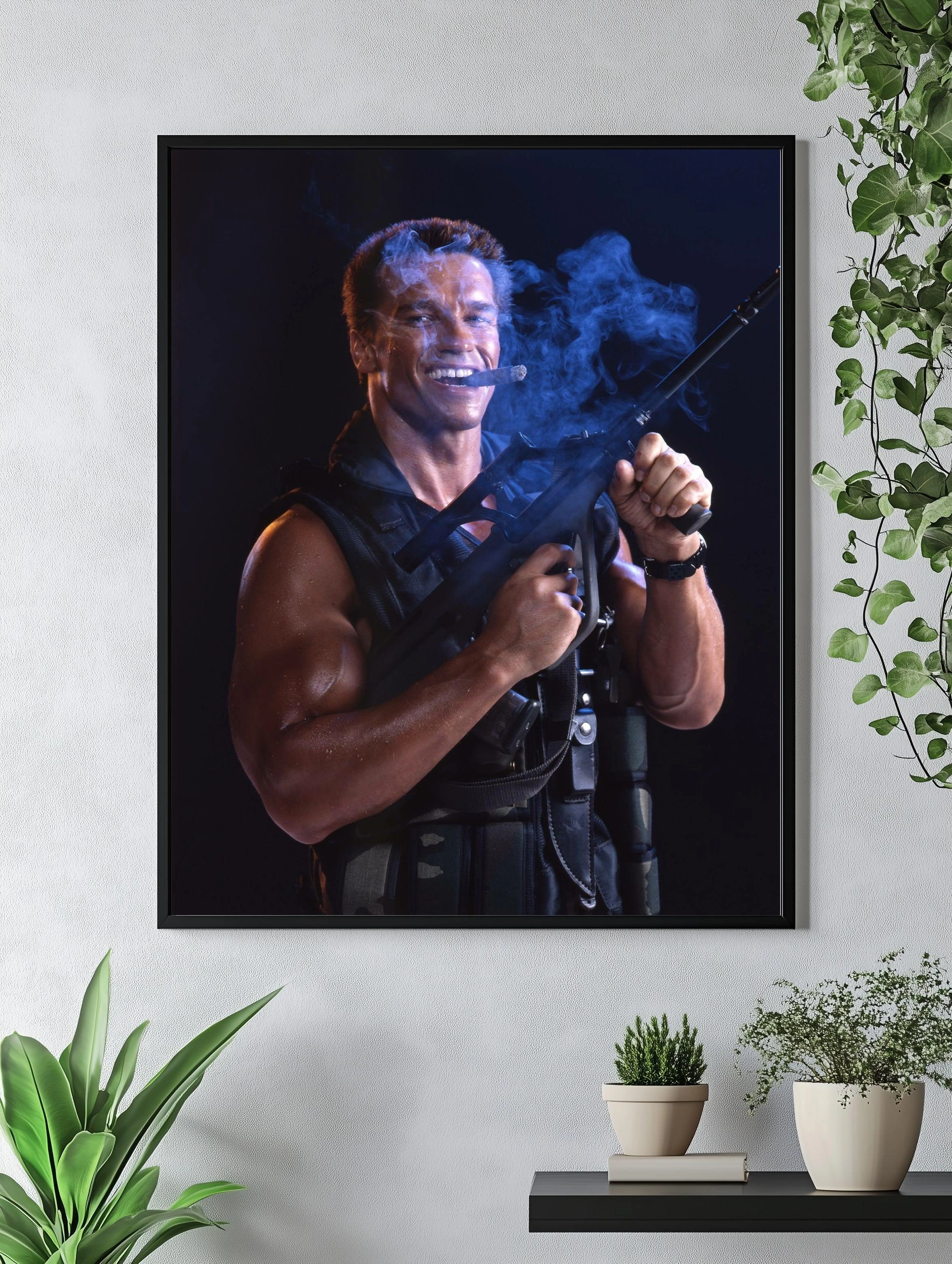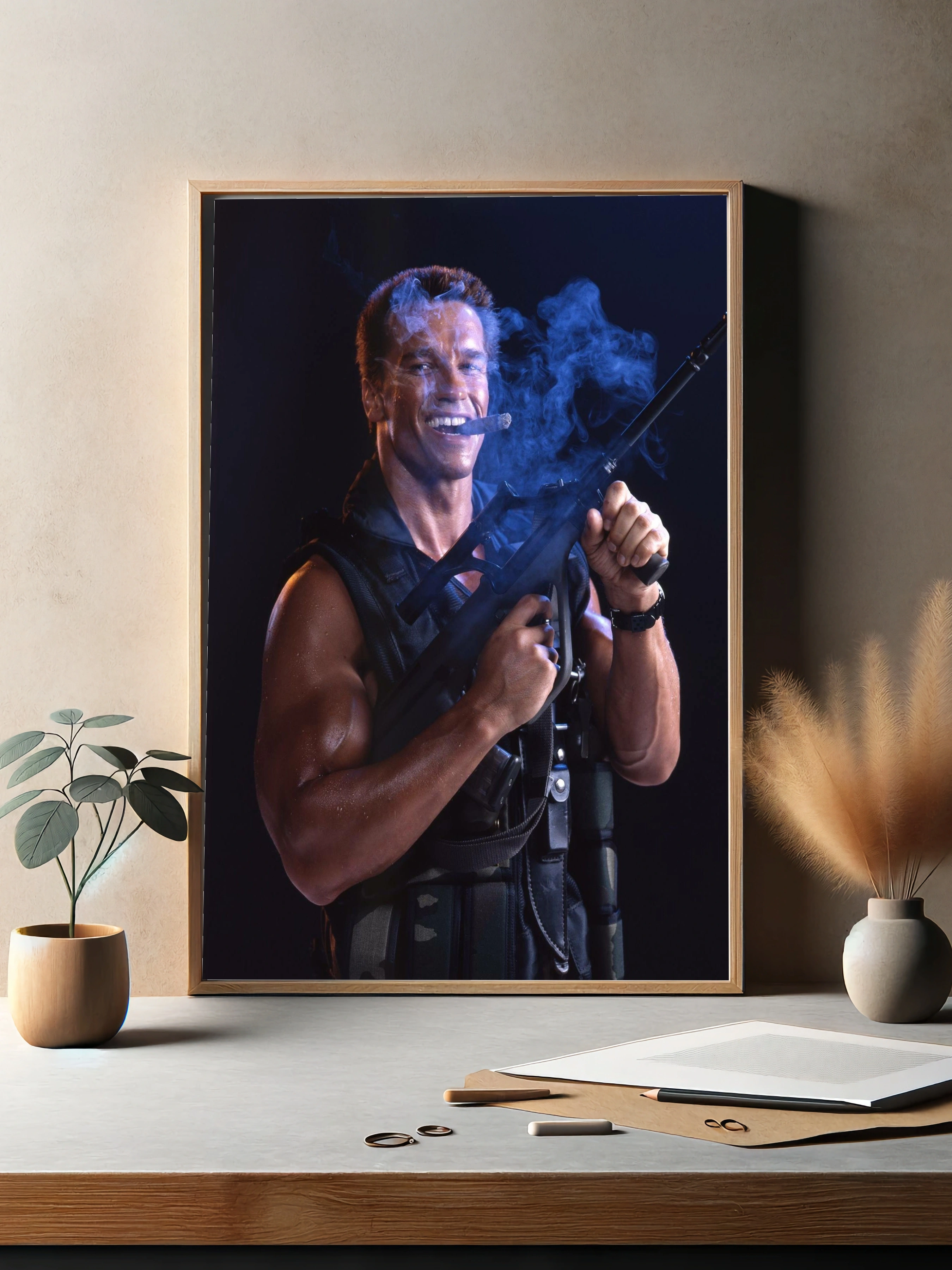 Изображение культового актёра Арнольда Шварценеггера в образе боевого героя с сигарой и автоматом. Атмосфера силы и харизмы, с дымом, создающим динамичное настроение. Отличный интерьерный арт для поклонников классики боевиков и современного искусства для стен.
