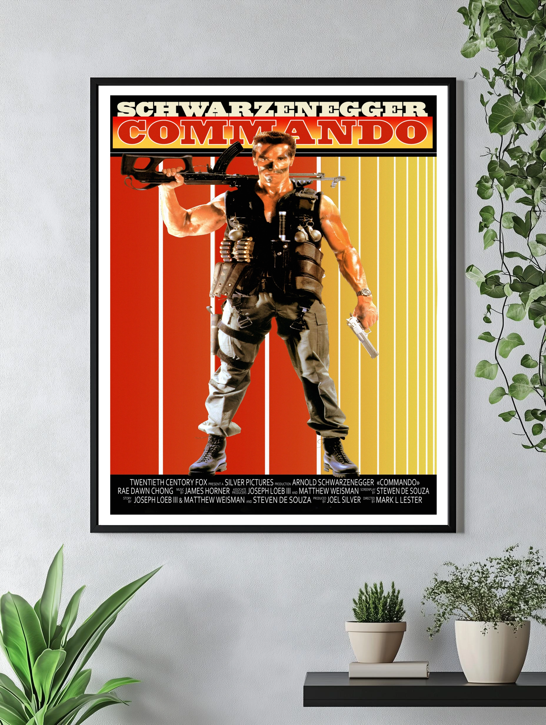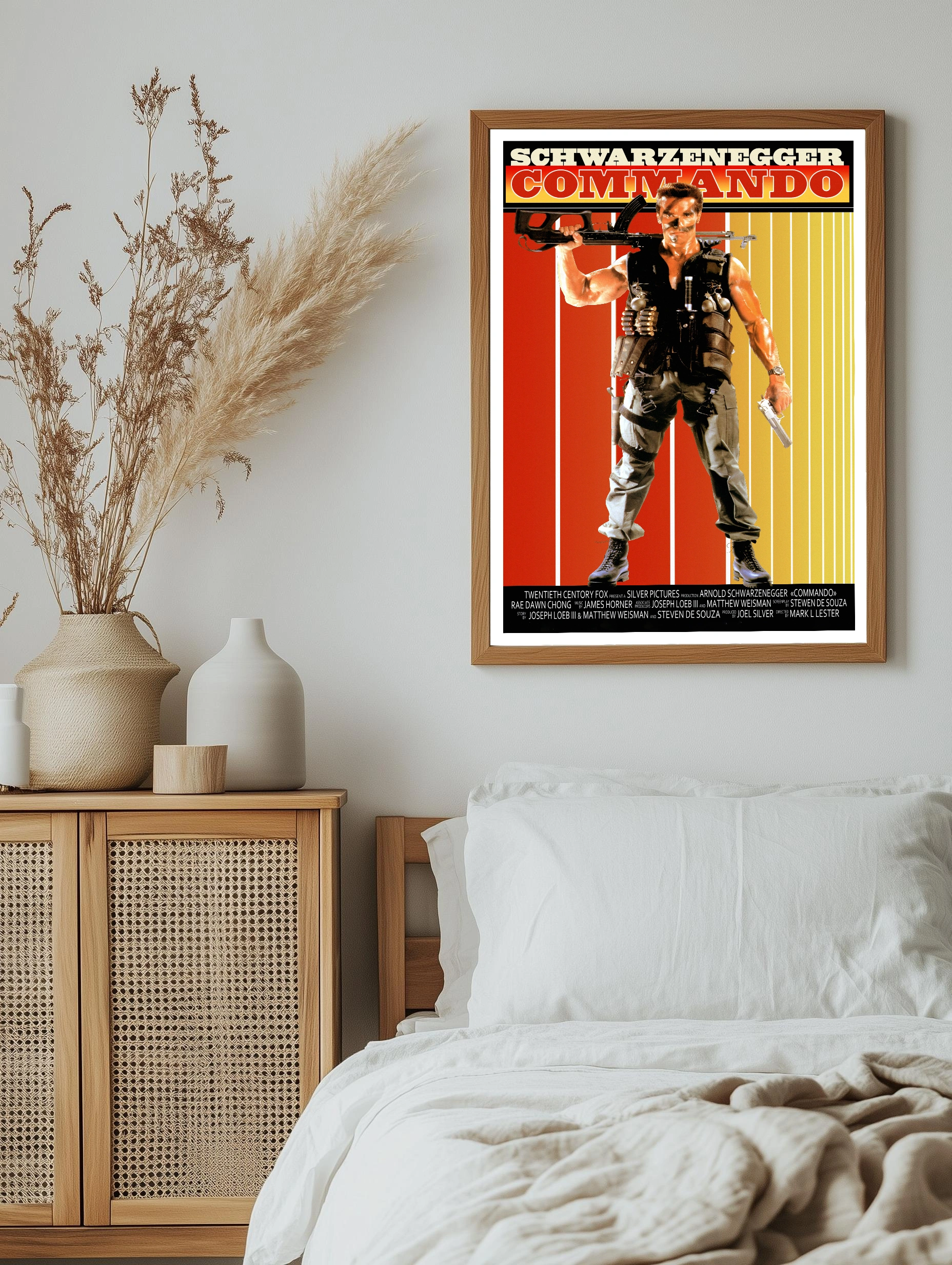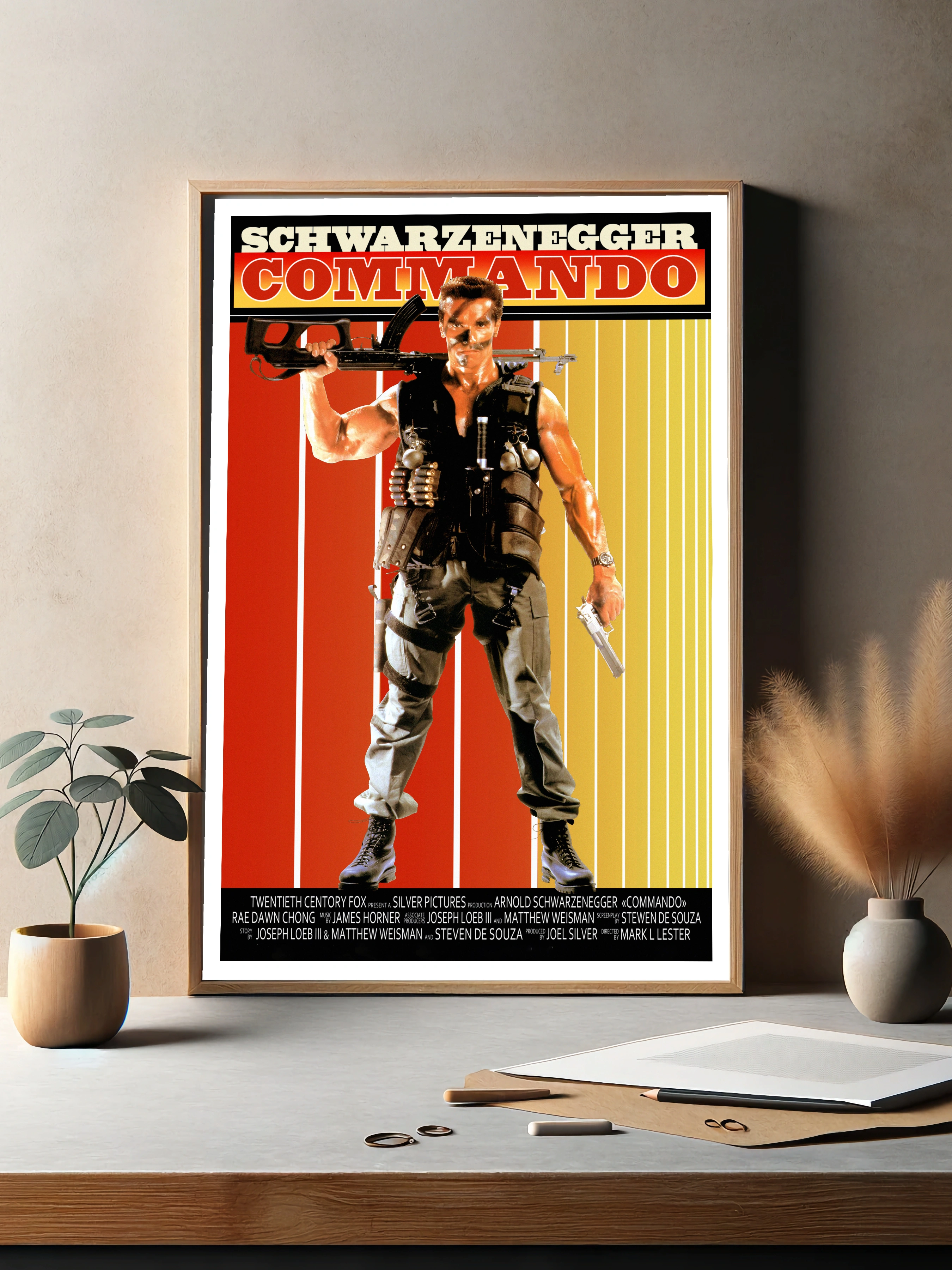 На изображении представлен Арнольд Шварценеггер в роли героя боевика «Коммандо». Он стоит в полный рост с оружием, демонстрируя силу и решительность. Яркий контраст красного и жёлтого фона подчёркивает драматизм и динамику образа. Этот интерьерный декоративный плакат идеально подчеркнёт атмосферу домашнего кинотеатра или гостиной.