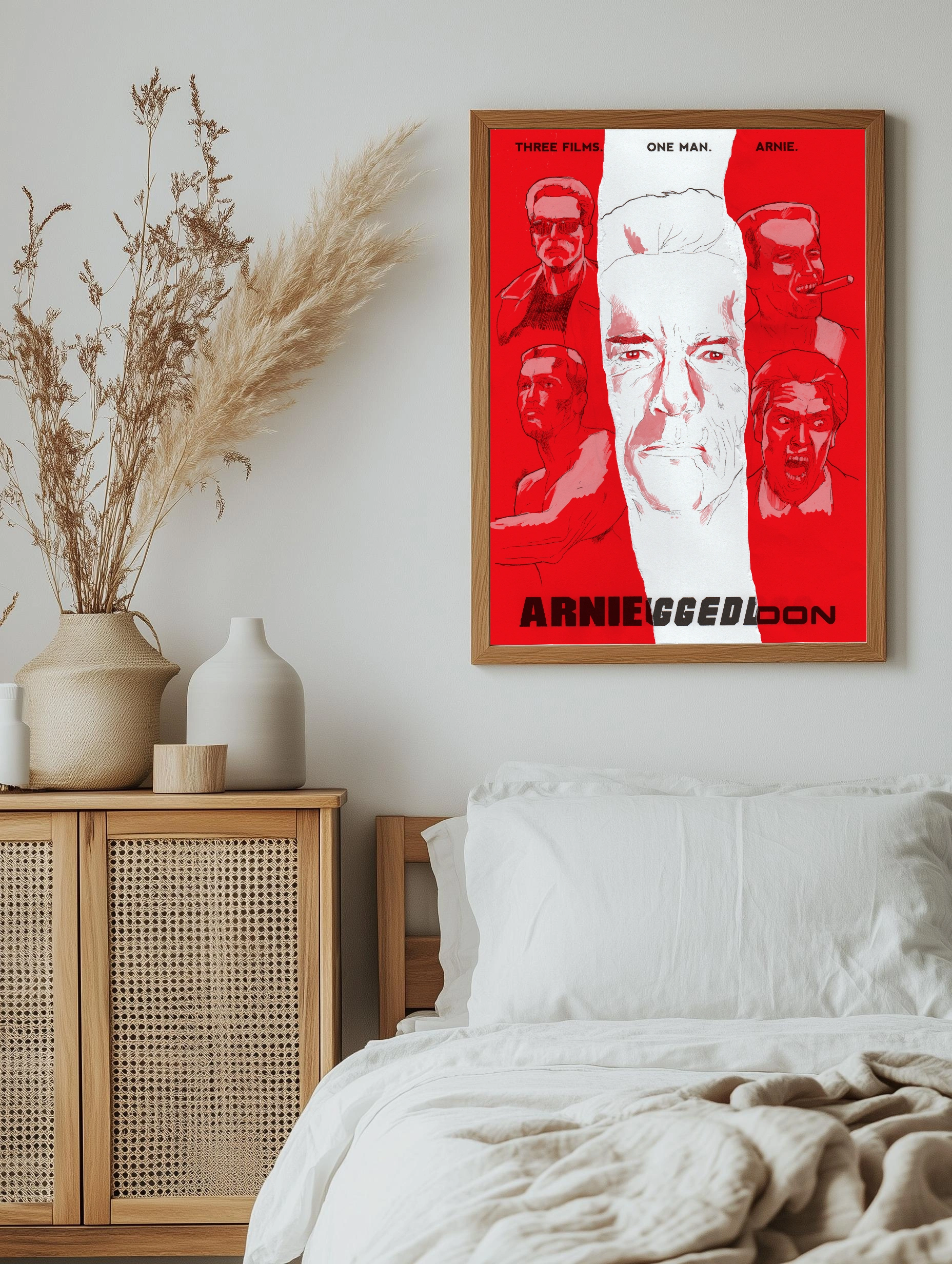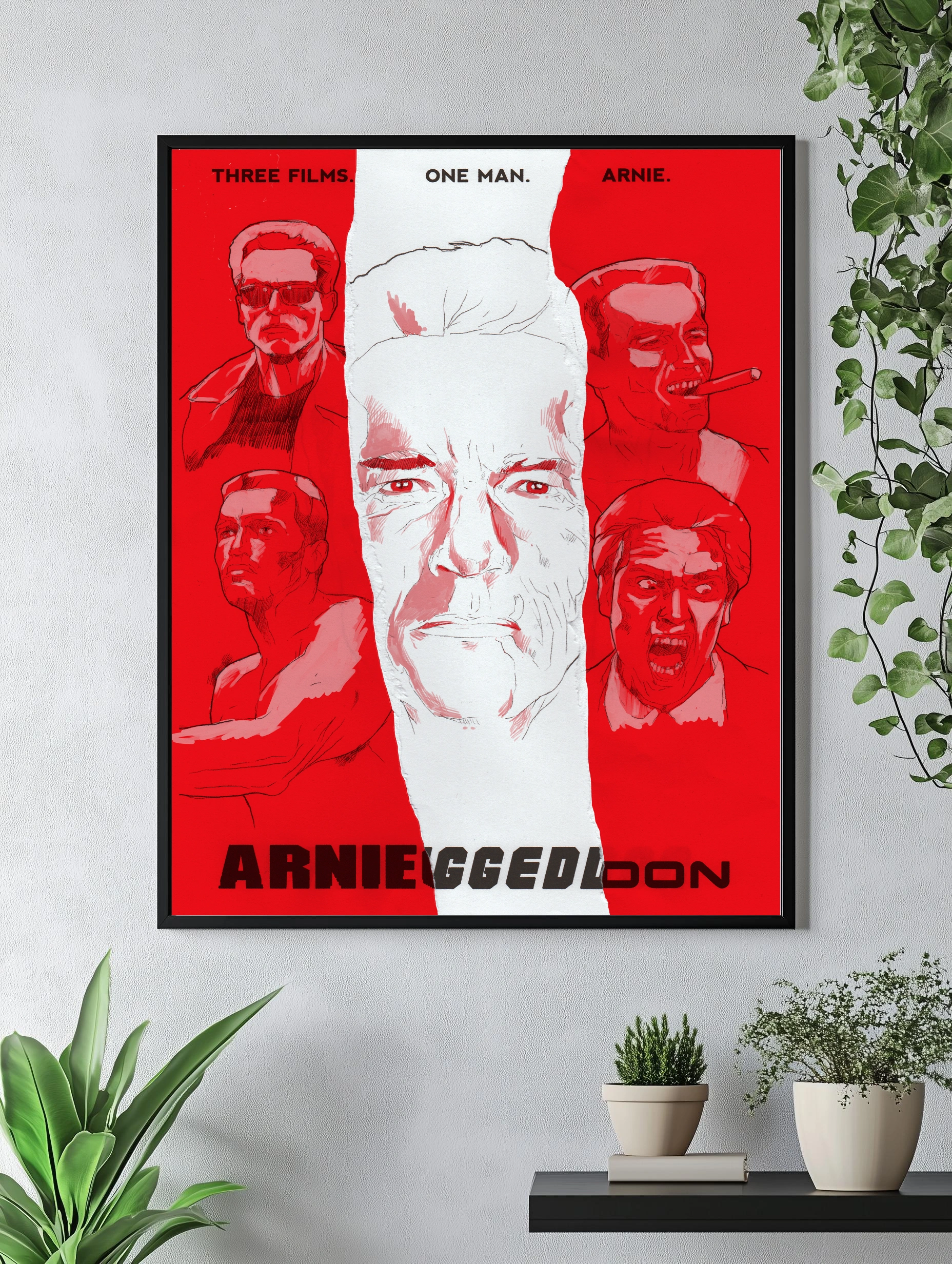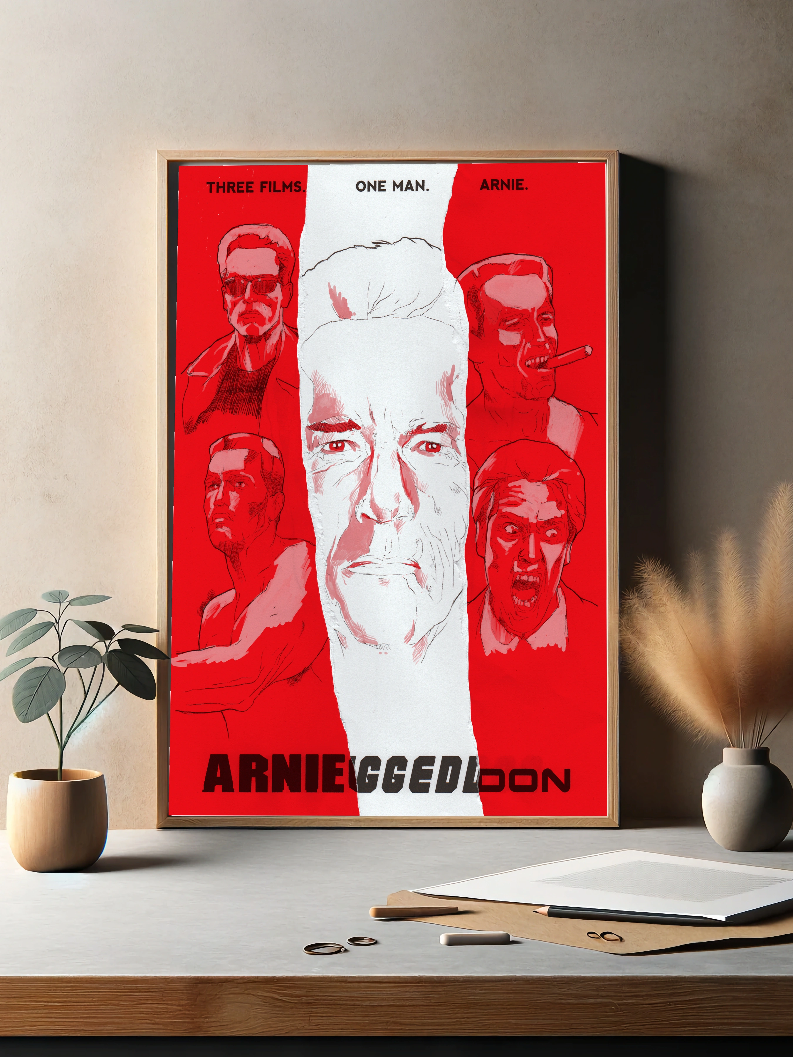 Этот интерьерный постер с изображением Арнольда Шварценеггера выполнен в минималистичном стиле с ярким преобладанием красного и белого цветов. Центральный крупный портрет актера окружён пятью меньшими изображениями из его знаковых фильмов, создавая уникальный декоративный плакат для стен. Такой художественный плакат — стильный декор стен для гостиной или офиса.