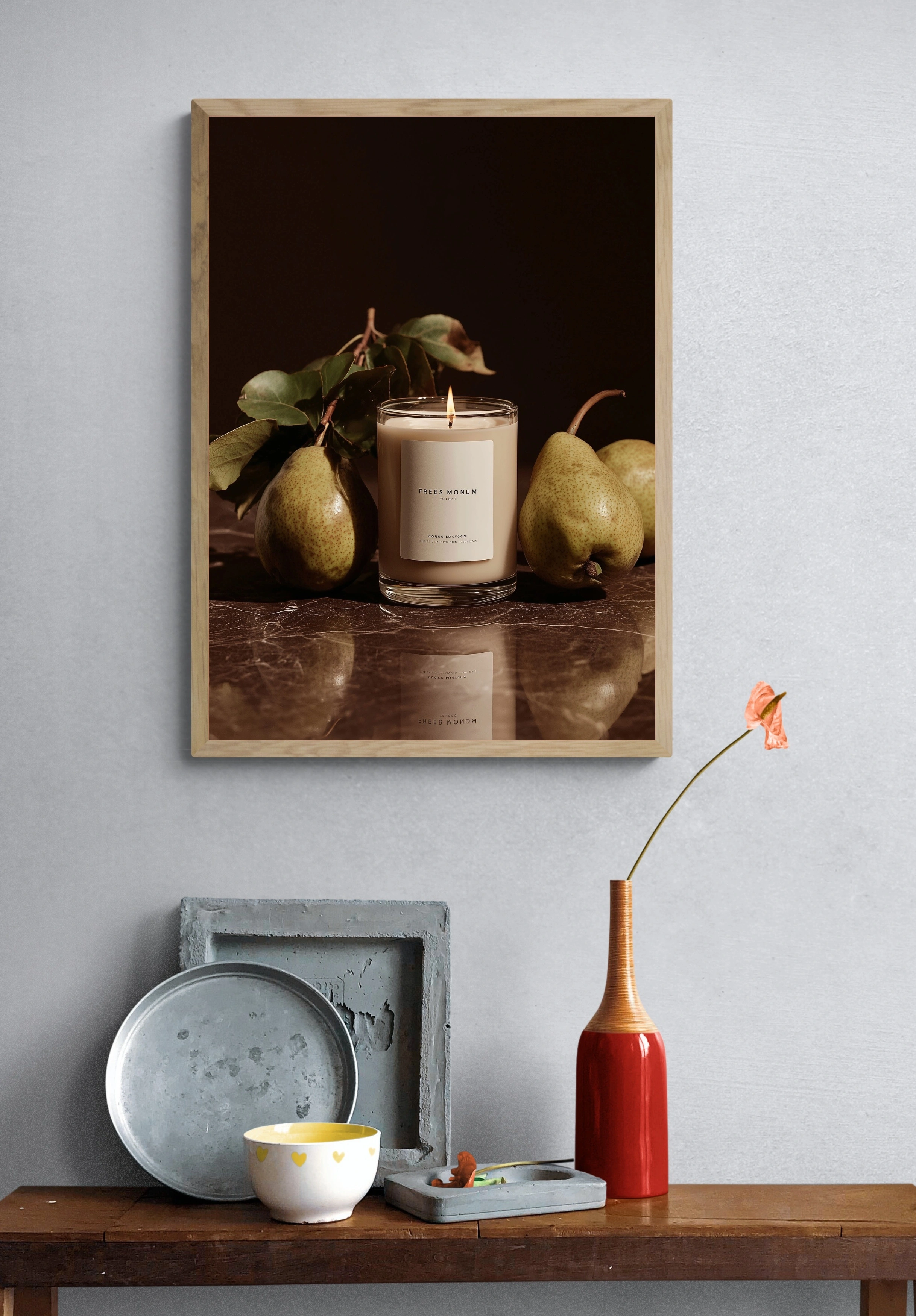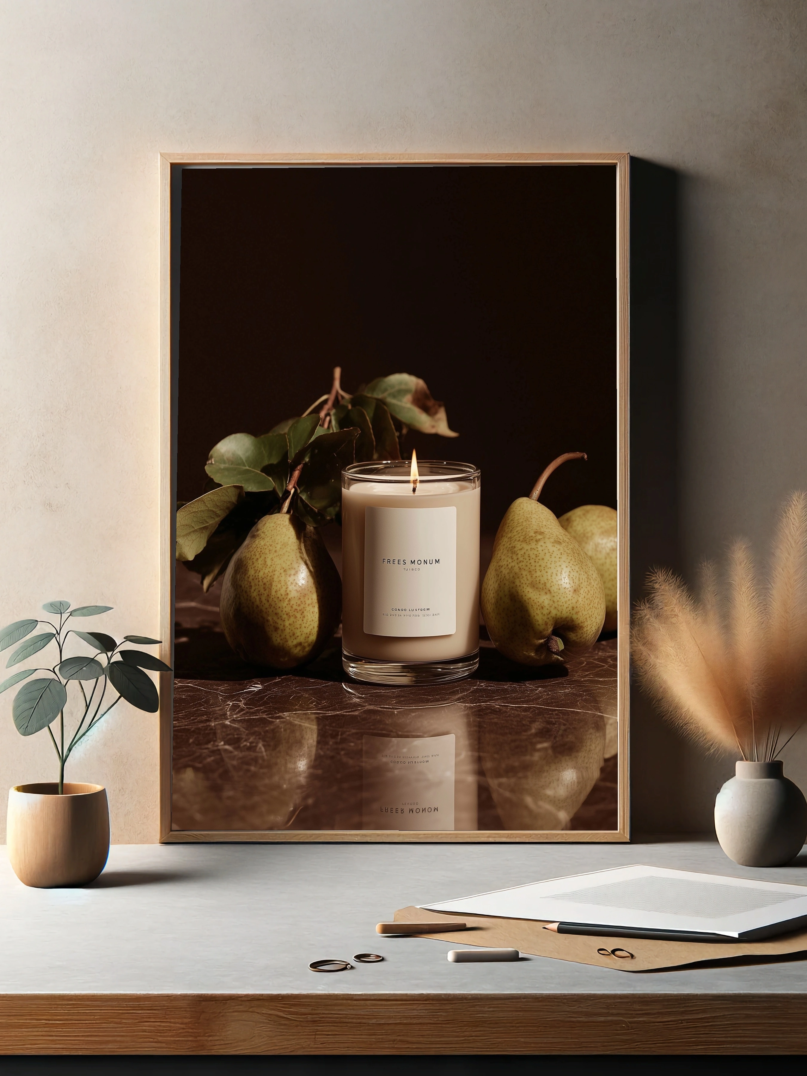 Погрузитесь в атмосферу уюта с этой изысканной ароматической свечой от бренда FREES MONUM. На фоне глубокого черного цвета, свеча с нежным кремовым воском и аккуратной этикеткой создает ощущение элегантности. Рядом с ней расположены свежие груши, подчеркивающие натуральность и свежесть аромата. Листья добавляют зелени и живости в композицию, создавая гармонию с природой. Цветовая гамма включает теплые кремовые и зеленые оттенки, что делает этот постер идеальным для создания уютной атмосферы в вашем доме. Стиль — минимализм, который дарит спокойствие и умиротворение. Подходит для гостиной, спальни или даже офиса, где важно создать комфортное пространство. Целевая аудитория — молодые люди и семьи, ценящие стиль и качество.