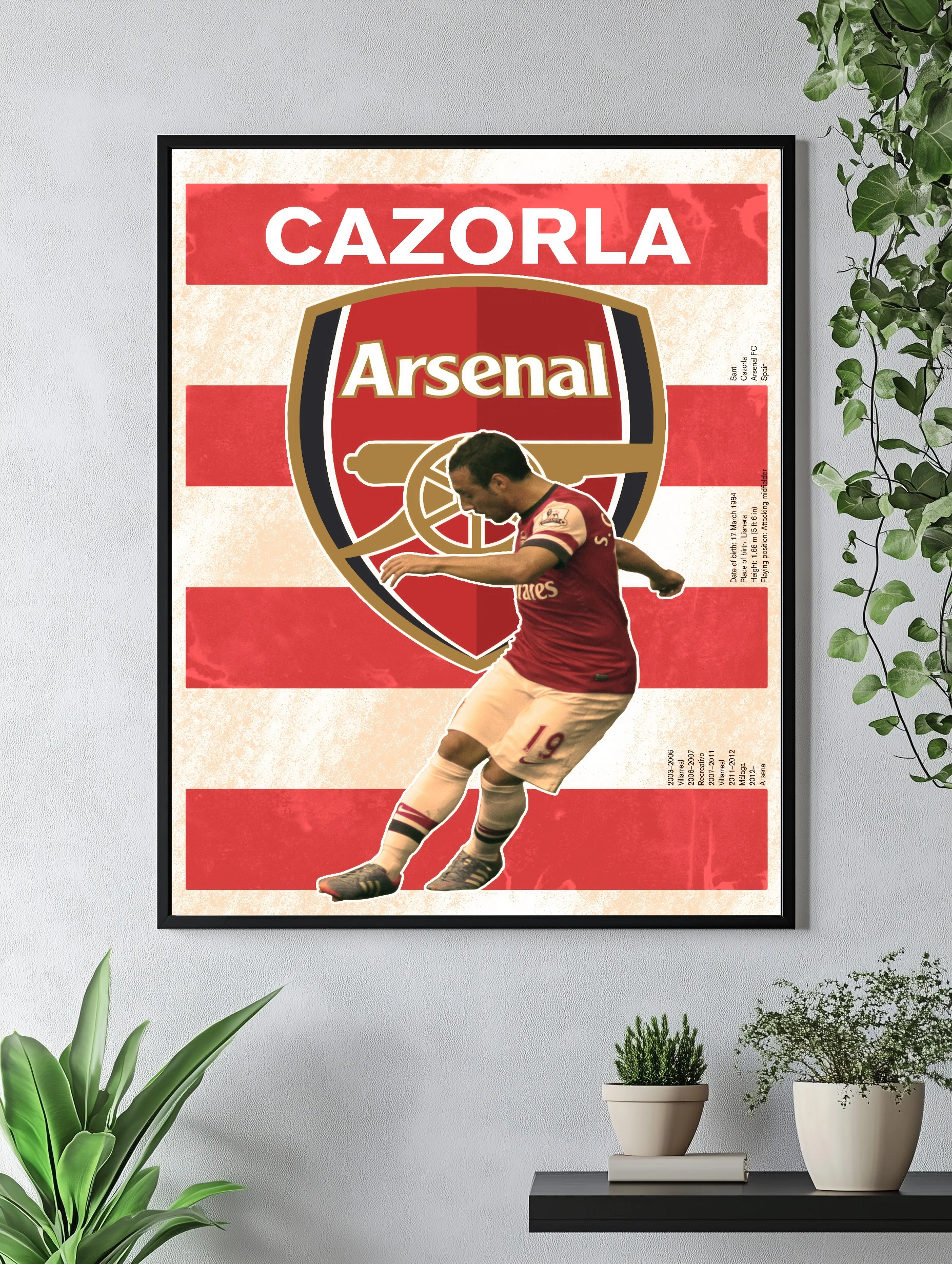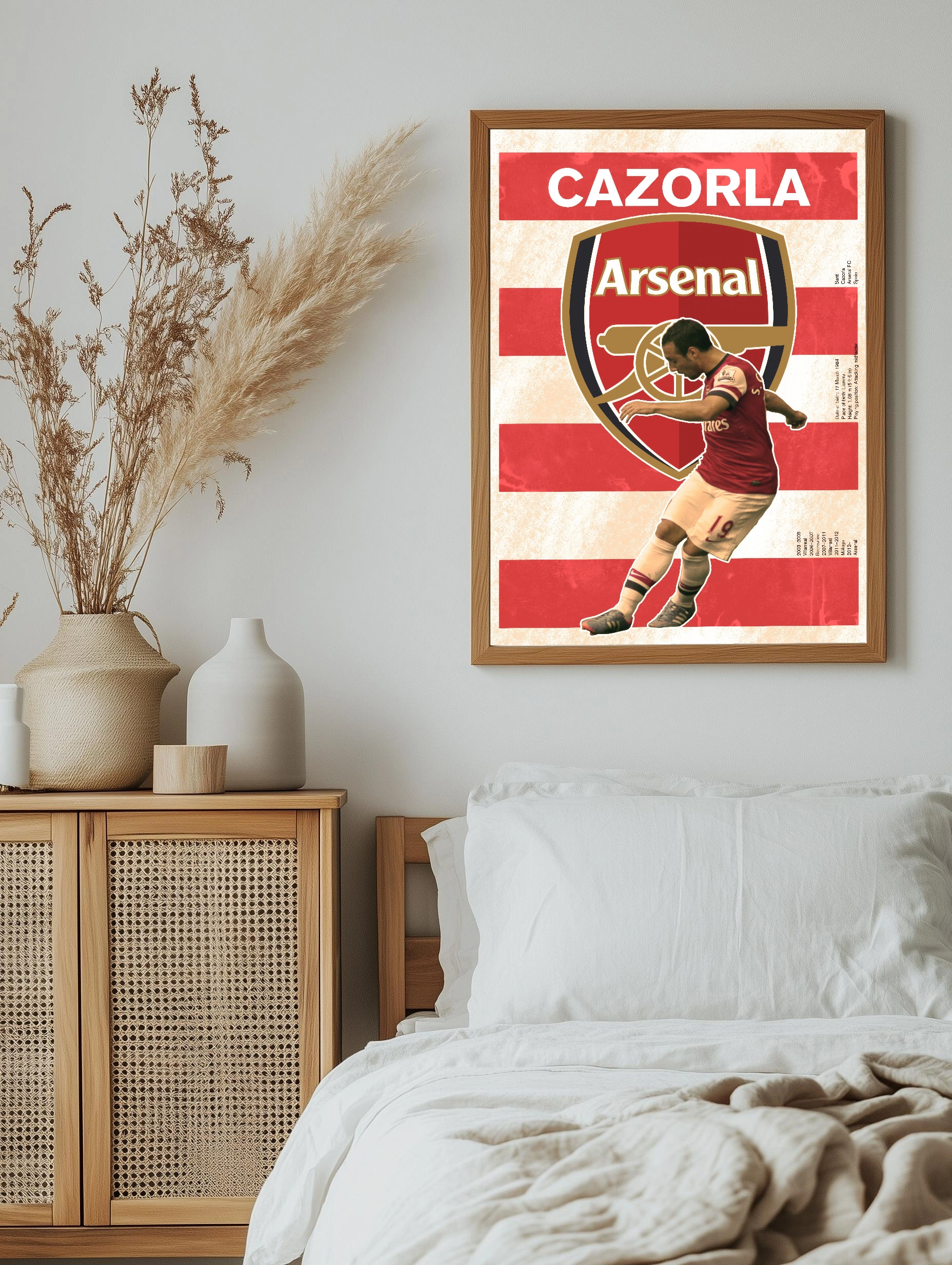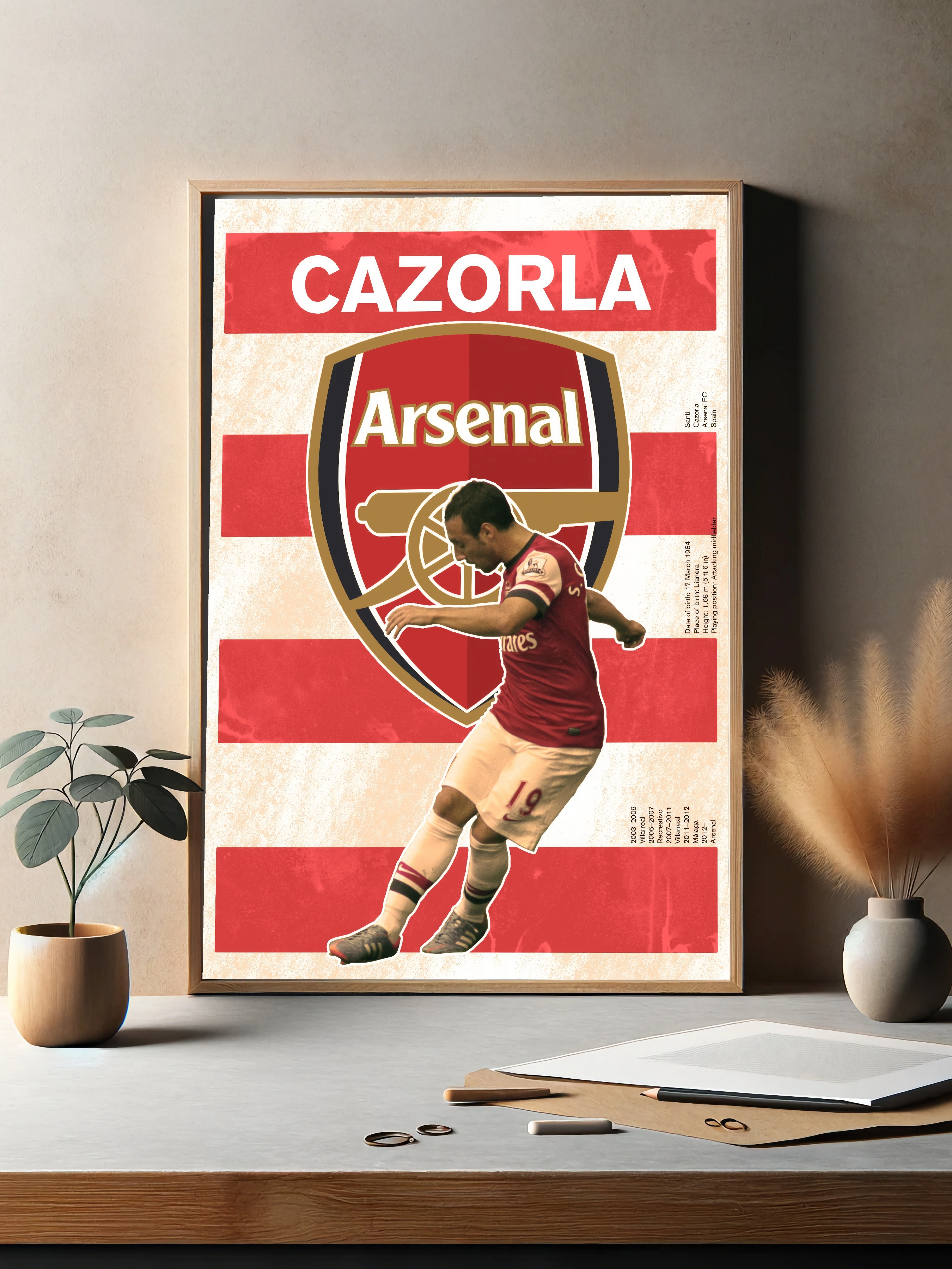 Декоративный плакат с изображением известного футболиста Сани Касорлы в форме клуба Арсенал на фоне большого логотипа команды и красно-белого геометрического фона. Стиль постера современный, живой и динамичный, с акцентом на спортивную энергию и футбол. Идеальное интерьерное искусство для поклонников футбола и футбольных клубов, подходит для оформления гостиной, кабинета или спортбара.