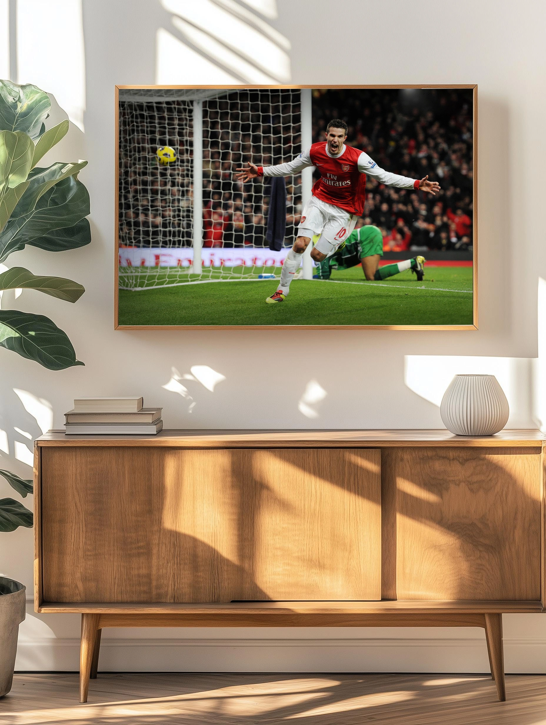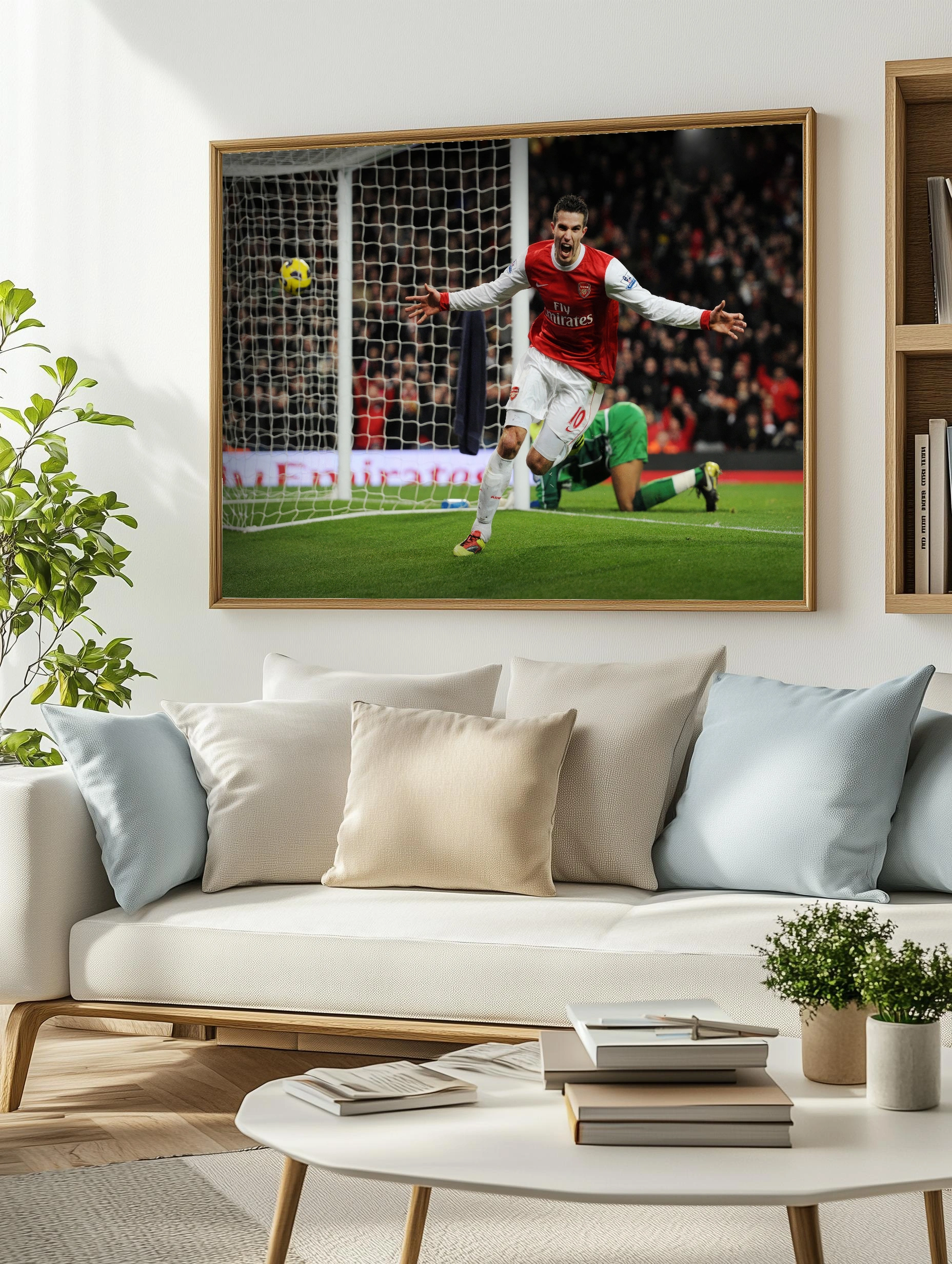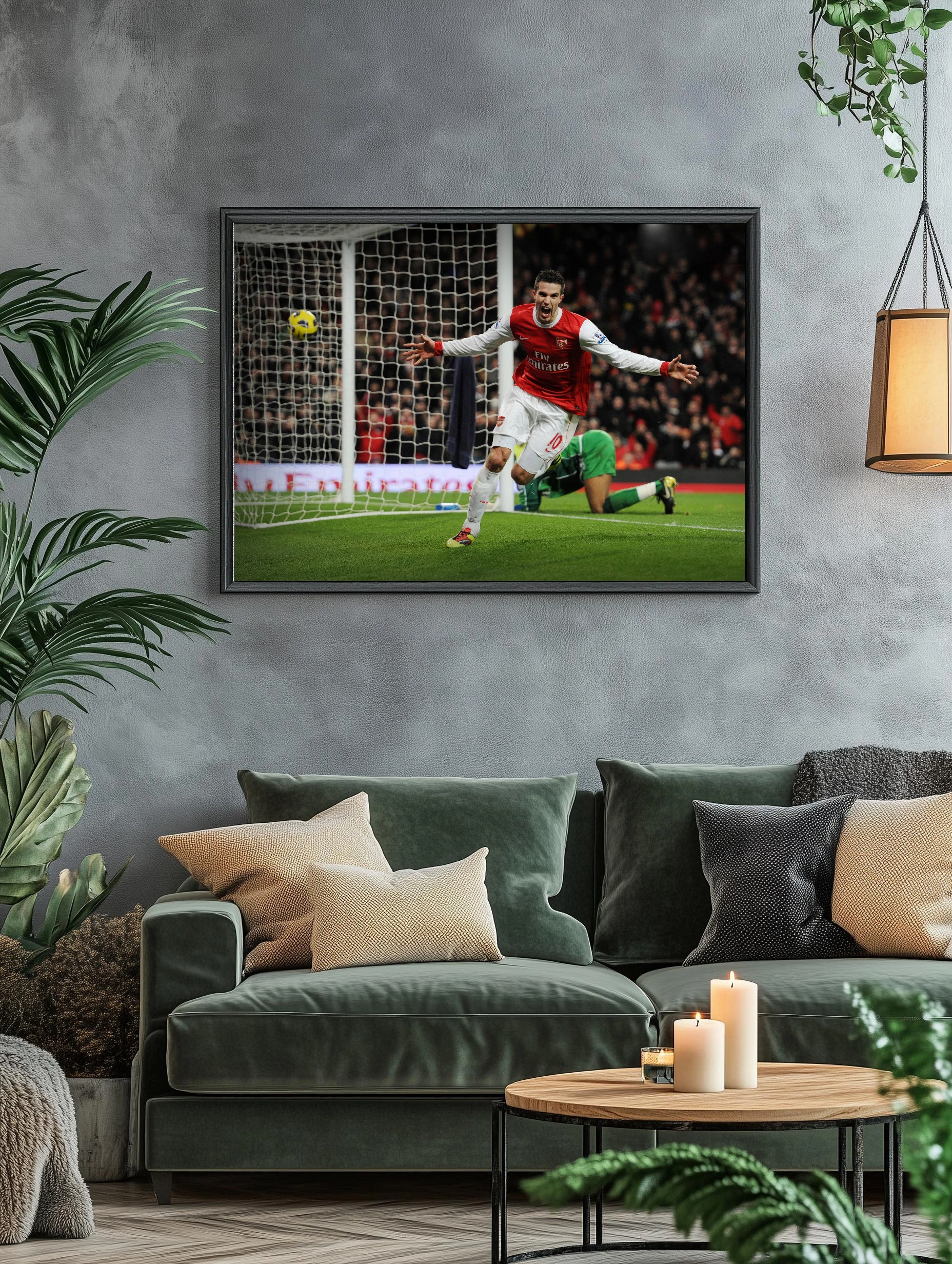 На изображении запечатлен момент футбольного матча с игроком Арсенала в красной форме с номером 10, празднующим забитый гол. Яркие эмоции, динамика игры и атмосфера стадиона с зрителями создают живой и эмоциональный интерьерный арт. Идеально для спортивных фанатов и любителей футбола.