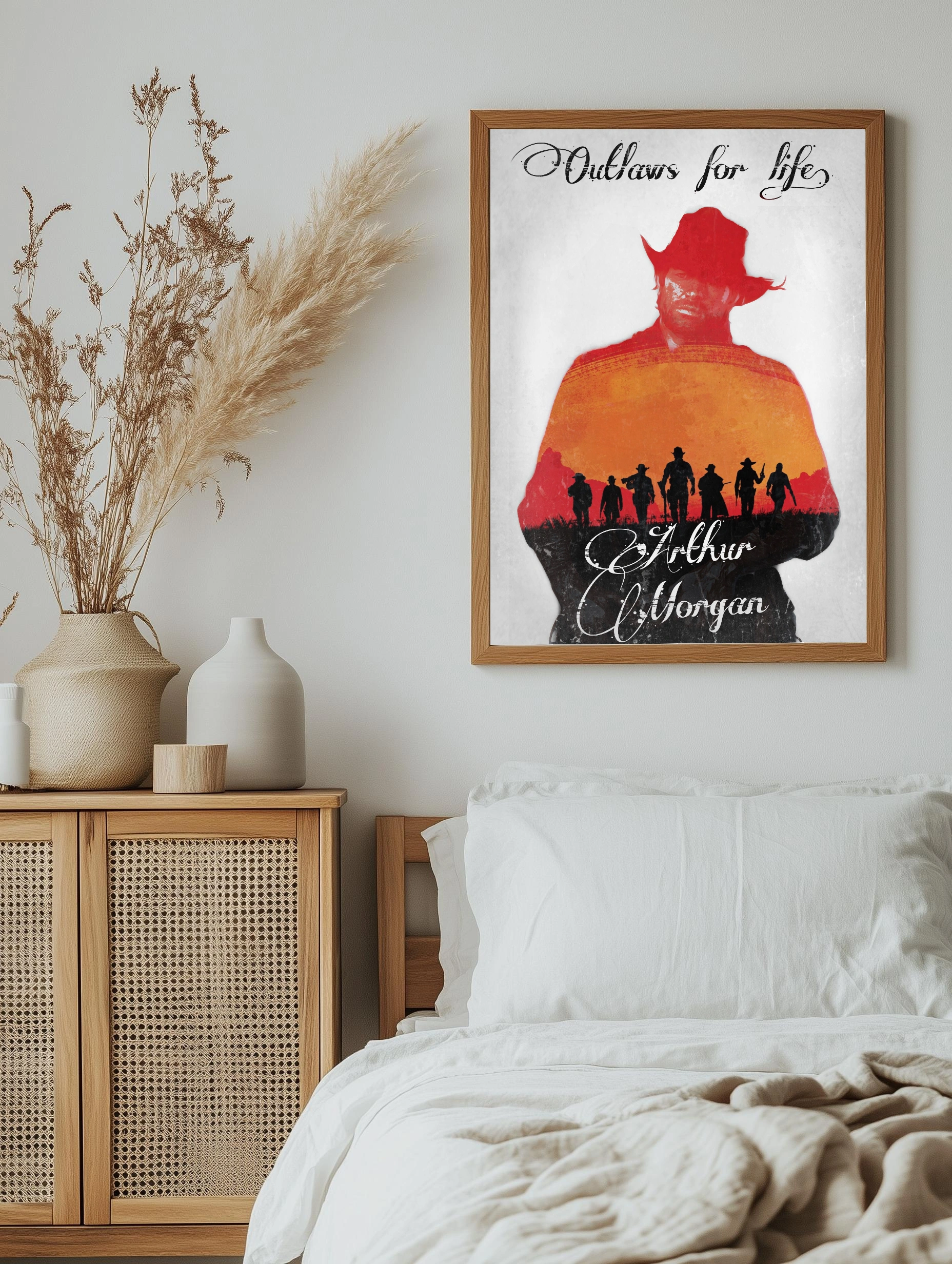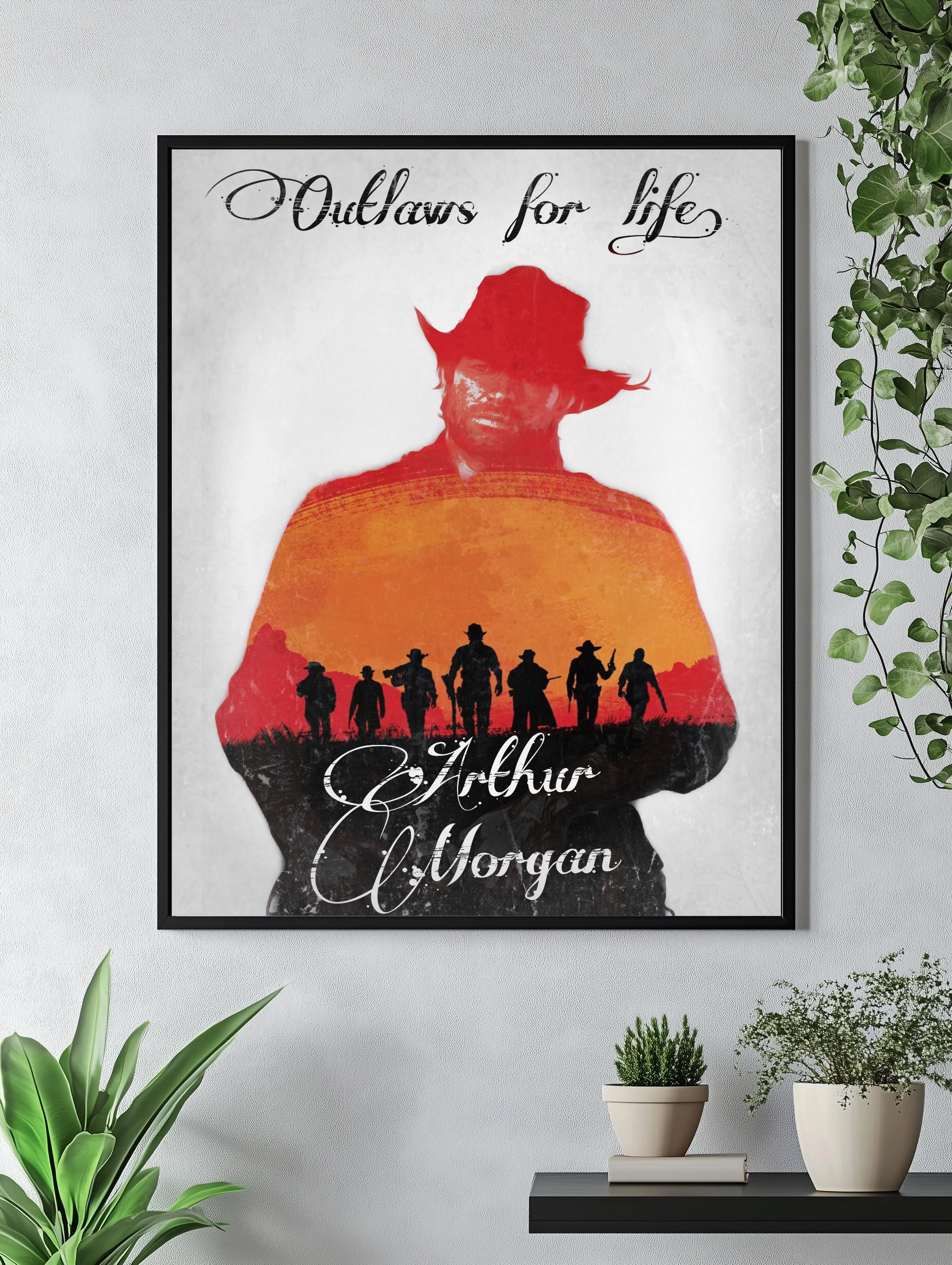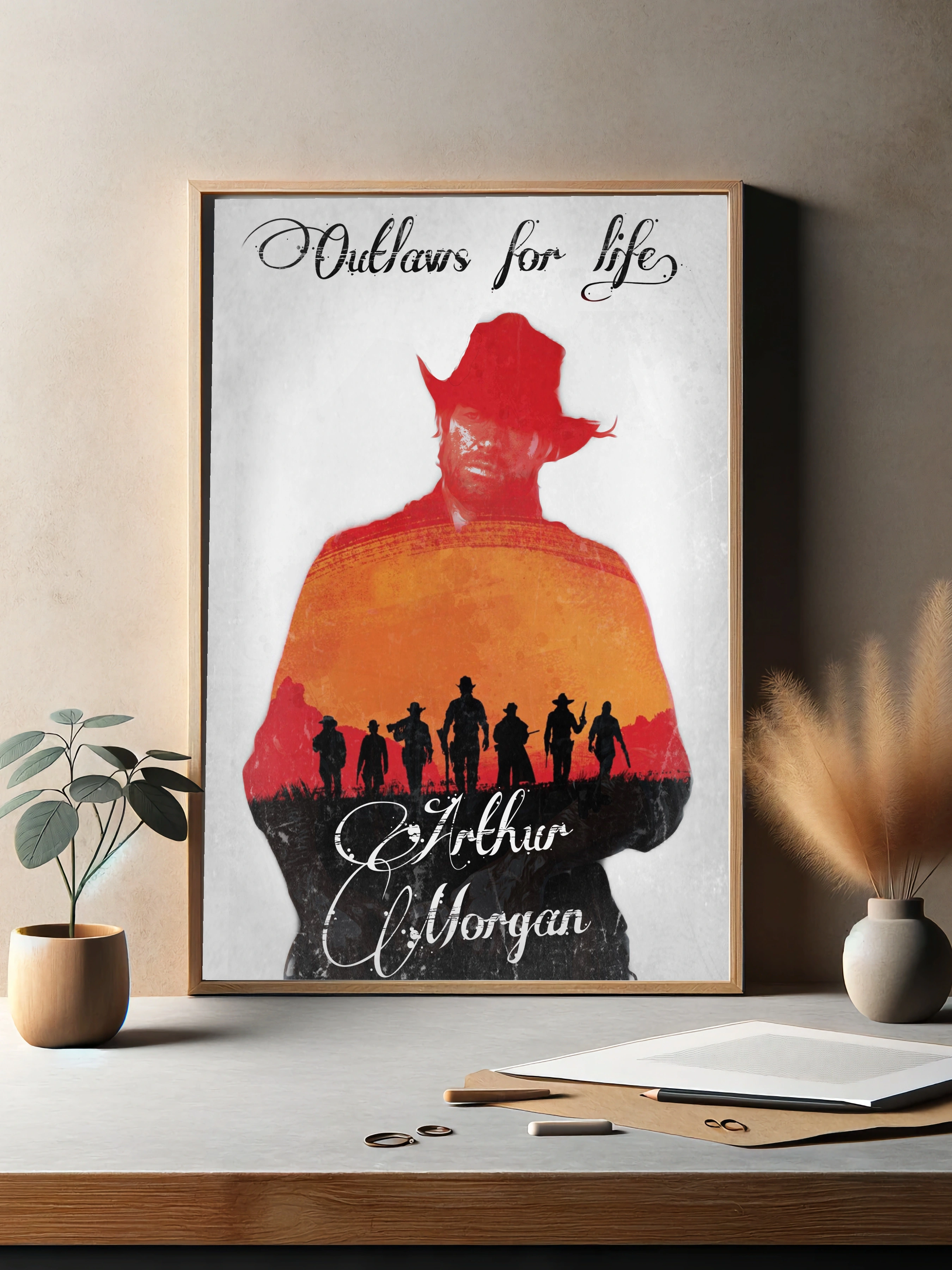 Декоративный плакат с Артуром Морганом из игры Red Dead Redemption 2 в стилизованном силуэте с красным шляпой и фигурой на фоне оранжевого заката и черных силуэтов ковбойской команды. Стиль сочетает графику и художественный минимализм для стильного декора стен в доме или офисе.