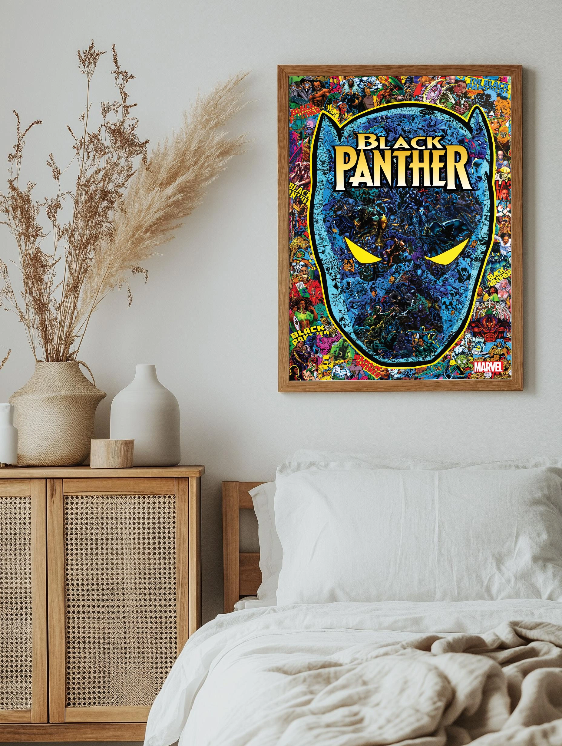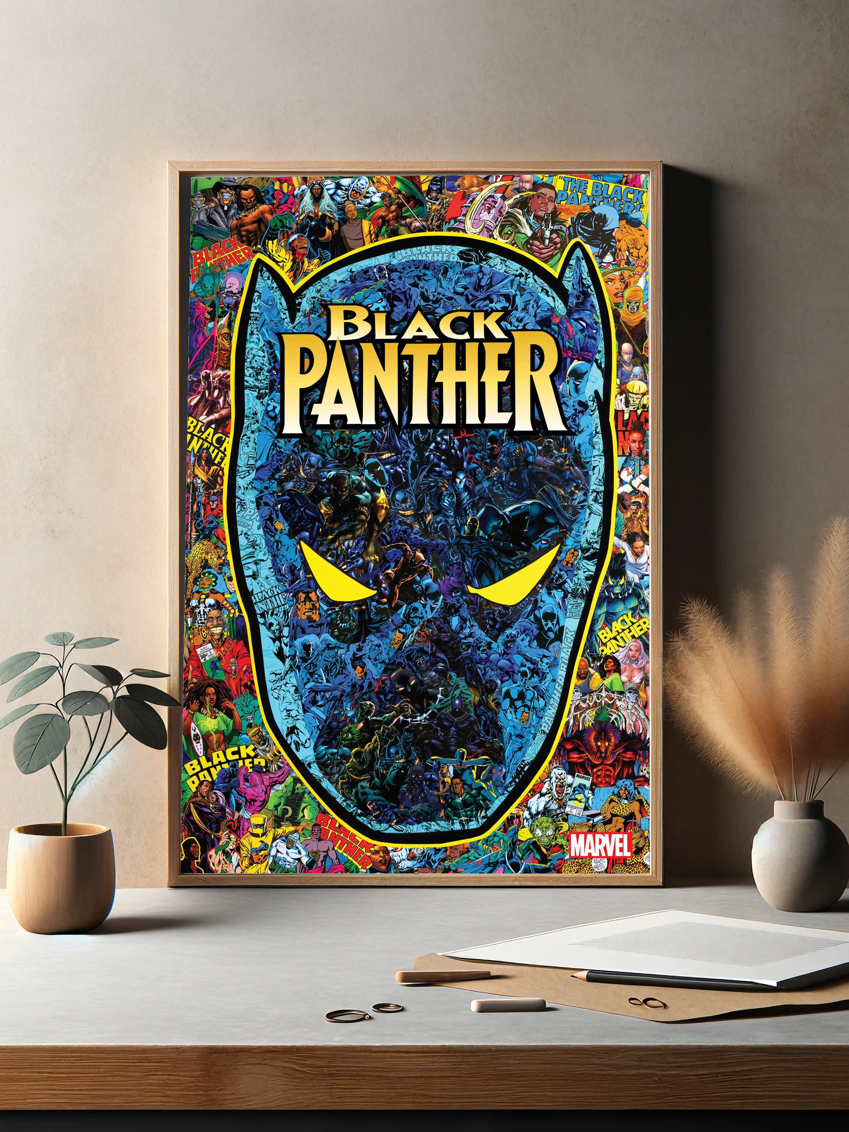 Динамичный и яркий арт, вдохновлённый комиксами Marvel про Черную Пантеру. Центральный силуэт маски героя выполнен в насыщенных синих и чёрных тонах, окружён множеством персонажей и сцен из комиксов. Отличный декоративный плакат для стильного интерьера, коллекционеров и фанатов Marvel с уникальным принтом и впечатляющей композицией.