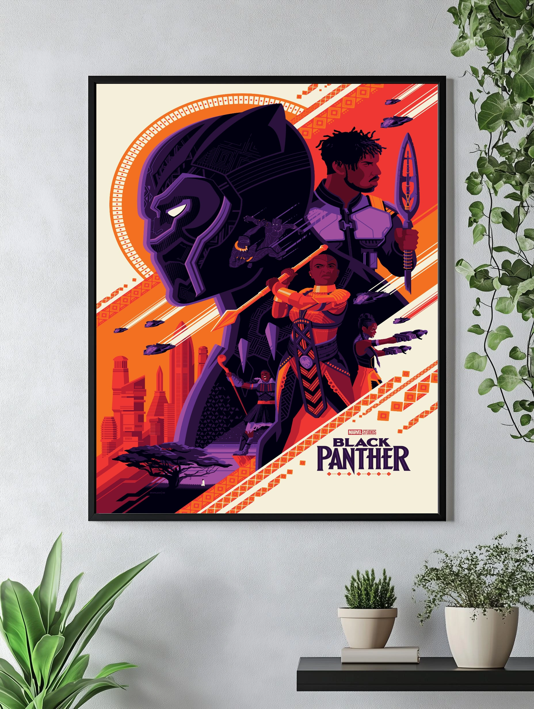 Декоративный плакат с героями Black Panther из киновселенной Marvel, выполненный в стиле современного искусства. На изображении крупный силуэт Чёрной Пантеры на фоне яркого оранжевого солнца и красных оттенков, вокруг — персонажи в традиционных африканских и технологичных костюмах. Уникальный интерьерный арт для гостиной или офиса.
