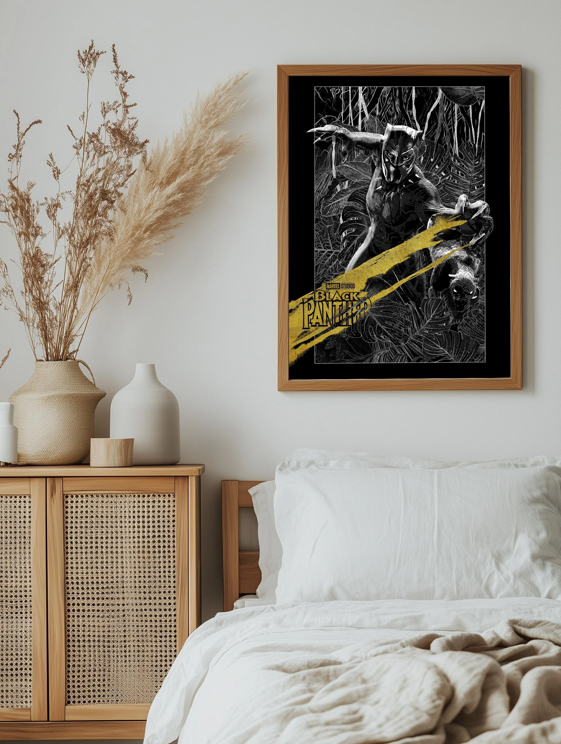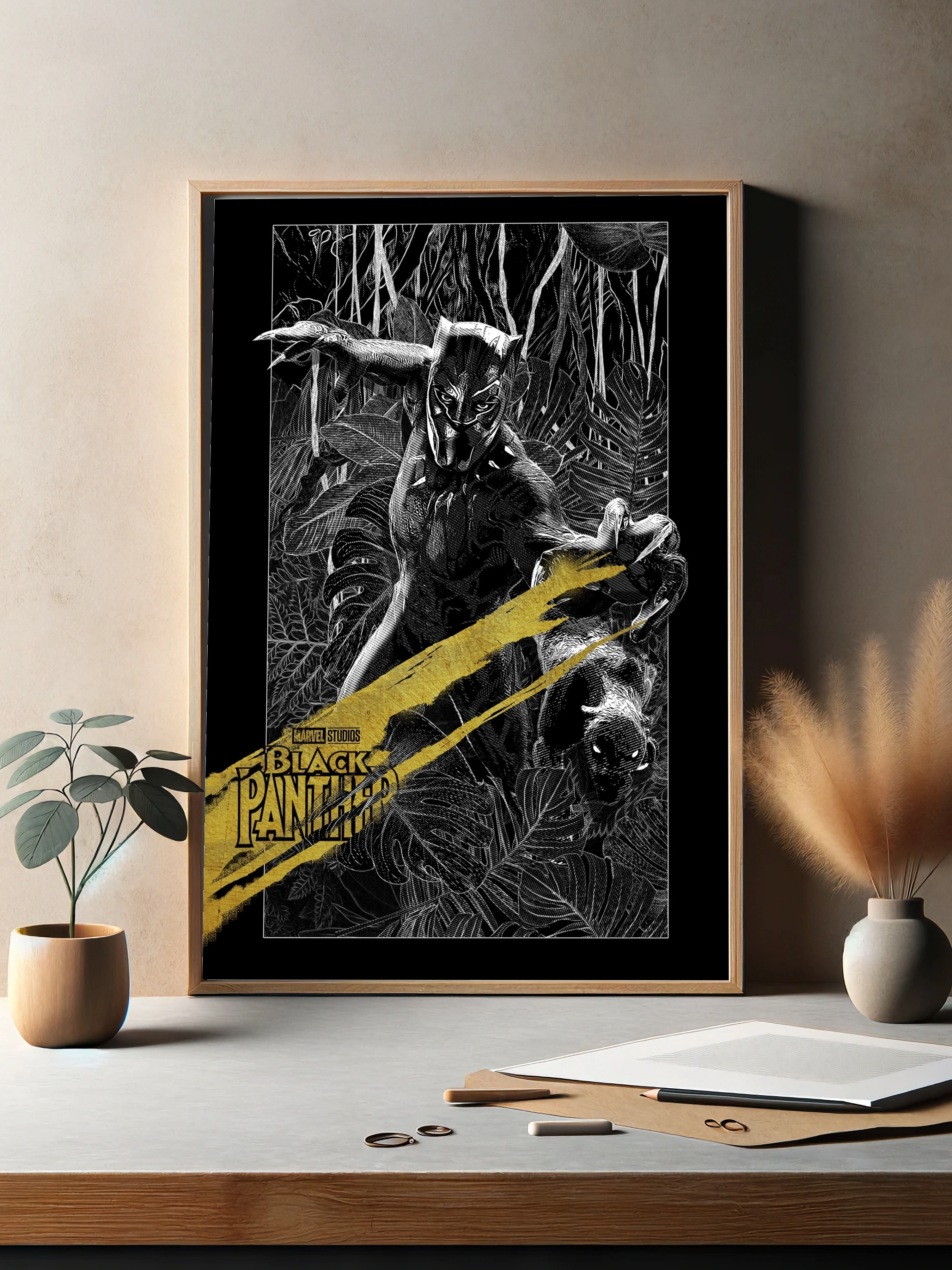 Чёрно-белая картина с изображением Чёрной Пантеры из Marvel Studios в детализированном стиле. На фоне — густая джунглевая растительность, добавляющая драматизма и глубины изображению. Золотые штрихи акцентируют внимание и создают динамику. Отличный выбор для интерьерного искусства в гостиную или офис.