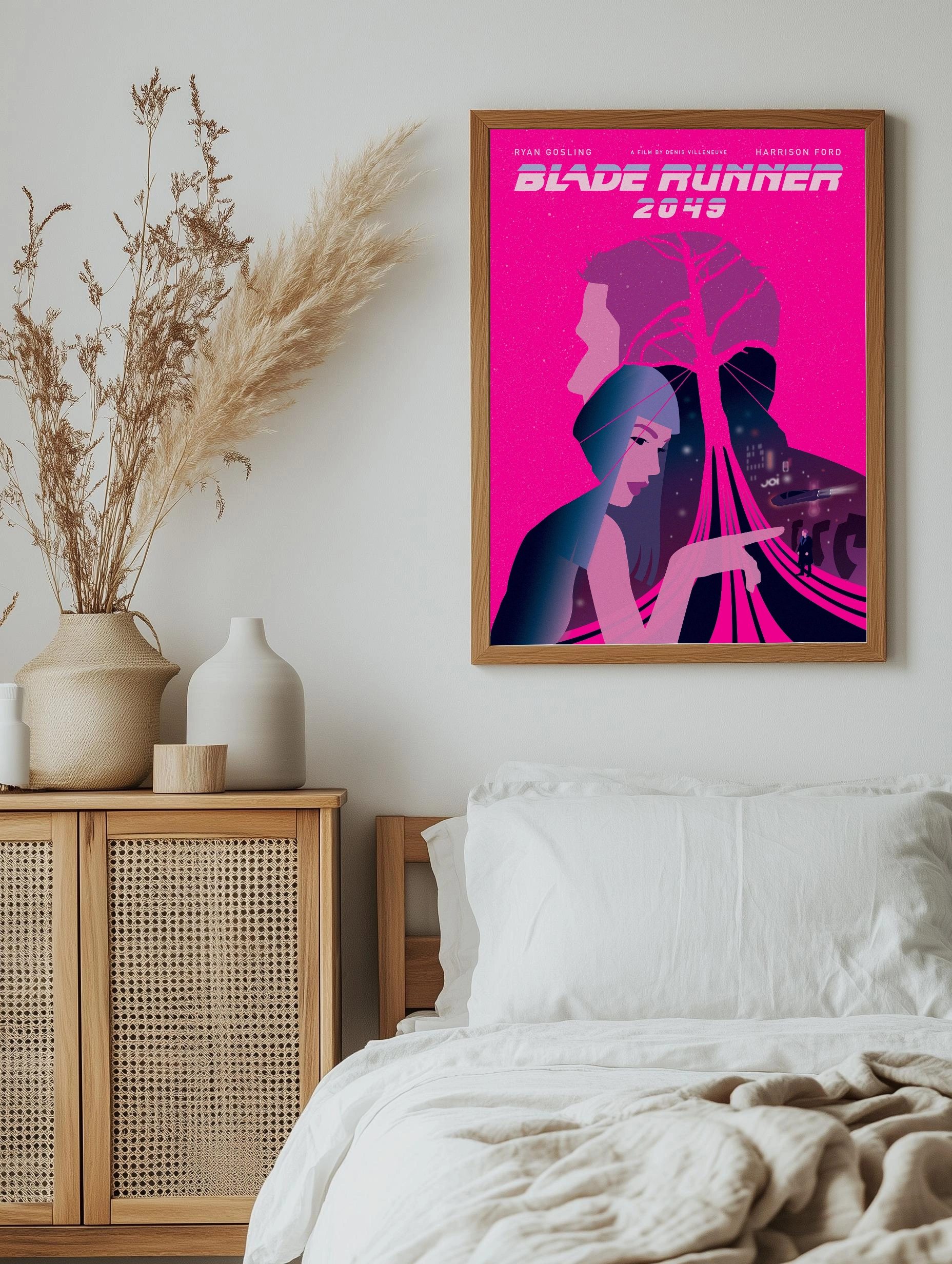 Яркий интерьерный постер на холсте, посвящённый фильму Blade Runner 2049. В стиле киберпанк изображены стилизованные силуэты персонажей на фоне неоновых городских линий и элементов футуристической архитектуры. Современное искусство для стен с акцентом на розовые и синие оттенки создаёт атмосферу загадочности и технологичного будущего.