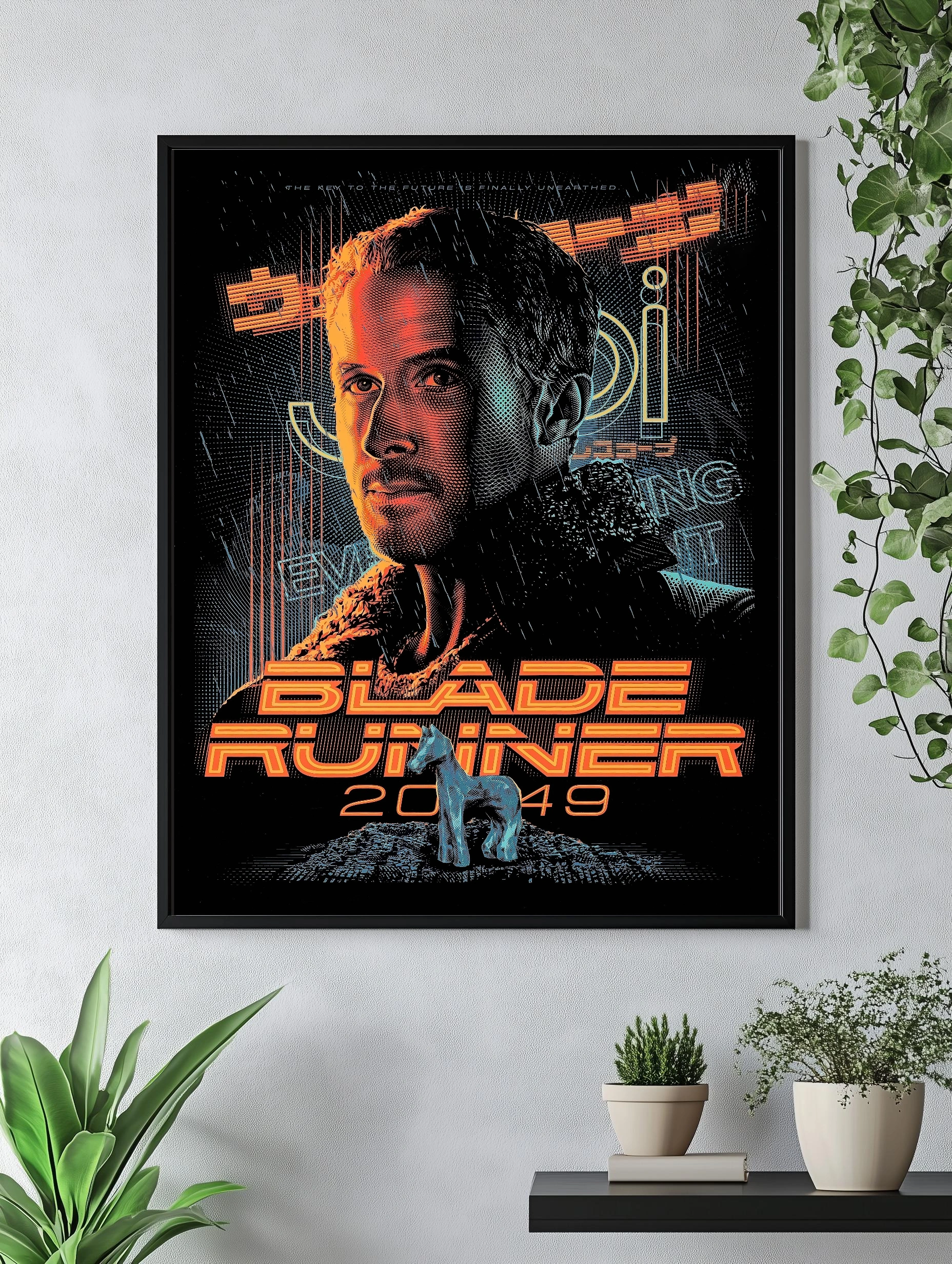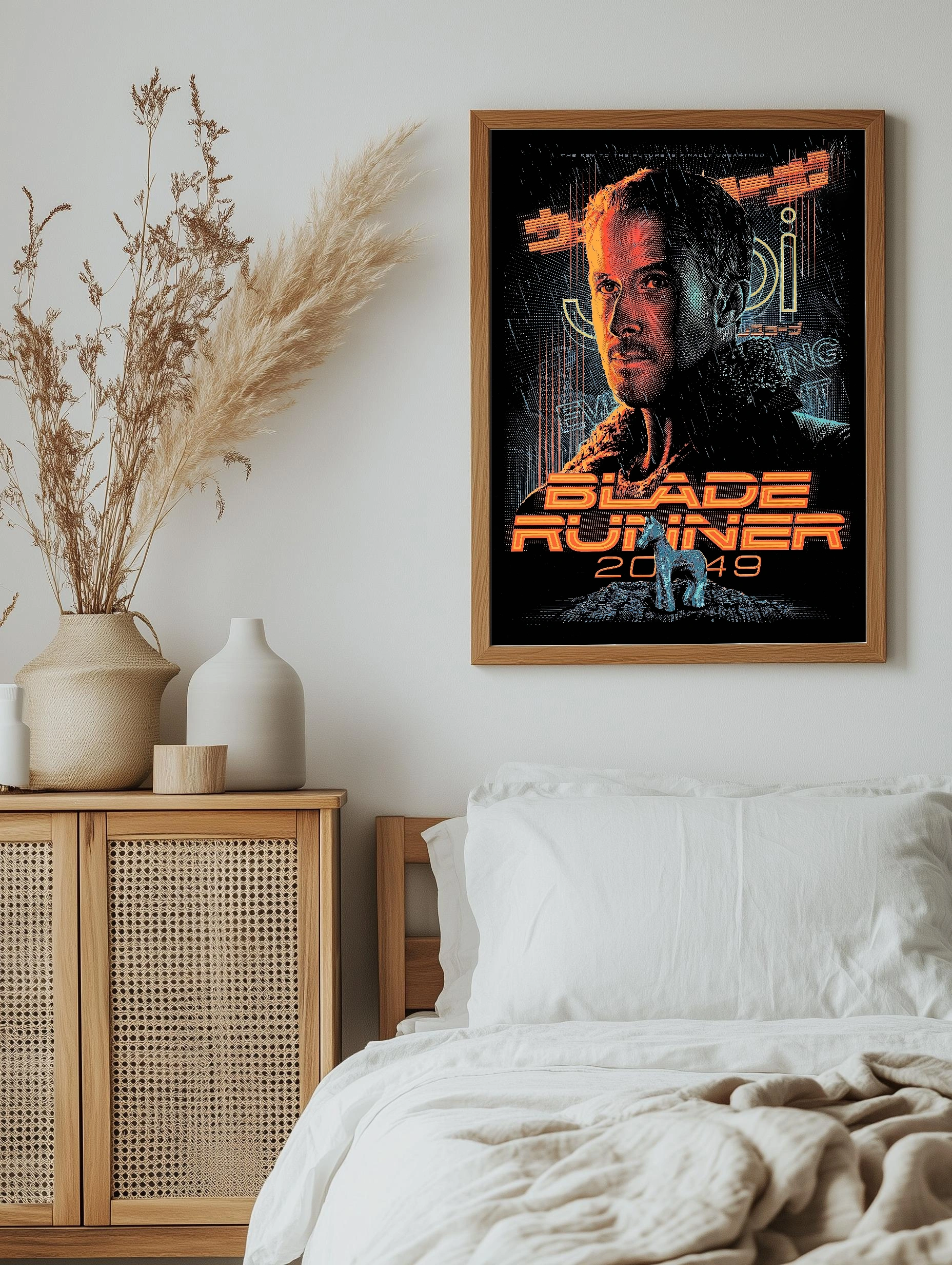 Картина для гостиной с изображением персонажа из культового фильма Blade Runner 2049 в стиле киберпанк. Темный фон с неоновыми оранжевыми и голубыми элементами подчеркивает атмосферу футуризма и мистики. Яркий портрет героя и детали города создают незабываемый интерьерный арт для стен.