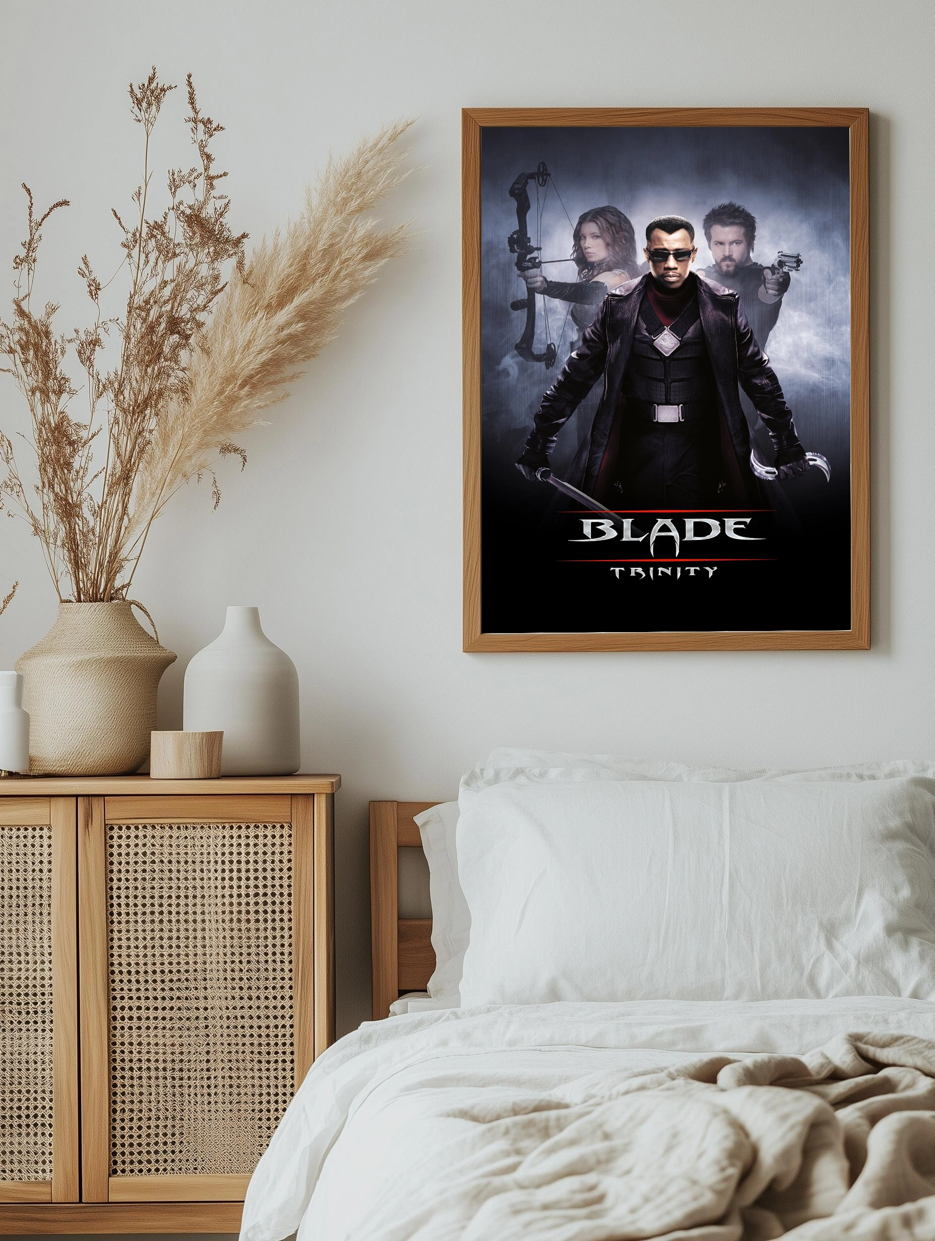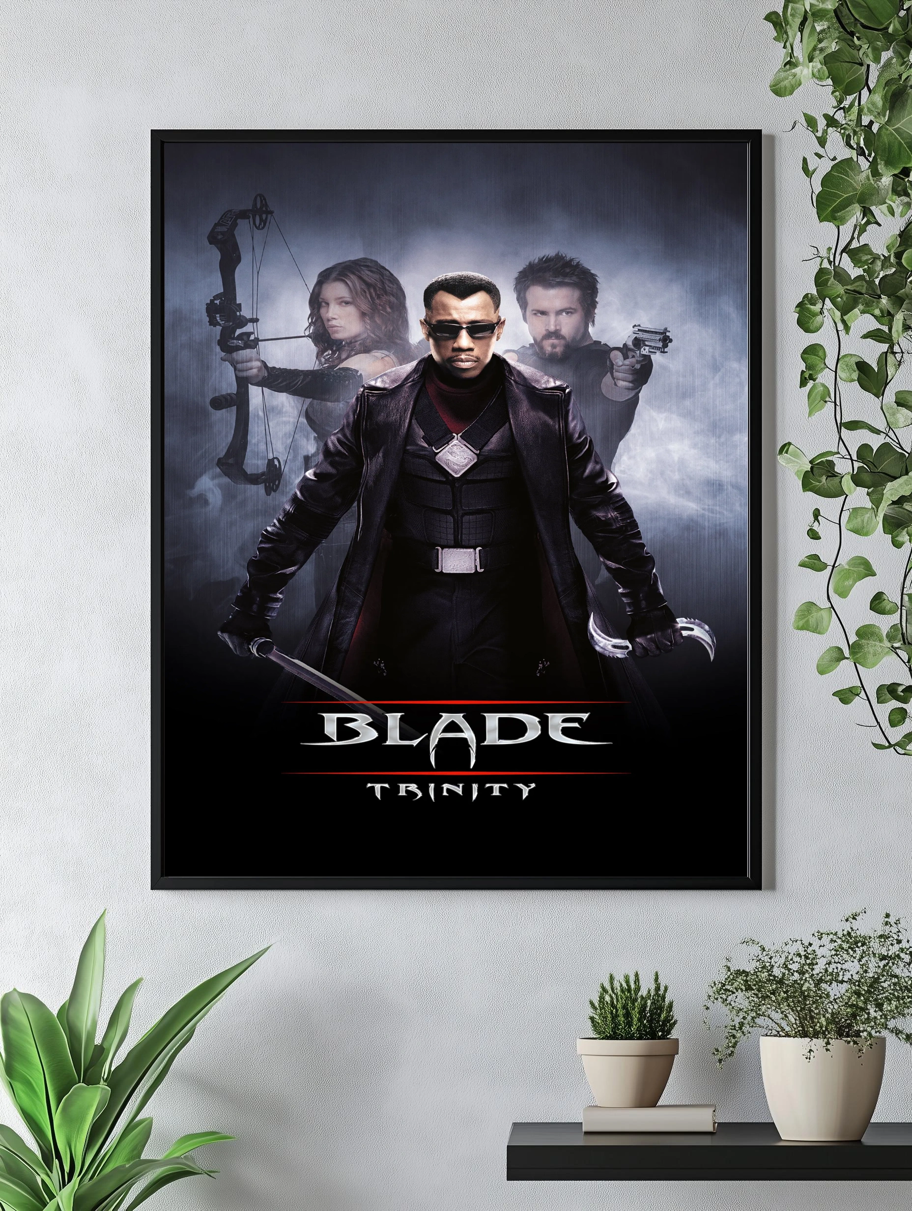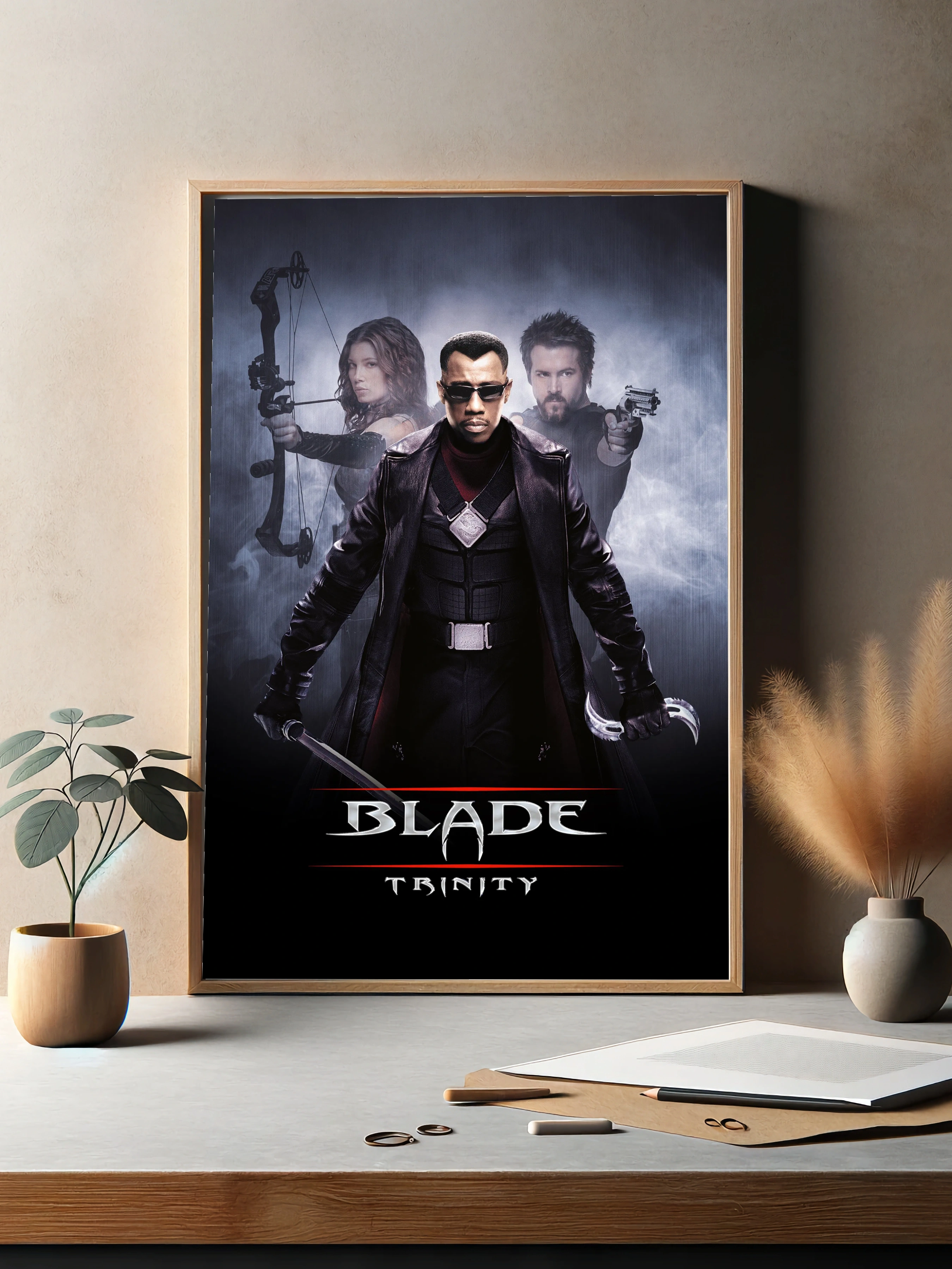 Известный персонаж из фильма Blade Trinity изображён в центре композиции с кожаной курткой и очками. По бокам видны его союзники с оружием — лук и пистолет. Постер выполнен в тёмных и мрачных тонах с акцентом на динамику и напряжённость, что создаёт атмосферу современного кинематографического экшена. Идеальный художественный плакат для интерьера поклонников жанра и уникальные картины для дома.