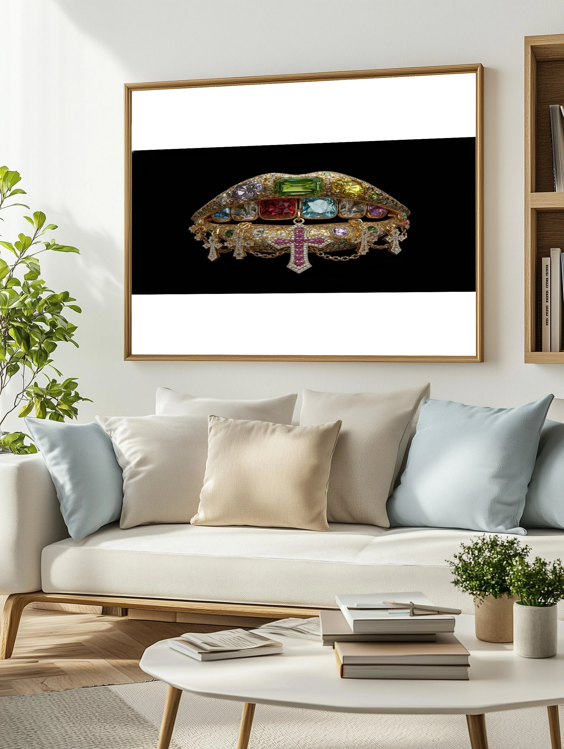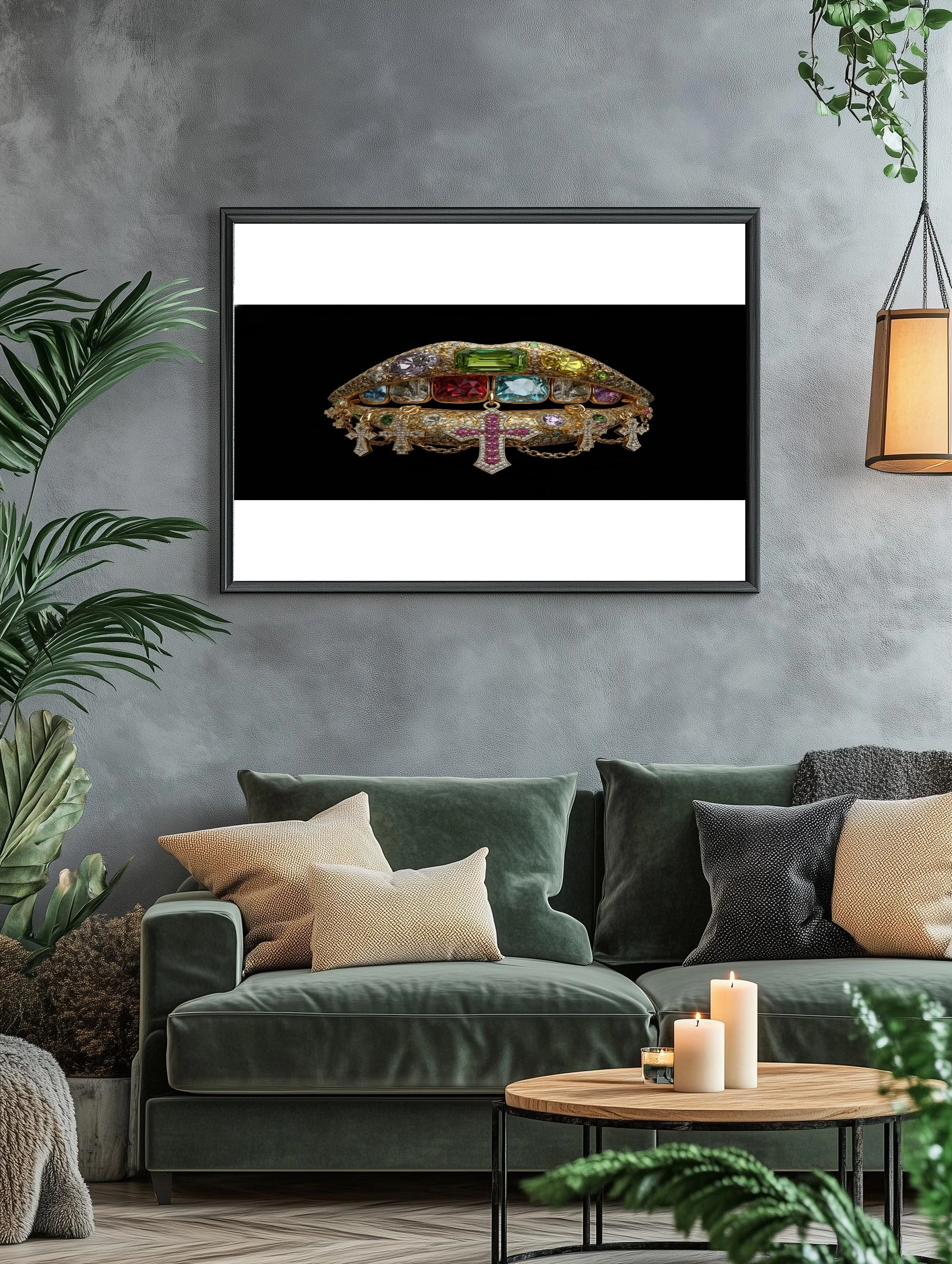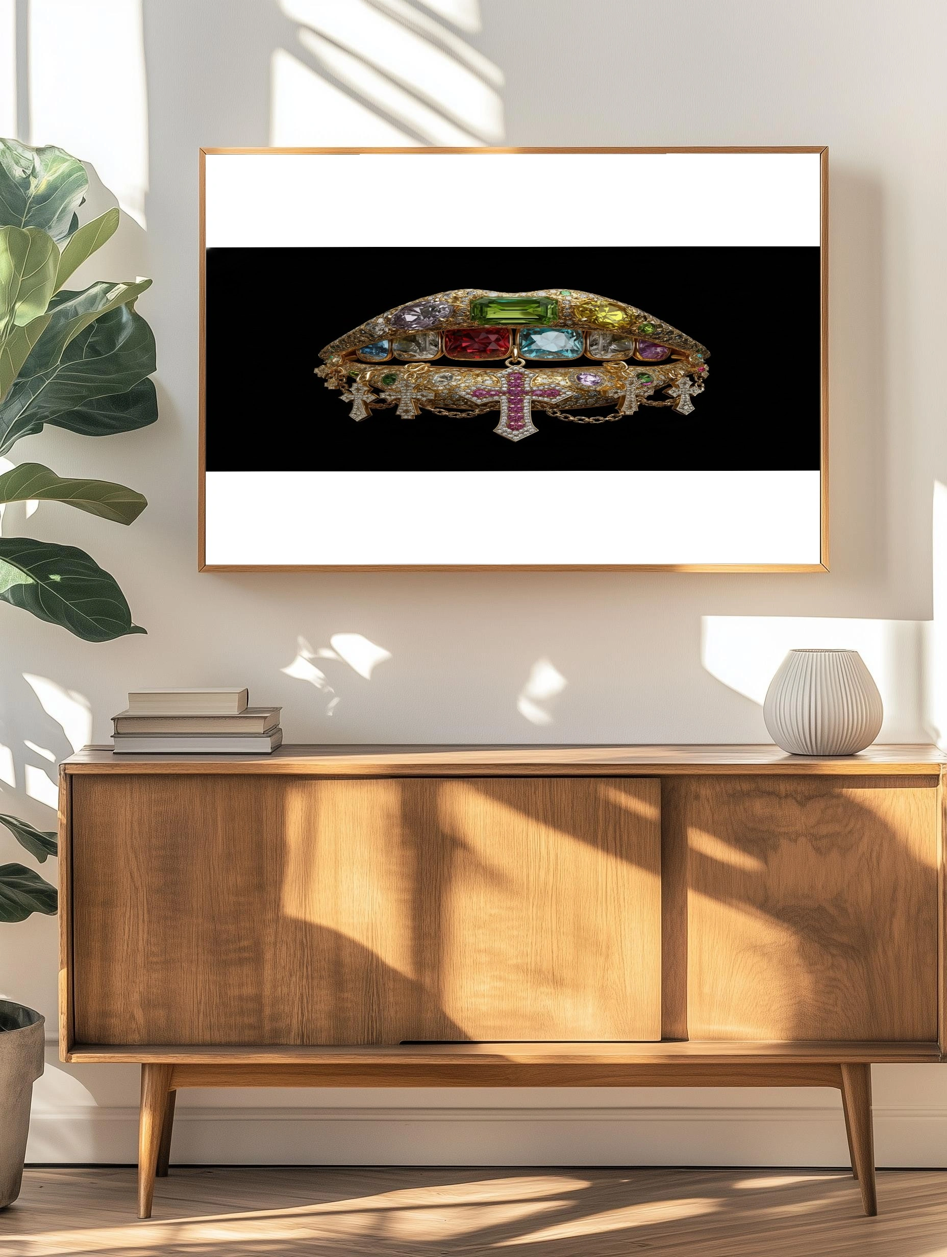 Погрузитесь в мир роскоши с этим уникальным постером, изображающим великолепные губы, украшенные яркими драгоценными камнями. Каждая деталь проработана до мелочей: золотистая основа губ сверкает на фоне глубокого черного, создавая эффектный контраст. На губах расположены крупные камни различных форм и оттенков — от изумрудного и красного до ярко-голубого и фиолетового. Внизу свисают изящные кресты, дополненные блестящими цепочками, что придает композиции нотку экстравагантности. Этот постер станет настоящим акцентом в интерьере, добавляя атмосферу гламура и стиля. Идеально подойдет для спальни, гостиной или креативного офиса, привлекая внимание молодежи и любителей искусства.