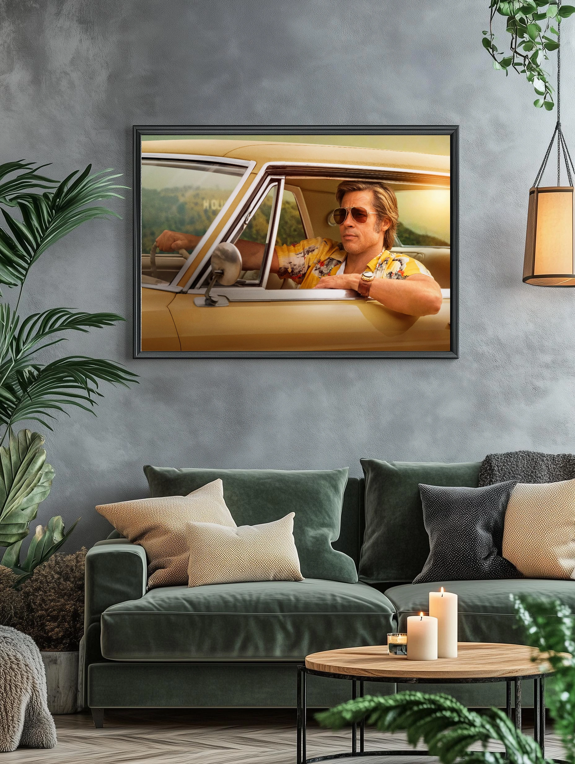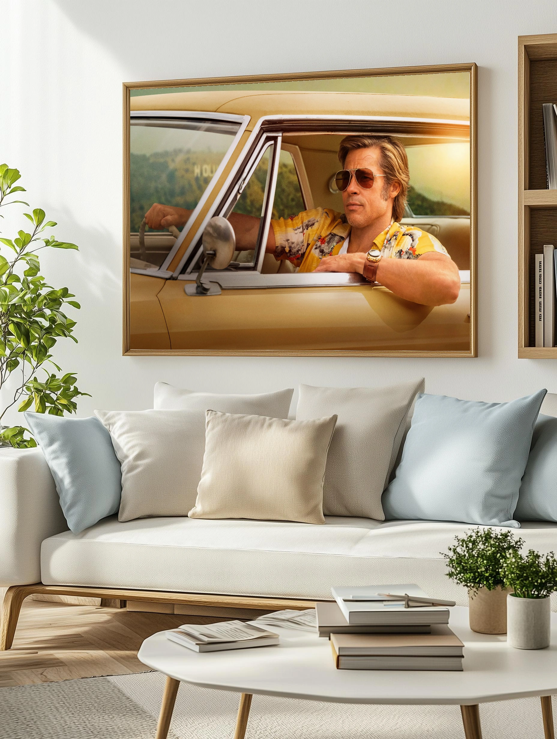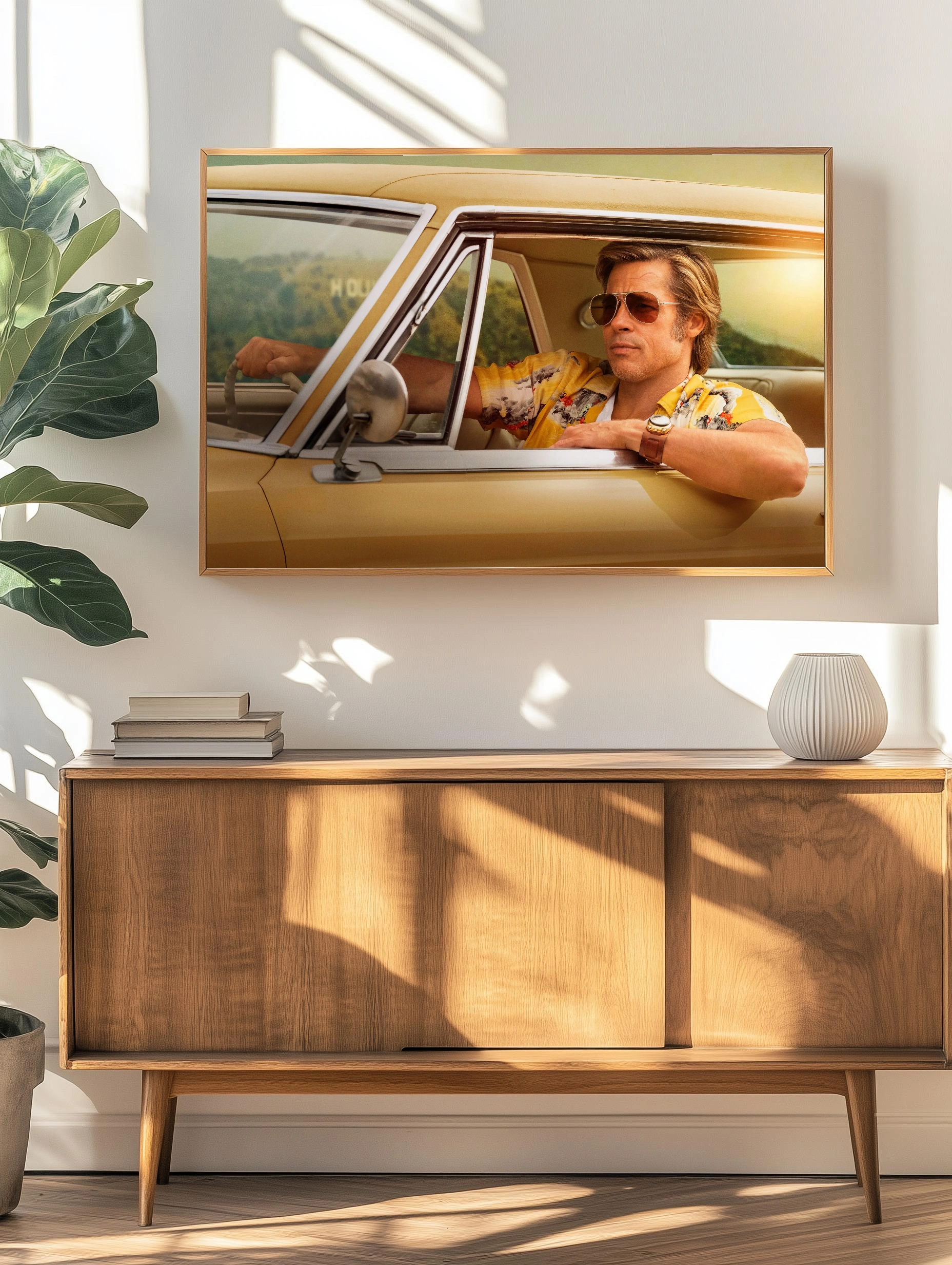 На изображении запечатлен Брэд Питт в образе из фильма, сидящий в желтом ретро-автомобиле. Его стильный желтый гавайский рубашка и солнцезащитные очки создают атмосферу 70-х. Этот интерьерный арт идеально подойдет для поклонников классики американского кино и современного искусства для стен, добавляя уникальную нотку в декор гостиной или кабинета.