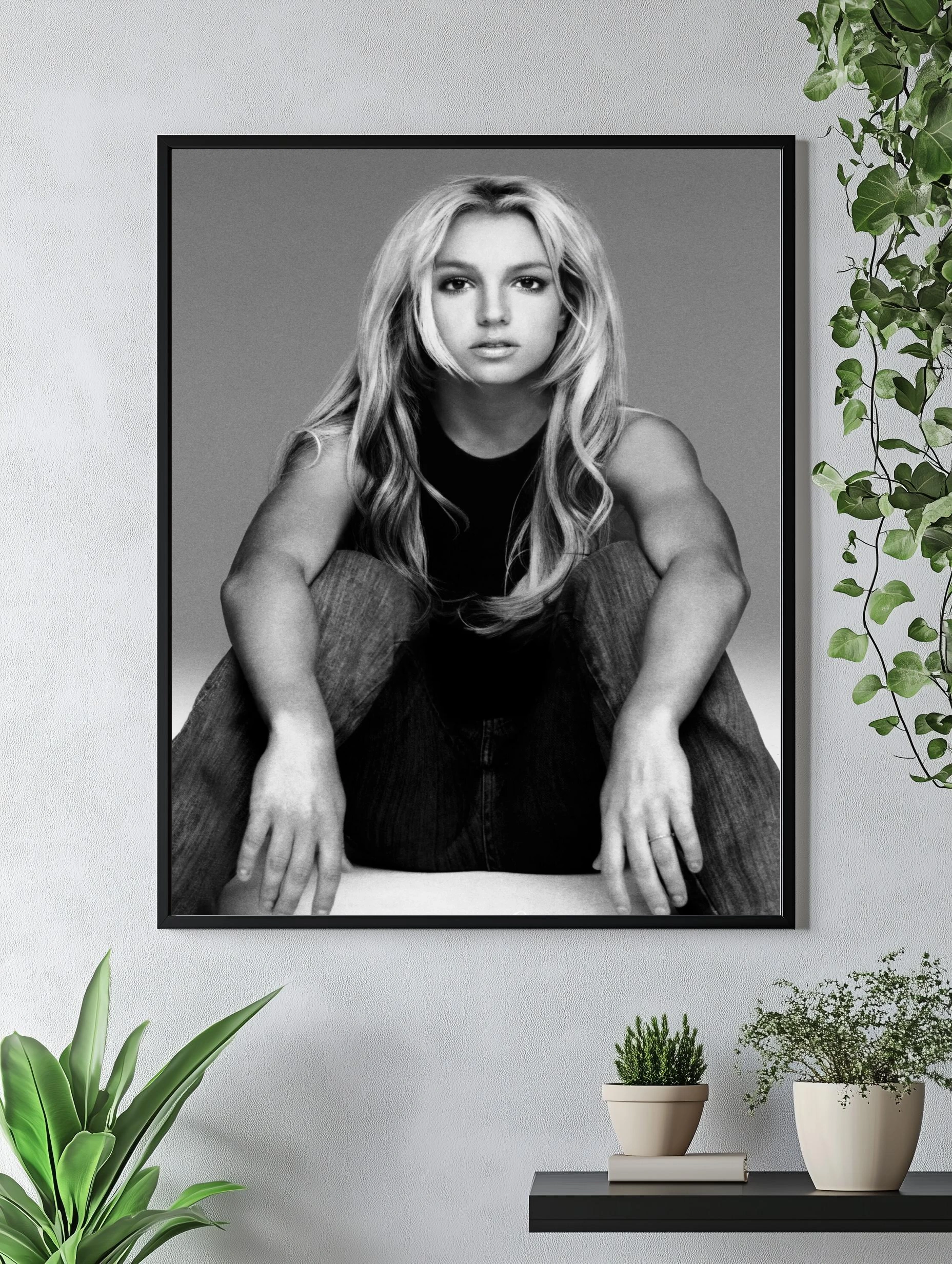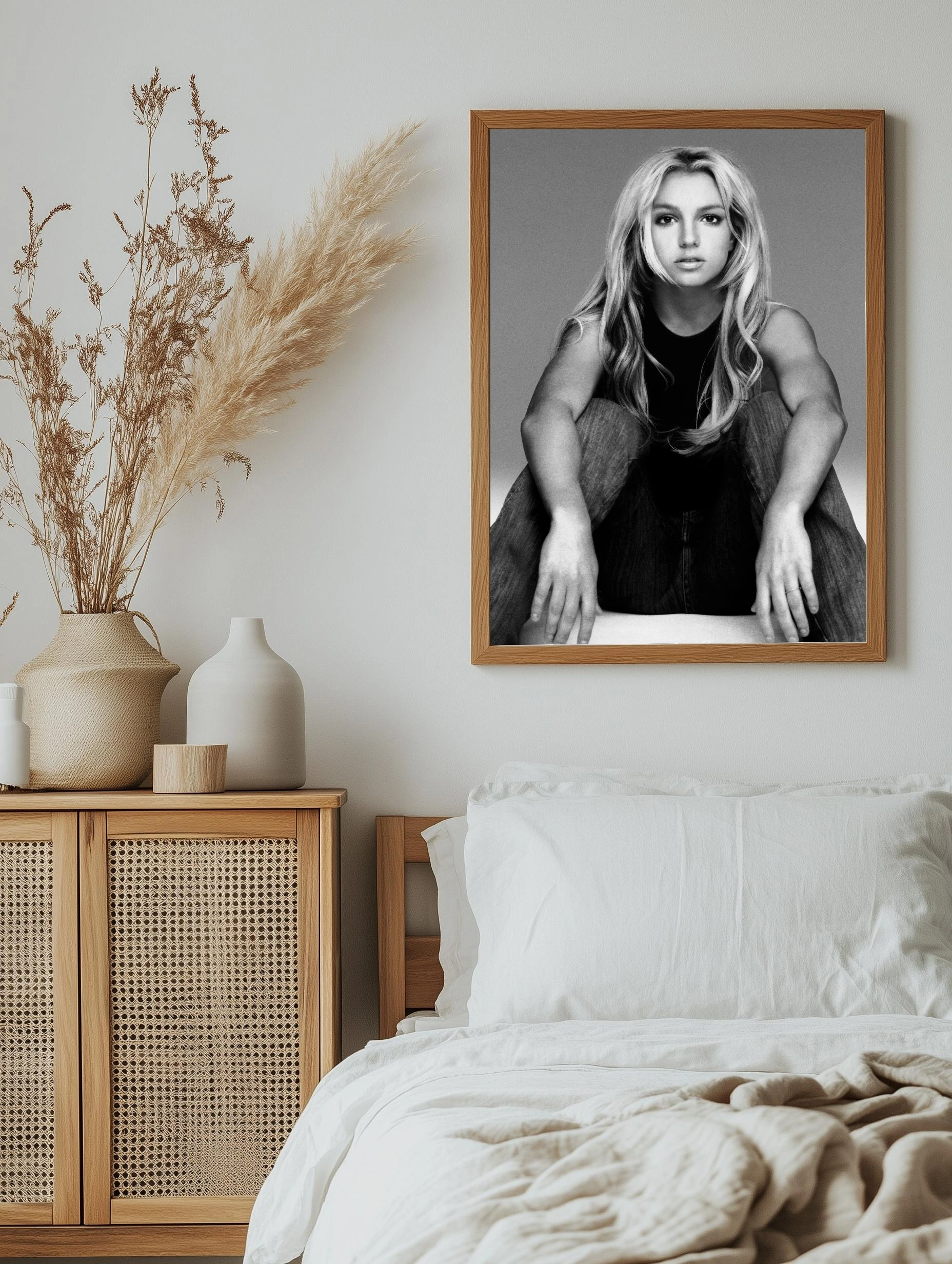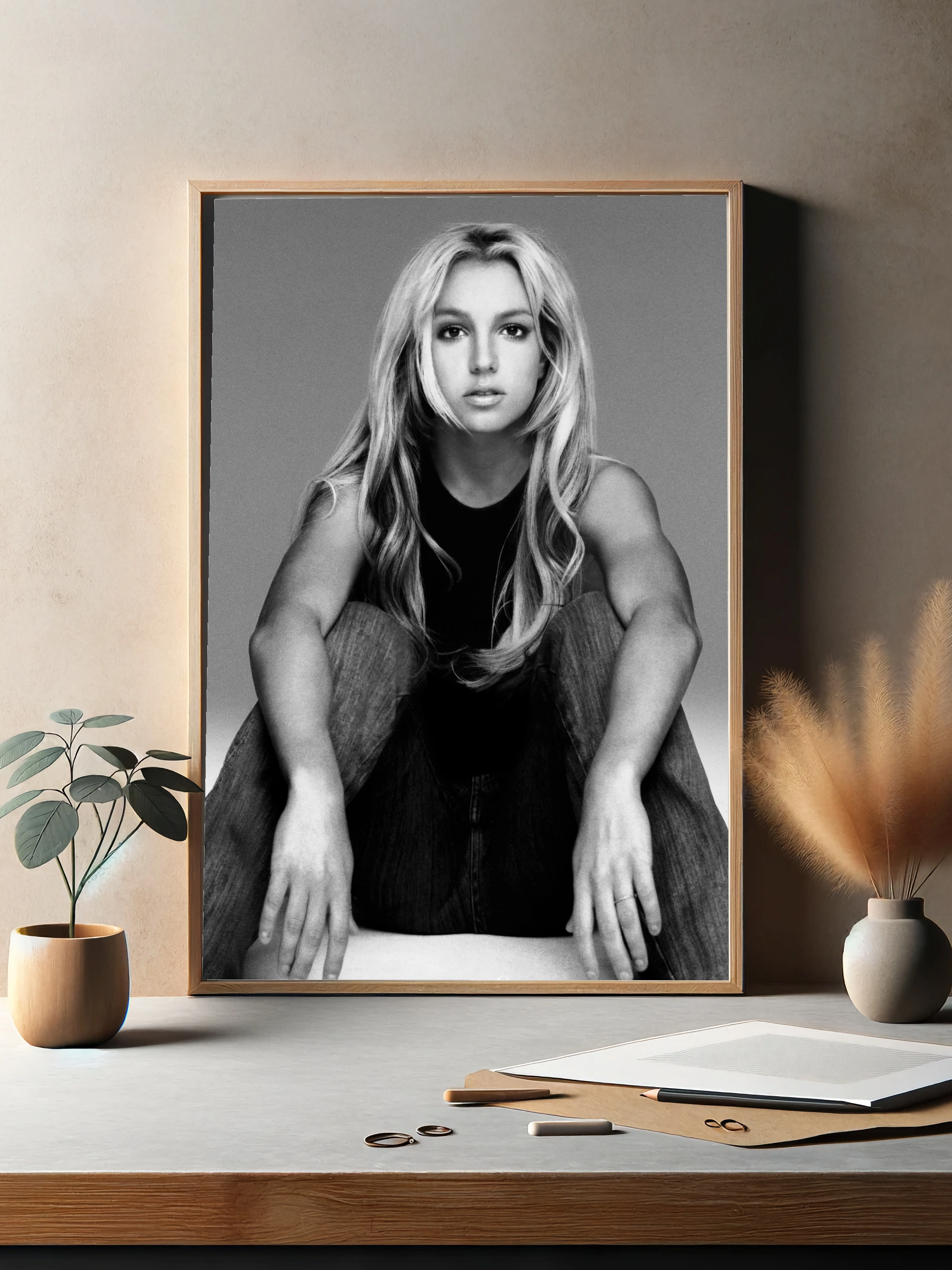 На изображении представлен чёрно-белый портрет Бритни Спирс — всемирно известной певицы и поп-культуры иконы. Фотография выполнена в минималистичном стиле с глубоким контрастом, подчёркивающим естественную красоту и выразительность лица. Этот художественный плакат — идеальный декоративный элемент для гостиной, спальни или офиса, добавляющий стильный и элегантный акцент в интерьер.