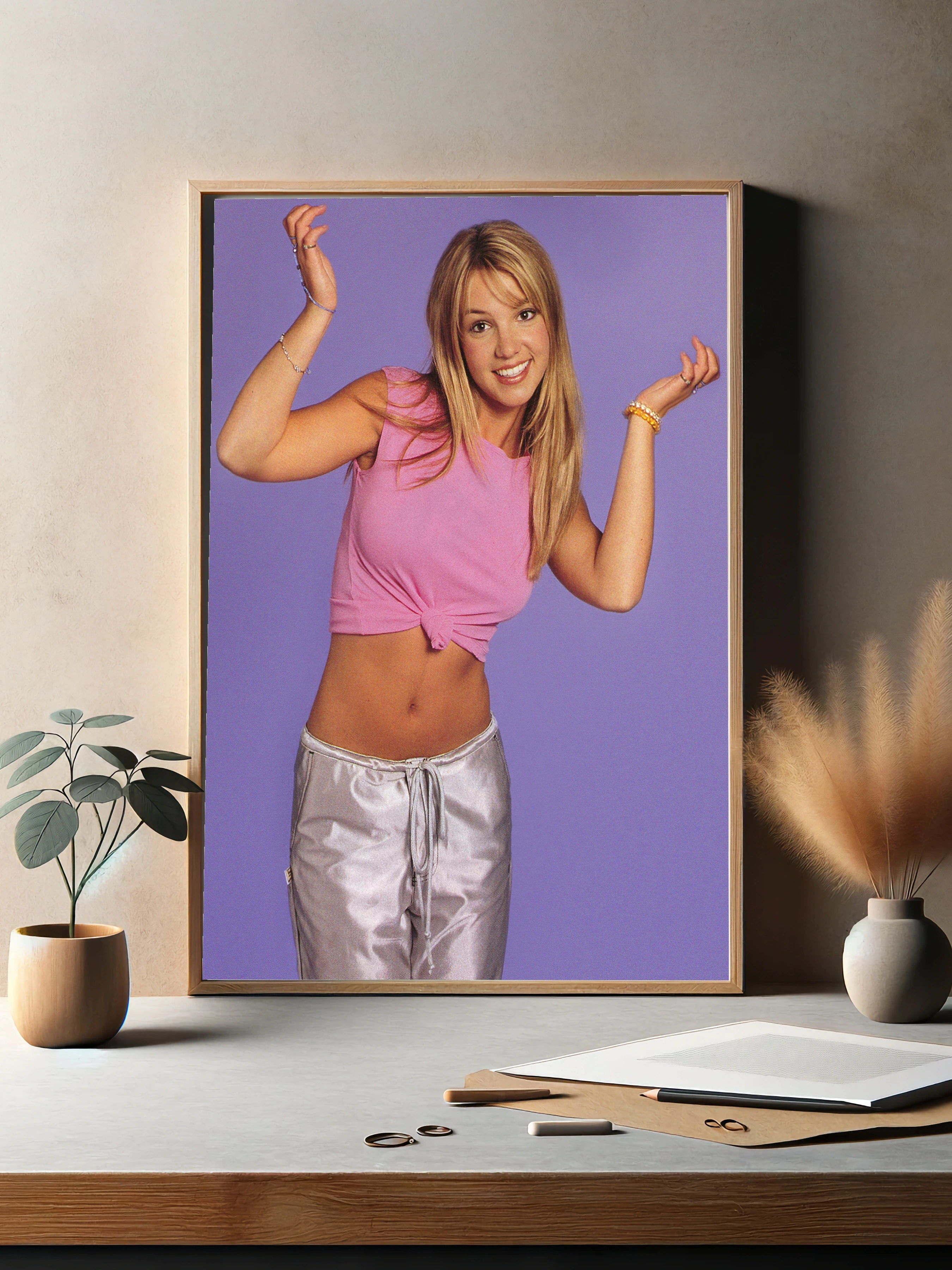 Фотоизображение Бритни Спирс, культовой поп-звезды начала 2000-х, на фоне фиолетовой стены. Ярко-розовая майка в сочетании с серебристыми атласными штанами создают настроение легкости и ностальгии по эпохе. Такой интерьерный декор идеально подойдет для создания атмосферы ретро и современного искусства в гостиной или спальне.