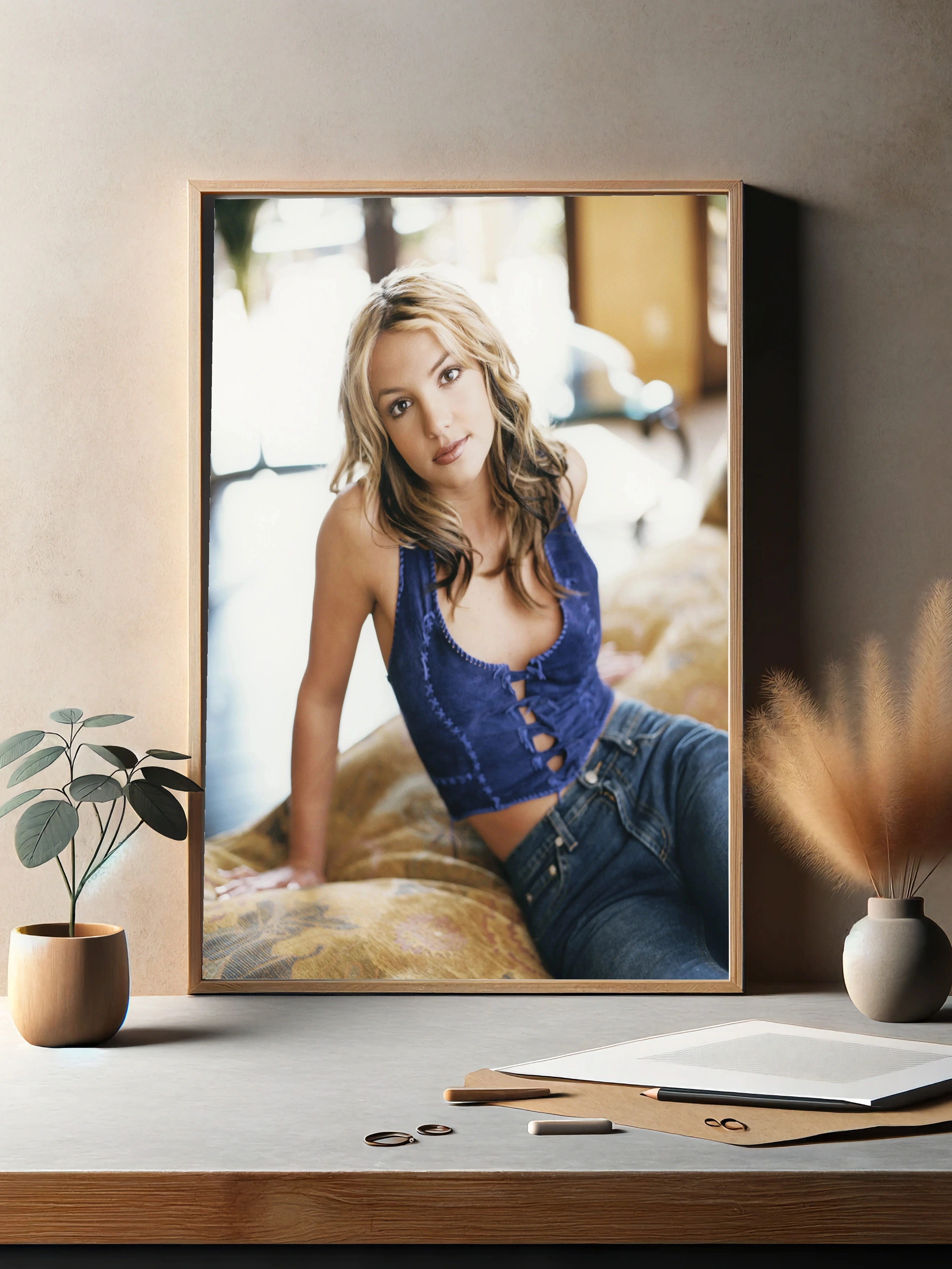 На изображении представлена известная певица Бритни Спирс в расслабленной позе на диване в светлом, уютном помещении. Она одета в синий корсет и джинсы, что придаёт образу стиль 90-х. Мягкий свет, тёплые бежевые и золотистые оттенки в интерьере создают атмосферу домашнего уюта и ностальгии. Это художественный плакат с акцентом на современное искусство для стен, идеальный декоративный плакат для гостиной или спальни.