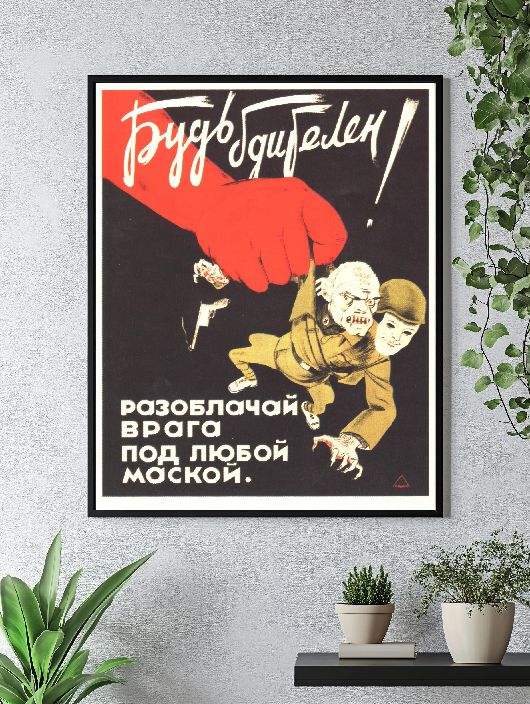 Декоративный плакат в стиле советской пропаганды с большим красным кулаком, символизирующим силу и противодействие врагам. Центральная фигура — человек в военной форме с маской, что показывает важность бдительности и разоблачения врага. Контрастные цвета и выразительный шрифт создают мощное настроение настороженности и единства.