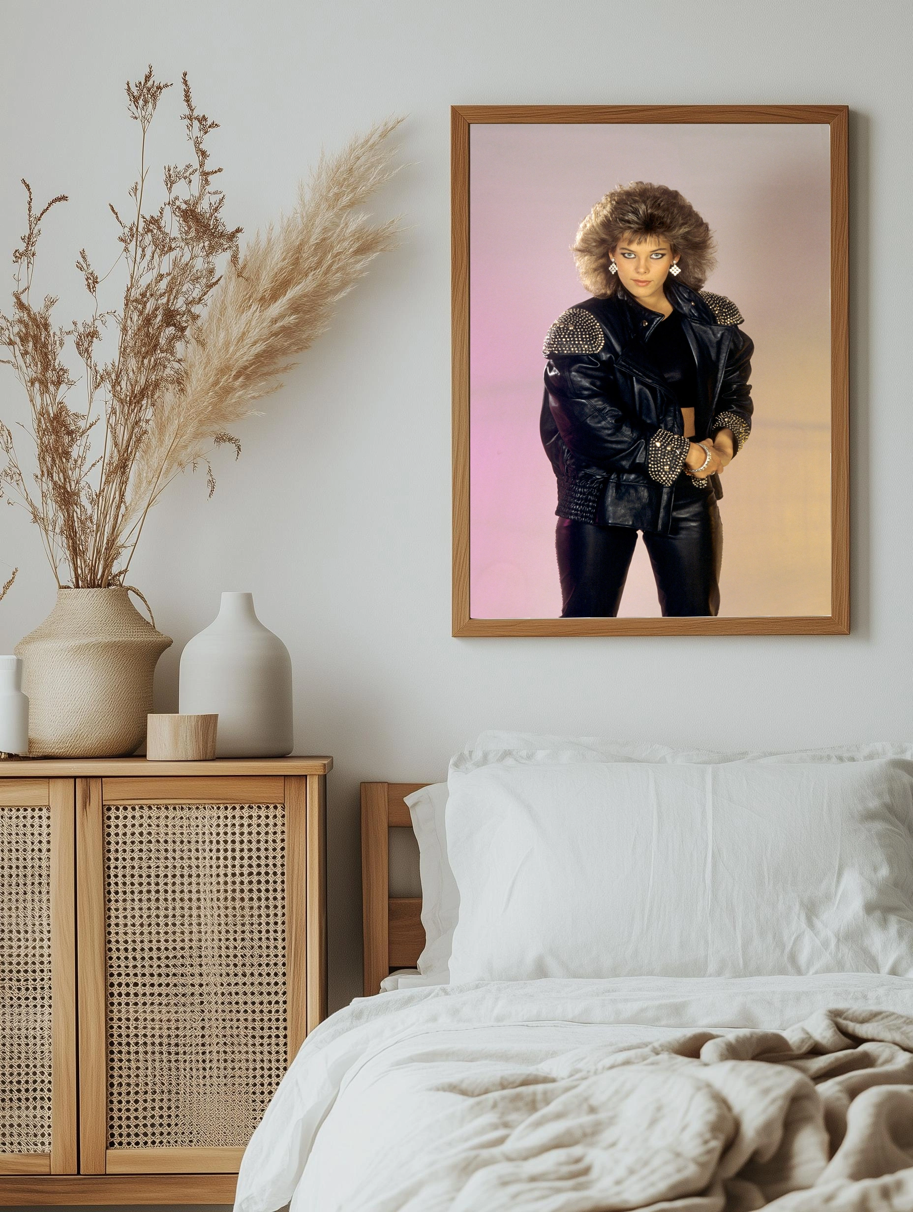 На изображении запечатлена женщина с характерной прической 80-х и насыщенным макияжем, одетая в черную кожаную куртку с металлическими заклепками и черные брюки. Стиль фото отражает дух 80-х со смелыми акцентами в одежде, создавая атмосферу гламура и рок-н-ролла. Идеально подходит как интерьерный постер для спальни или гостиной, украшение современного искусства для стен и стильный декор для офиса.