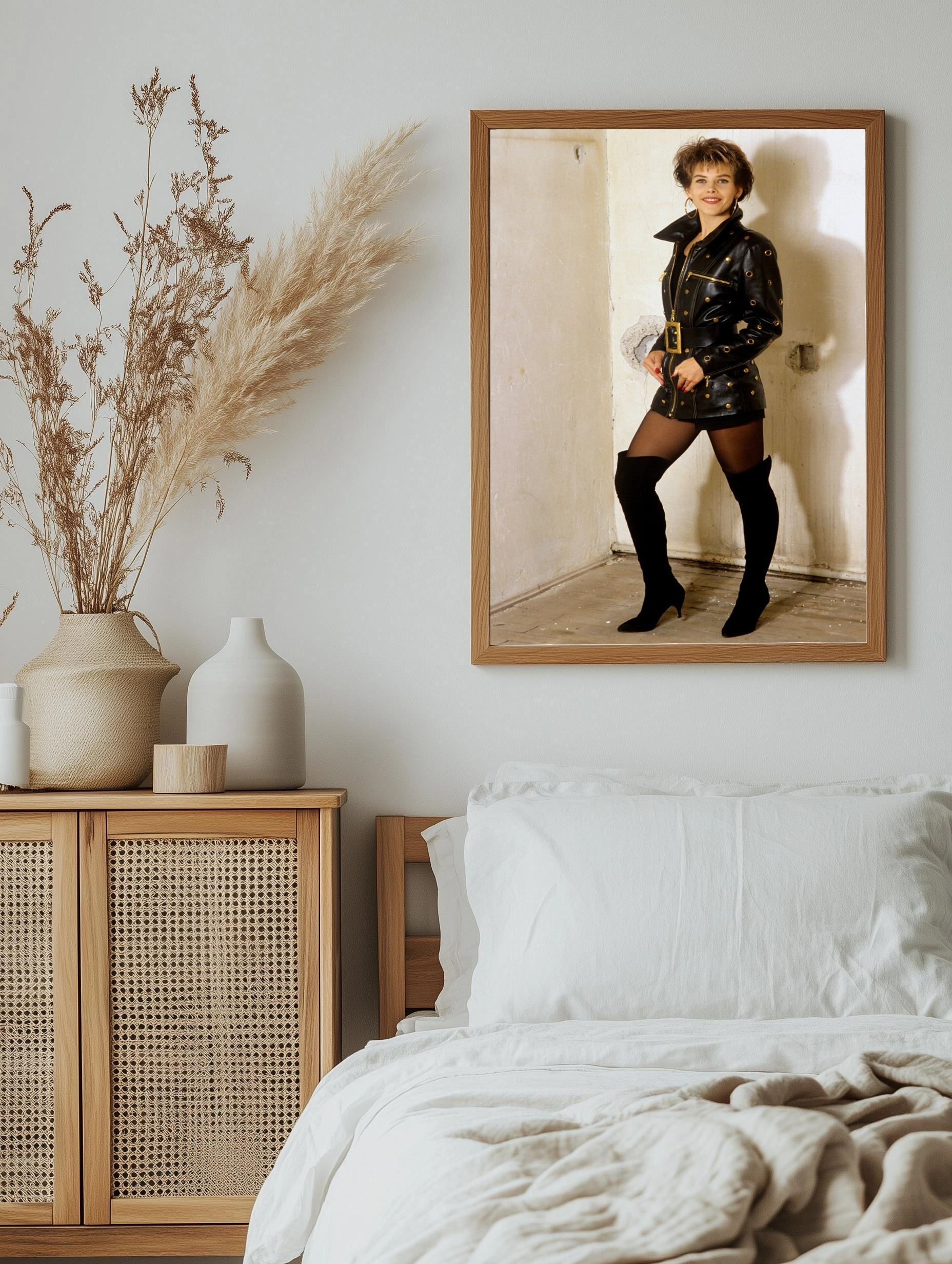 На изображении представлен женский образ в стиле 80-90-х годов: модель в чёрной кожаной куртке с золотыми металлическими элементами и поясом, сочетающейся с чёрными ботфортами на каблуках. Фон — минималистичный, нейтральный, что подчёркивает акцент на одежде и стиле. Этот художественный плакат подходит для современного интерьера, подойдёт в качестве декоративного плаката для гостиной или спальни, добавляя стильный декор стен.
