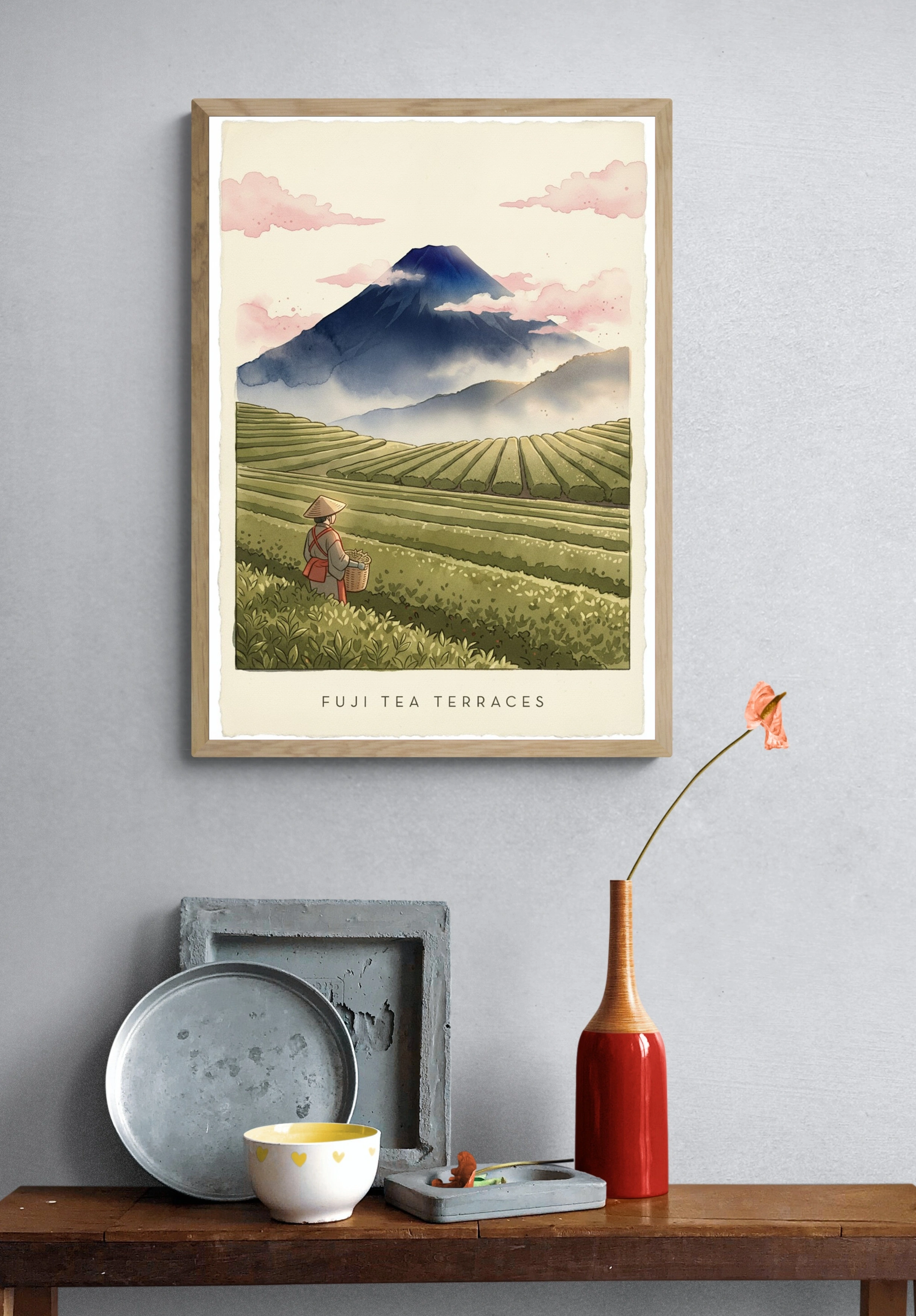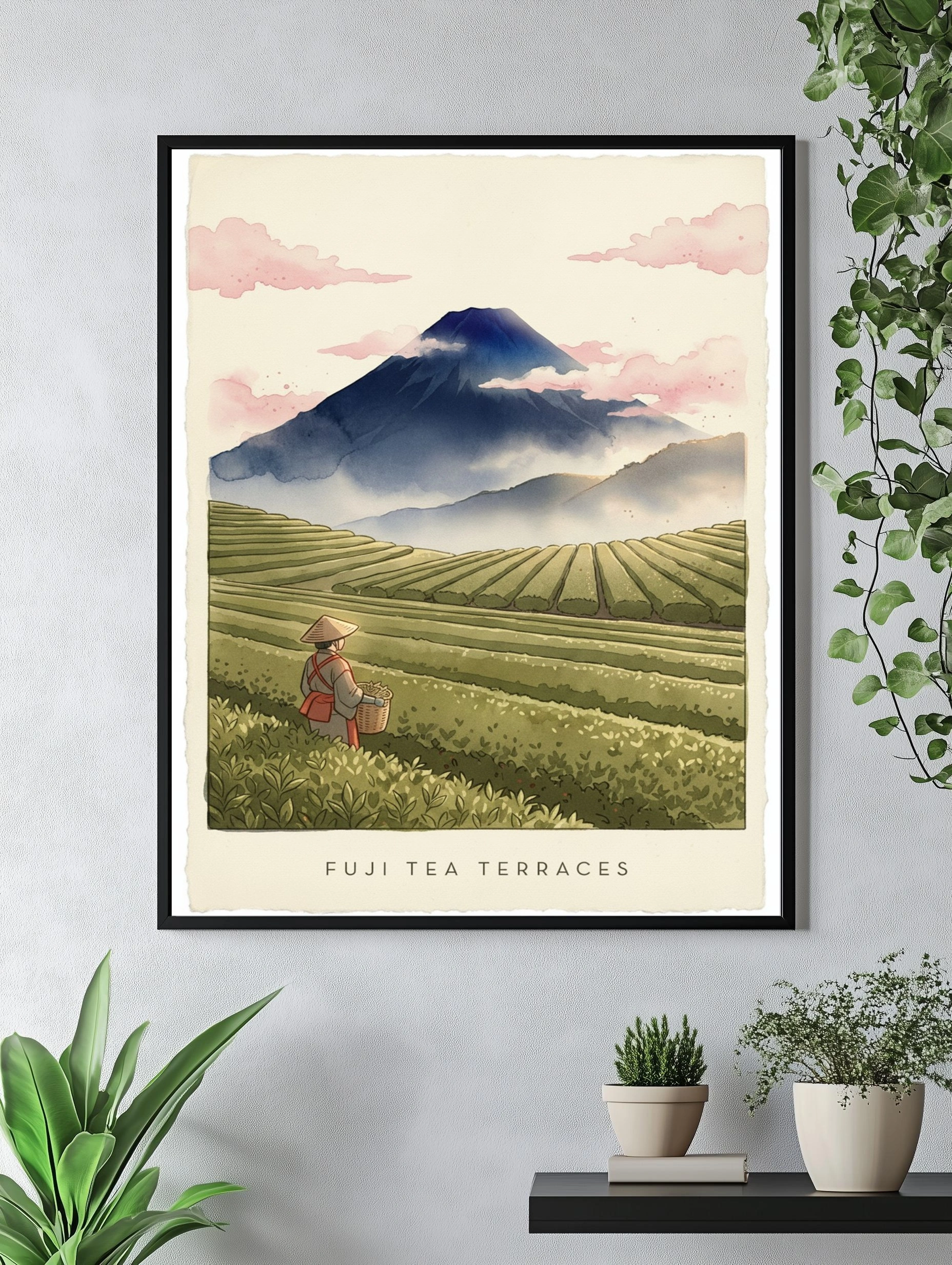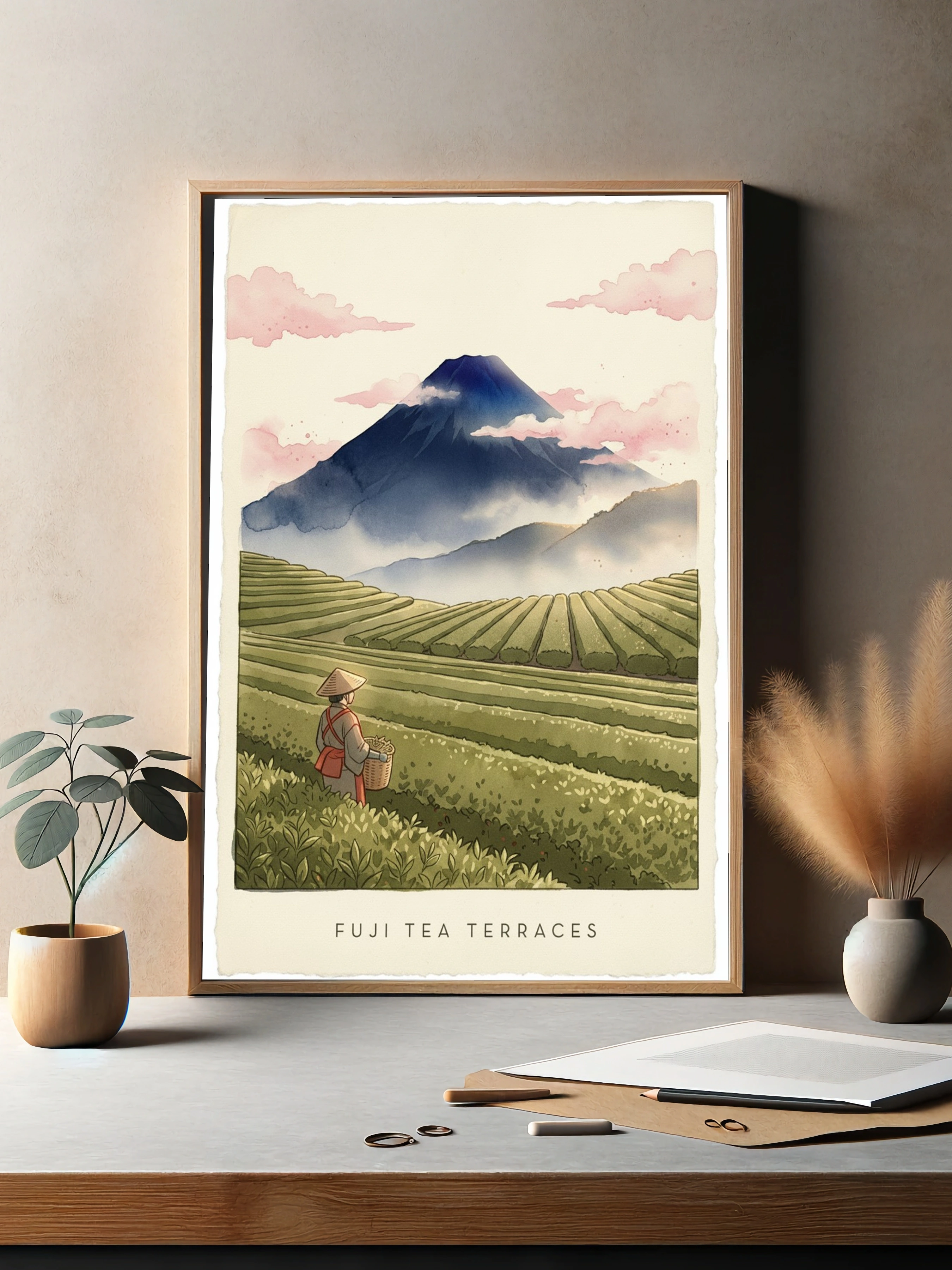 Погрузитесь в атмосферу японских чайных террас с этим удивительным постером. На переднем плане изображен работник в традиционном одеянии, собирающий чайные листья в плетеную корзину. За ним раскинулись аккуратно уложенные ряды зеленых чайных кустов, создающих ощущение бескрайних просторов. На заднем плане величественно возвышается гора Фудзи, окутанная легким туманом и облаками, что придает картине особую магию. Нежные розовые облака на фоне добавляют тепла и уюта, создавая гармоничное сочетание с зелеными оттенками. Этот постер станет идеальным акцентом для вашего интерьера, привнося в него атмосферу спокойствия и умиротворения. Подходит для гостиной, спальни или кабинета, он привлечет внимание как молодежи, так и ценителей японской культуры.