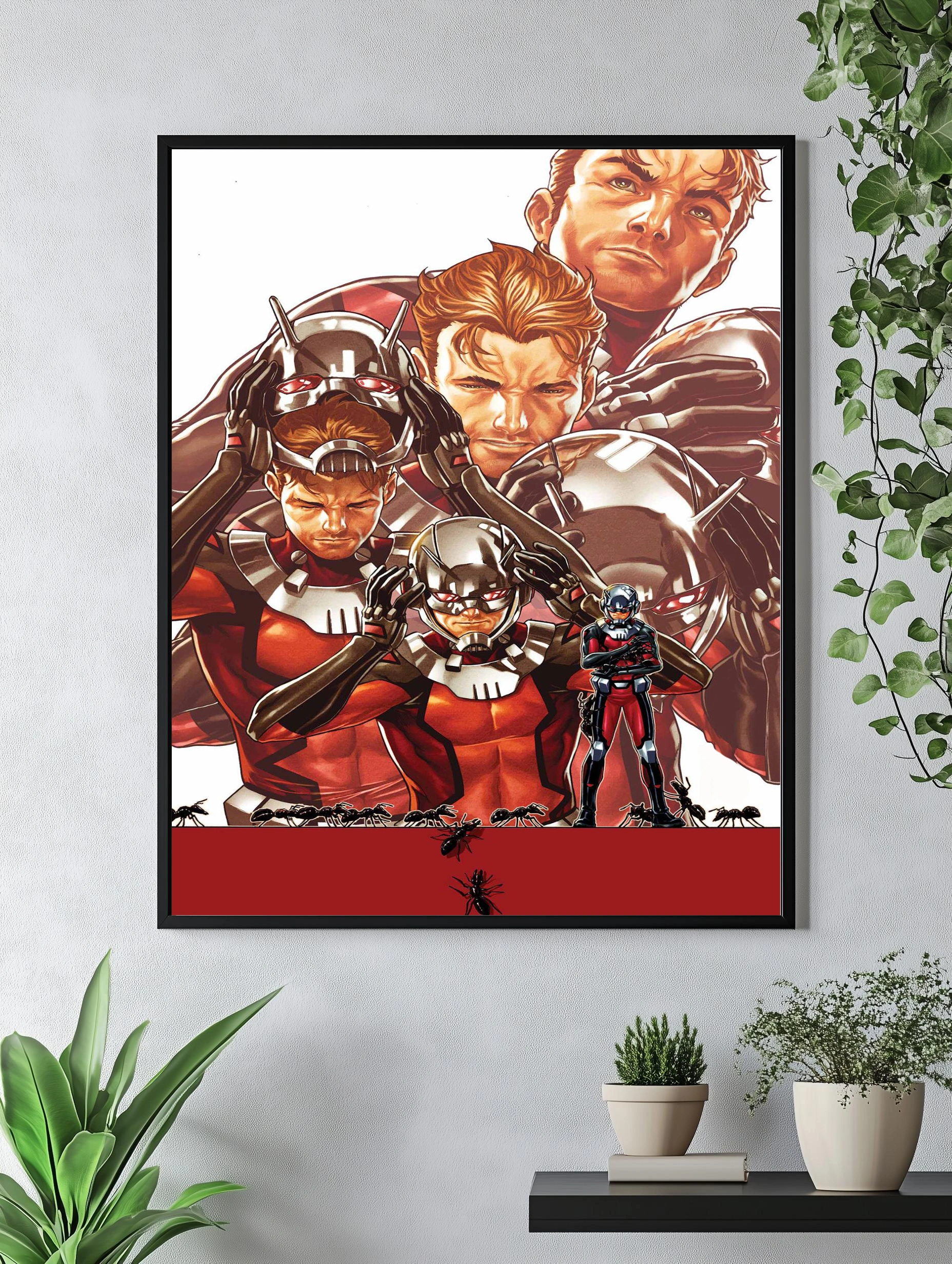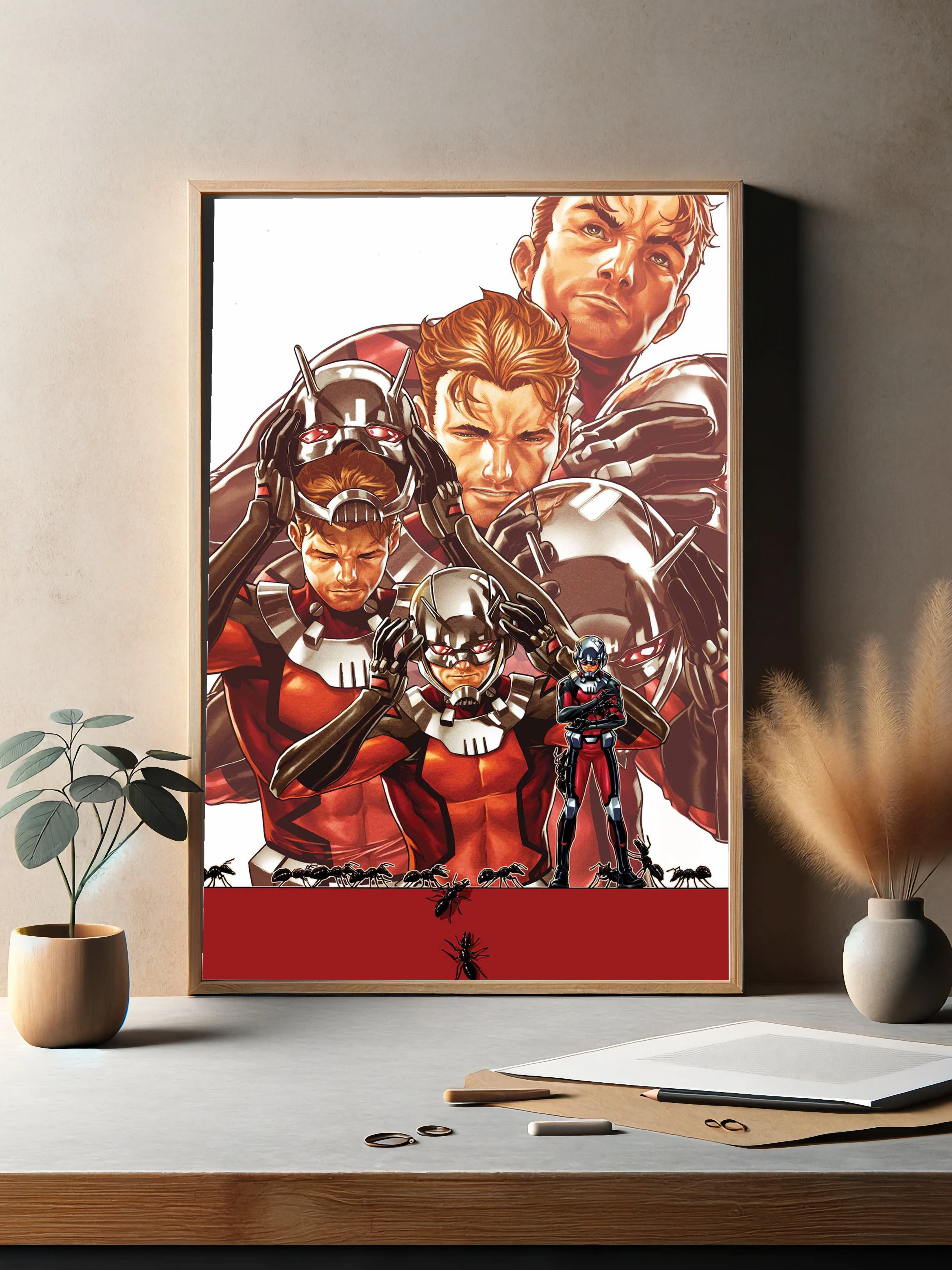 На изображении представлен Человек-муравей — известный персонаж Marvel. Центральный герой изображен в динамичных позах с характерным красно-чёрным костюмом и антеннами. Иллюстрация выполнена в реалистичном комиксовом стиле с вниманием к деталям, подчёркнута силой и решимостью героя. Интерьерный арт с художественным и современным стилем идеально подходит для оформления гостиной или офиса.