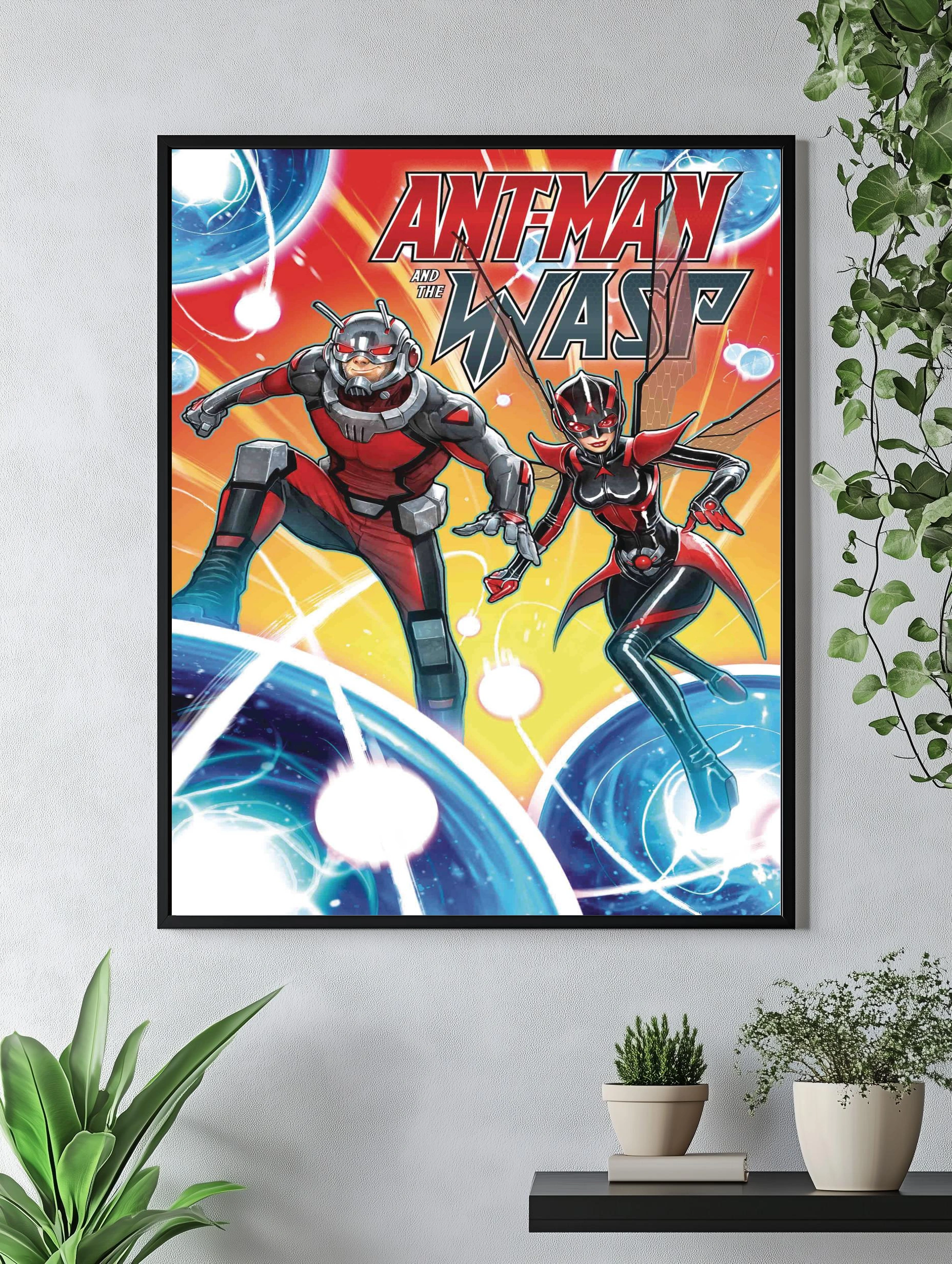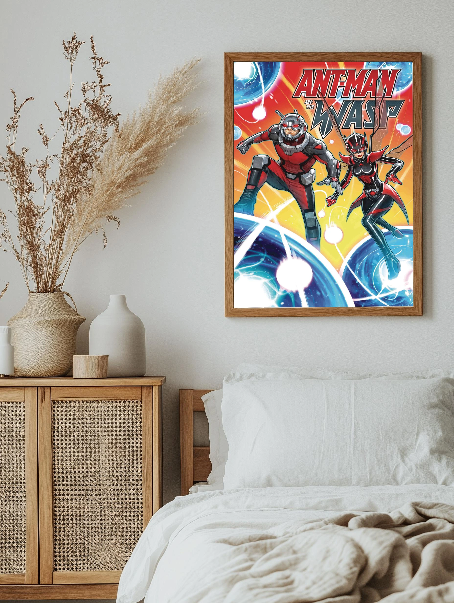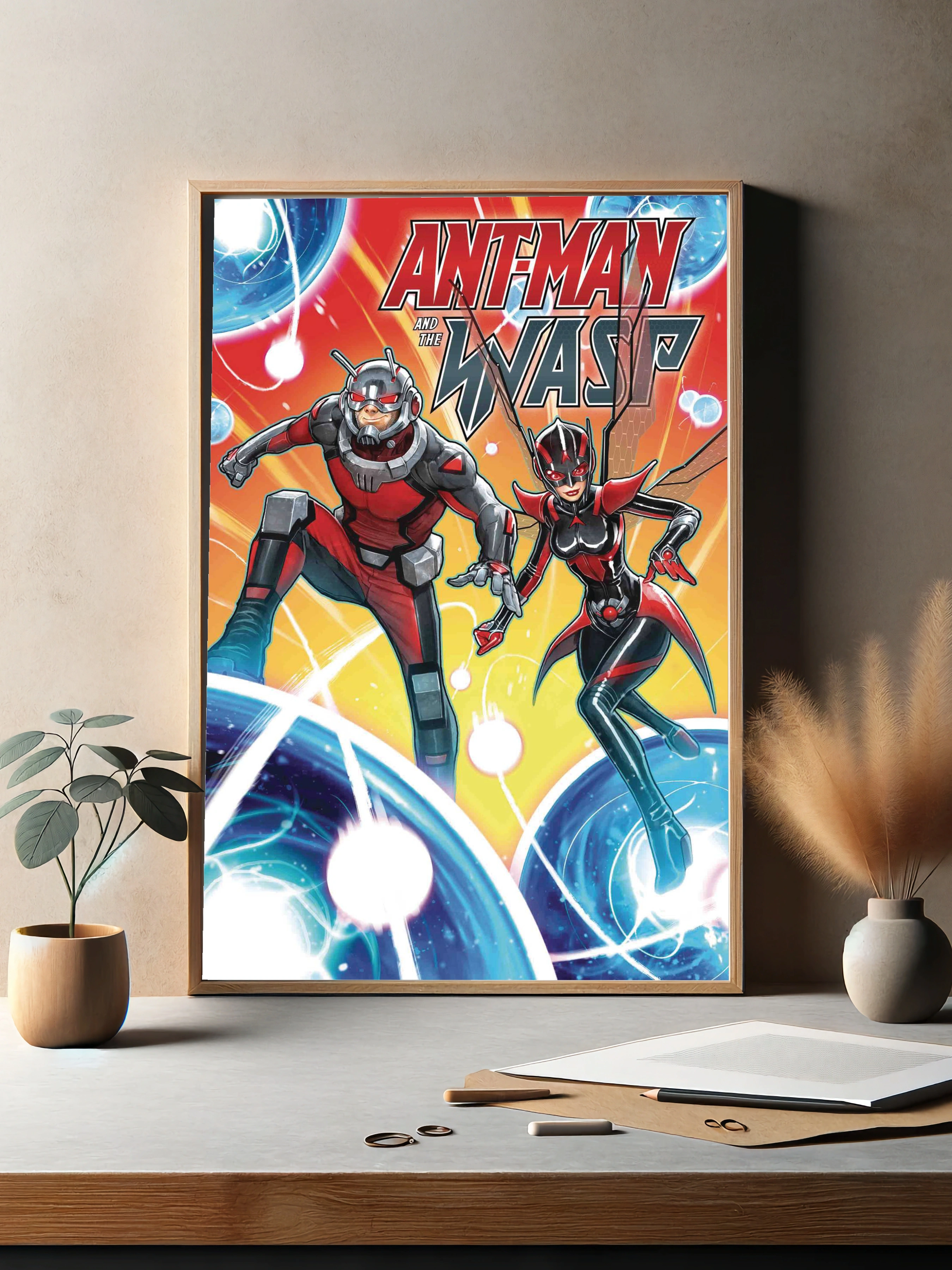 Яркая и динамичная картина с персонажами Marvel — Человек-муравей и Оса в стильных красно-чёрных костюмах. Фон в космическом стиле с синими и оранжевыми планетами подчёркивает эпическую атмосферу. Идеально для гостиной или офиса, этот интерьерный декоративный плакат добавит энергии и современного искусства для стен.