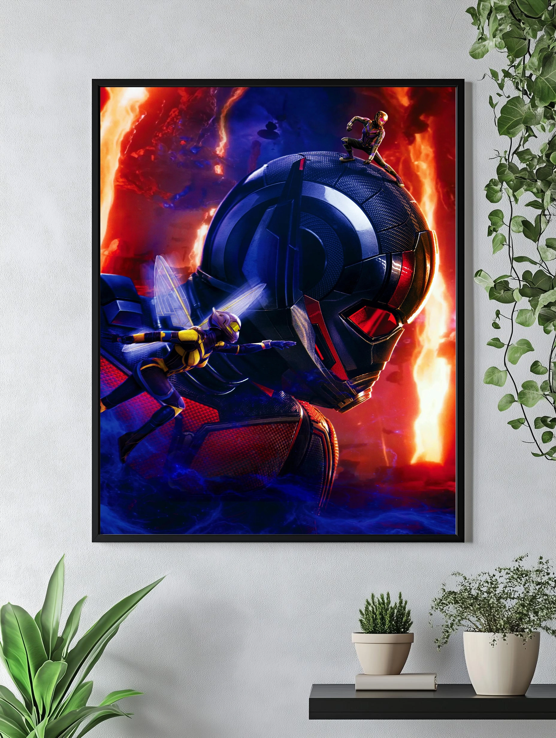 Яркий интерьерный постер с героями Marvel — Человеком-муравьем и Осой. На фоне горящего огня представлены персонажи в динамичном движении, а огромный шлем дополнительно акцентирует атмосферу напряжённости и приключений. Такой художественный плакат идеально впишется в современный интерьер и станет уникальным акцентом для гостиной или офиса.