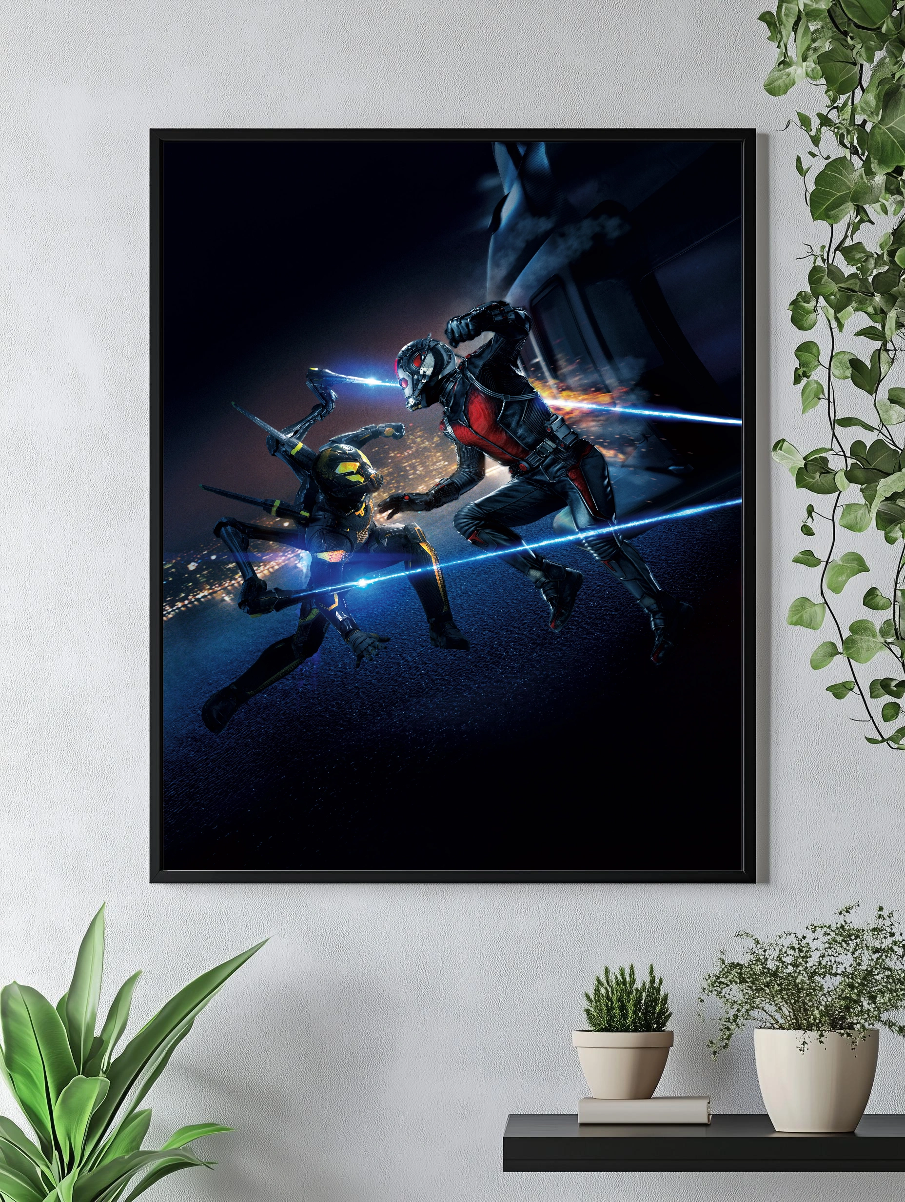 Красочный интерьерный плакат с изображением известных персонажей Marvel — Антмена и Осы в динамичной схватке. На темном фоне ночного города герои в ярких скафандрах борются с электрическими эффектами, создавая напряжённую и захватывающую атмосферу. Современное искусство для стен, идеально подходит для гостиной или офиса.