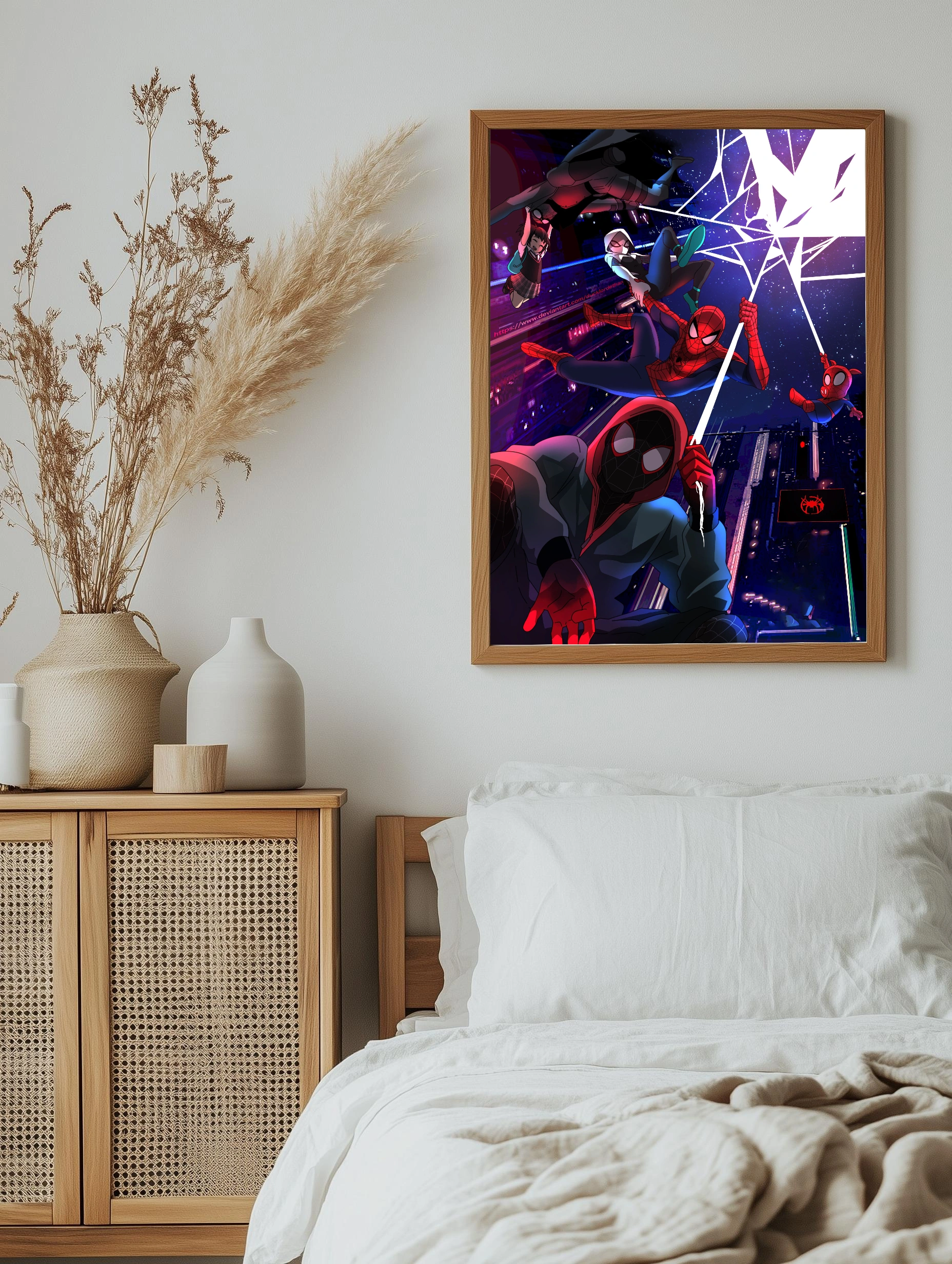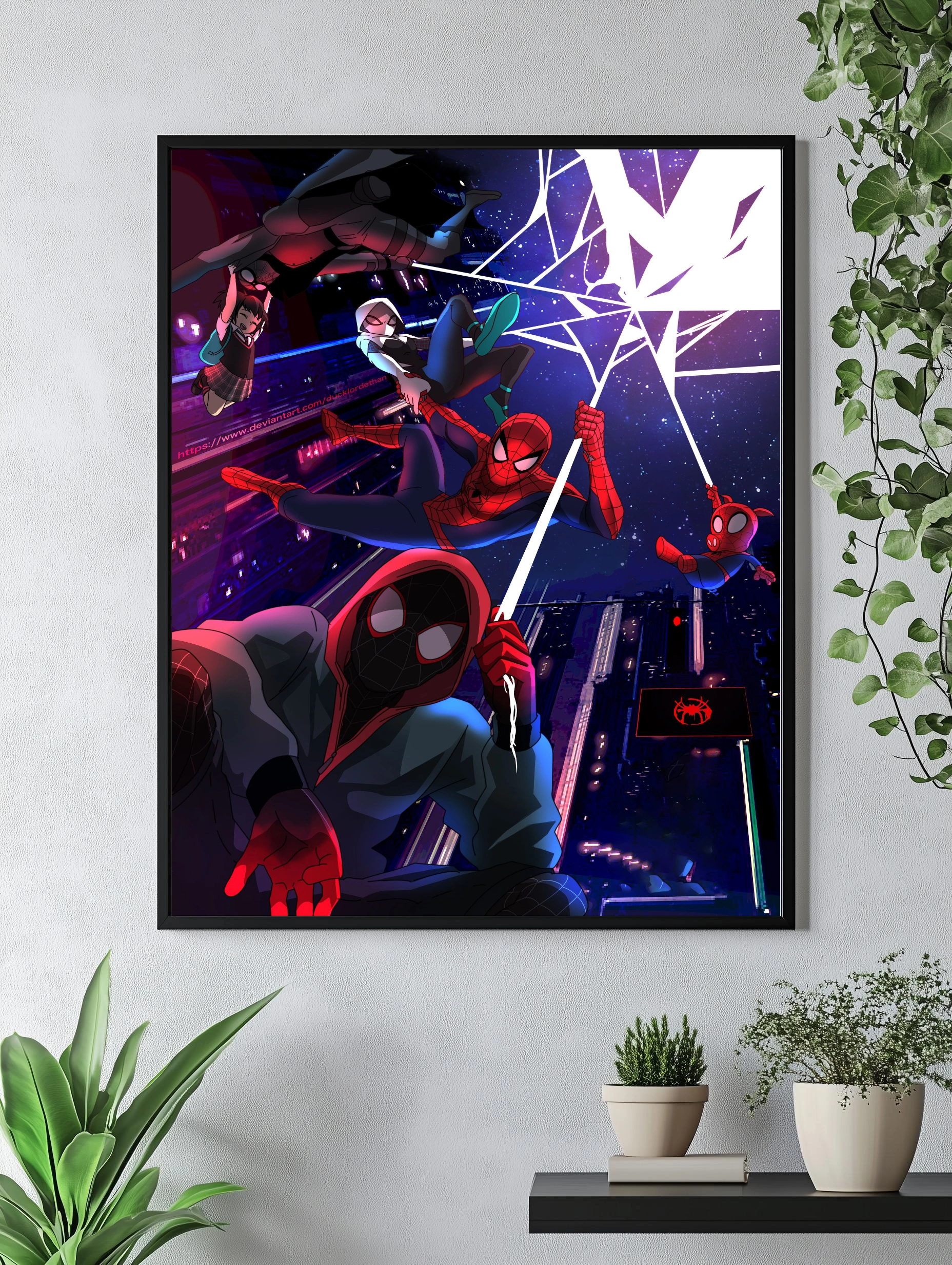 Яркая и динамичная картина на холсте с изображением нескольких версий Человека-паука, включая Майлза Моралеса, в ночном городе. Использованы насыщенные красные, синие и фиолетовые тона, которые создают атмосферу напряжённого экшена и городского волшебства. Этот декоративный плакат идеально подходит для интерьера спальни, гостиной или офиса, добавляя стильный декор стен и современное искусство для дома.