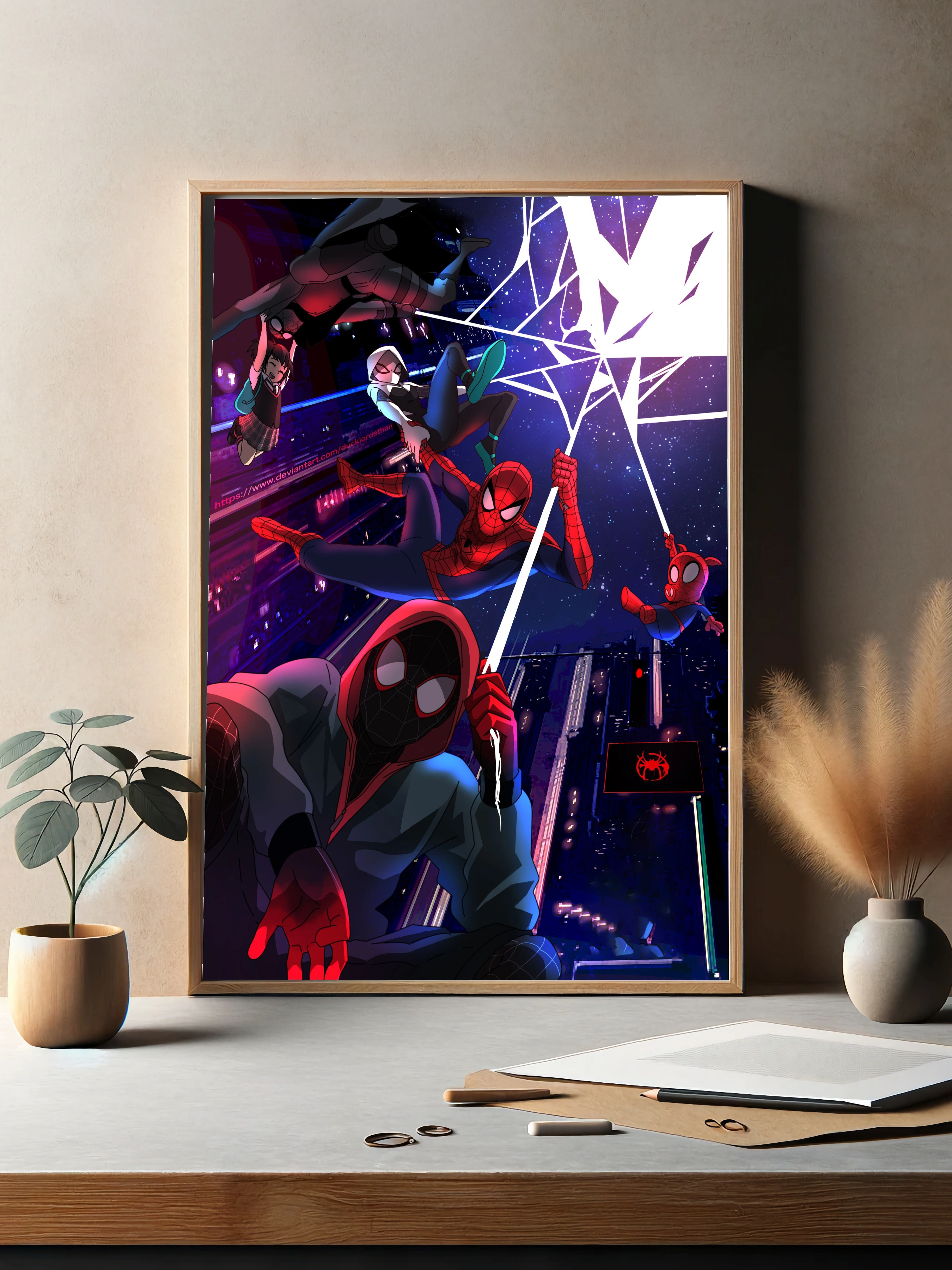 Яркая и динамичная картина на холсте с изображением нескольких версий Человека-паука, включая Майлза Моралеса, в ночном городе. Использованы насыщенные красные, синие и фиолетовые тона, которые создают атмосферу напряжённого экшена и городского волшебства. Этот декоративный плакат идеально подходит для интерьера спальни, гостиной или офиса, добавляя стильный декор стен и современное искусство для дома.