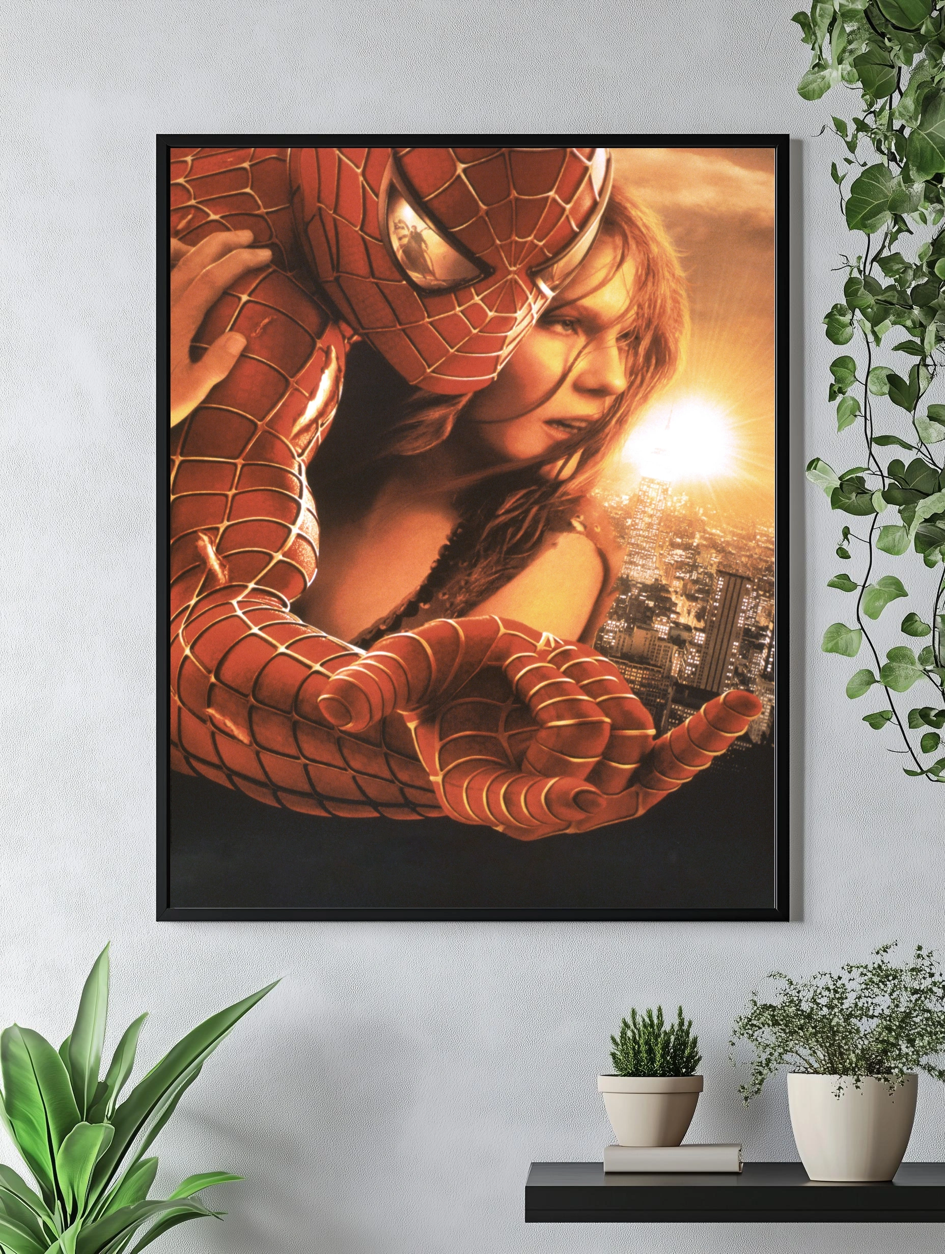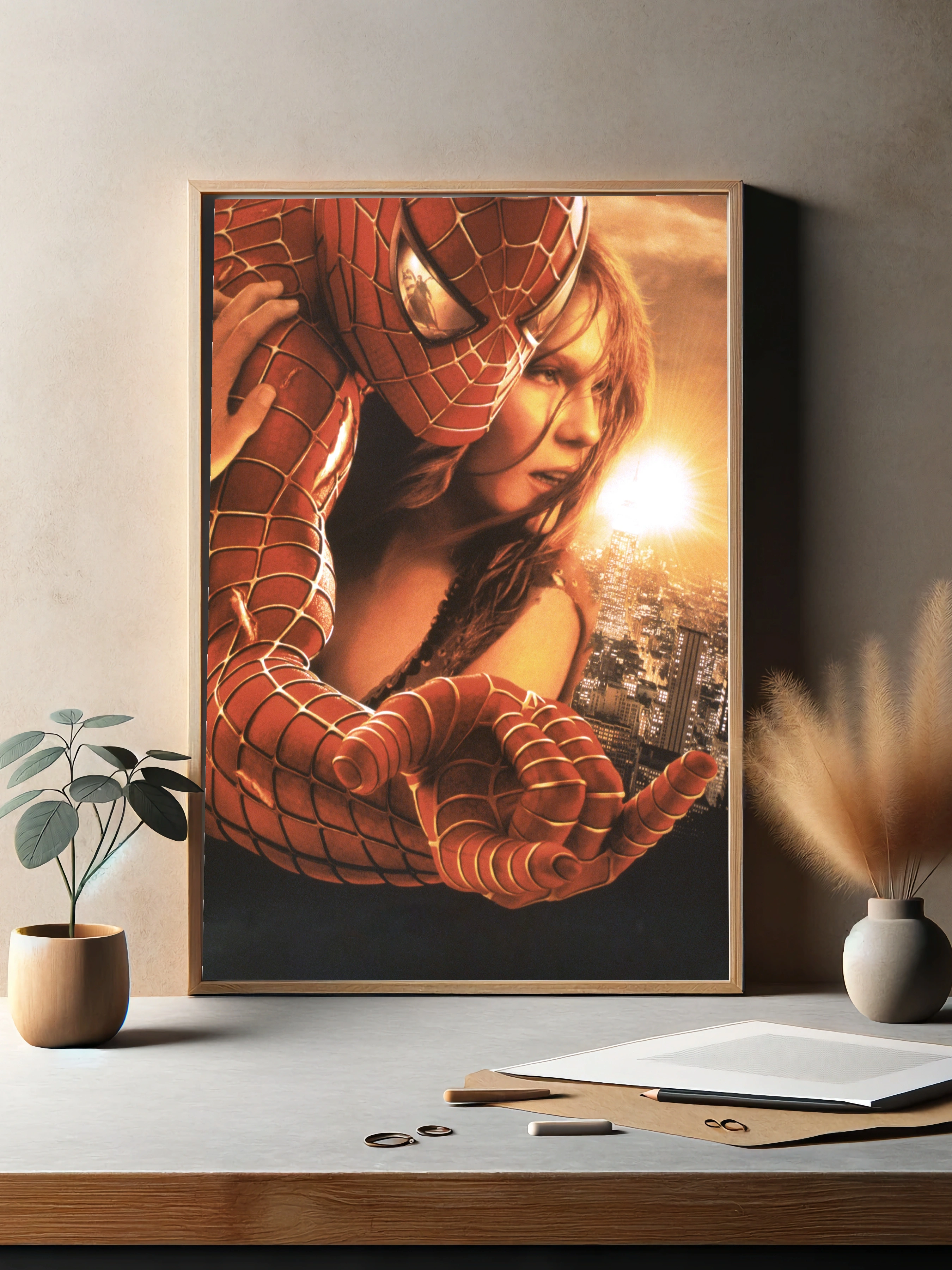 Изображение динамичной сцены с Человеком-пауком и Мэри Джейн с выраженной эмоциональной и романтической составляющей. На фоне городской панорамы и заходящего солнца, теплые оттенки подчеркивают напряжение и нежность момента. Идеально подходит для интерьерного искусства, декоративных картин и стильного декора стен.