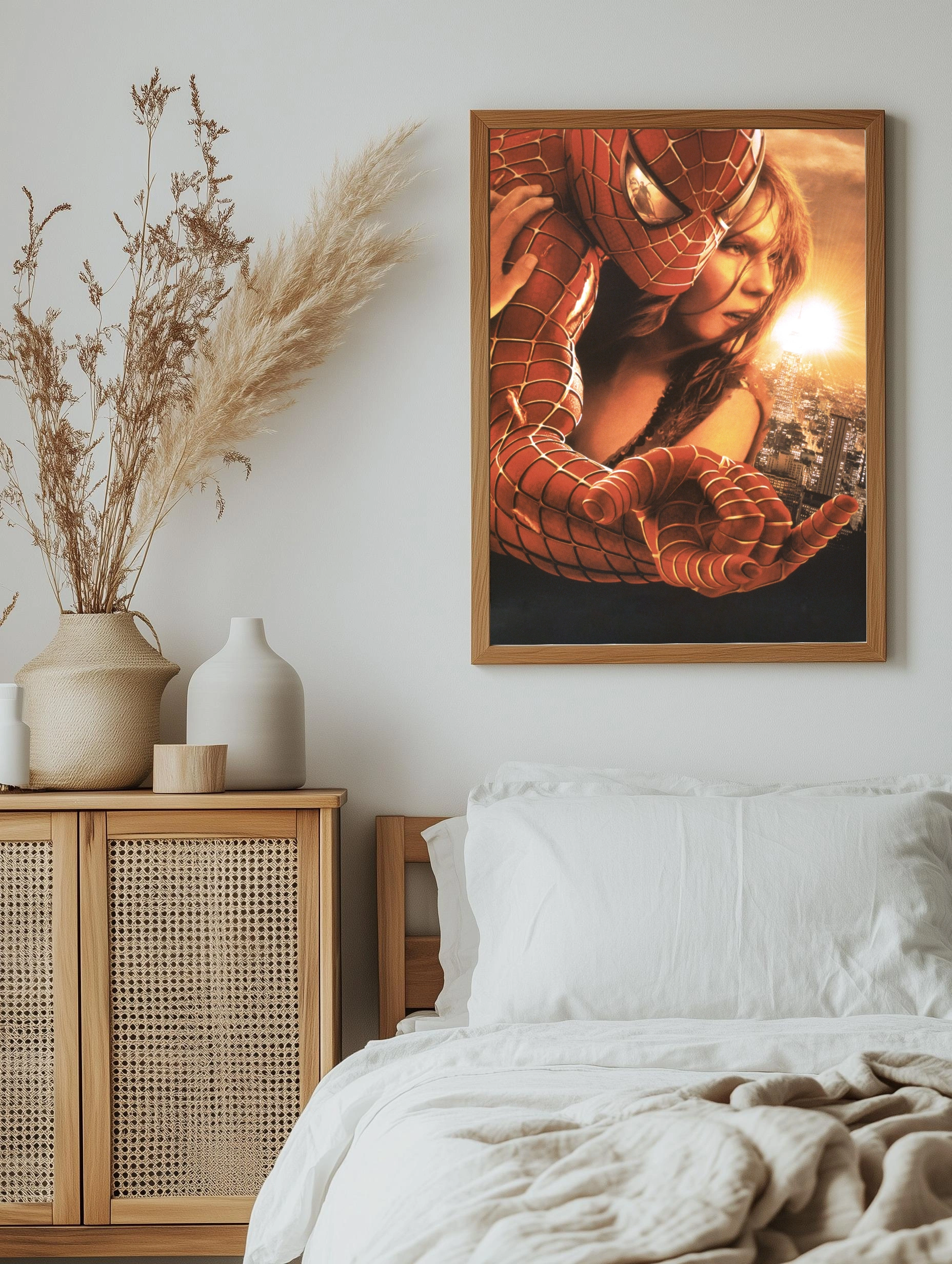 Изображение динамичной сцены с Человеком-пауком и Мэри Джейн с выраженной эмоциональной и романтической составляющей. На фоне городской панорамы и заходящего солнца, теплые оттенки подчеркивают напряжение и нежность момента. Идеально подходит для интерьерного искусства, декоративных картин и стильного декора стен.