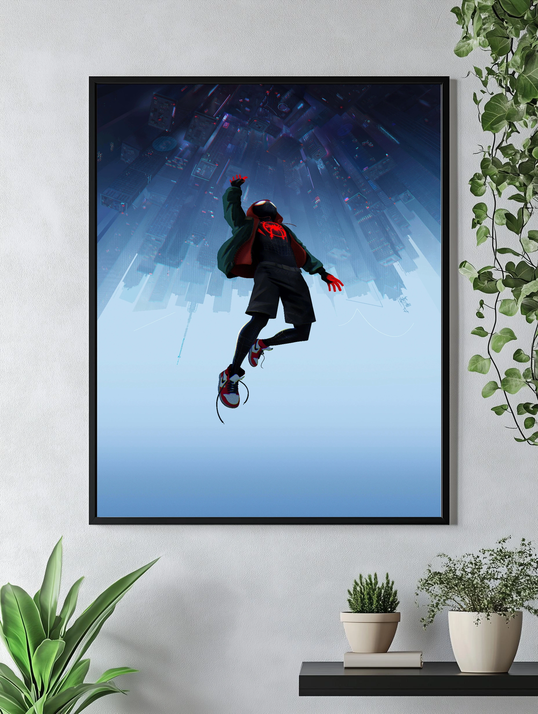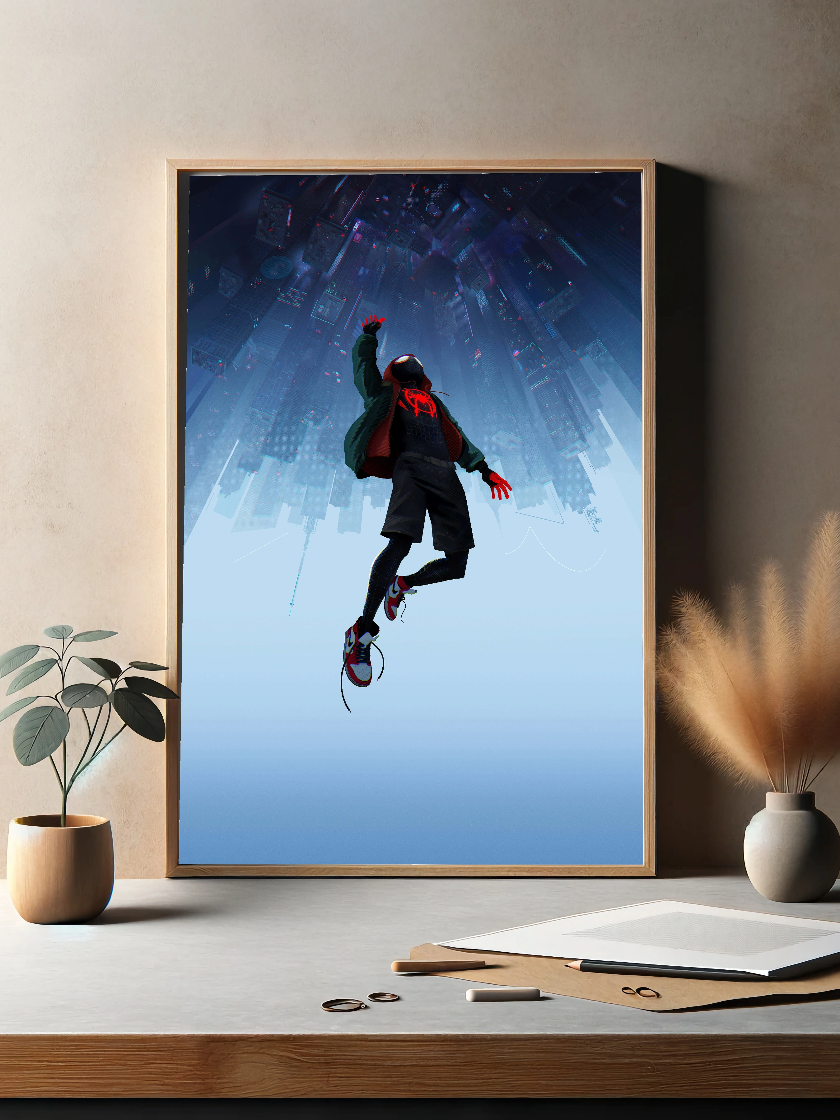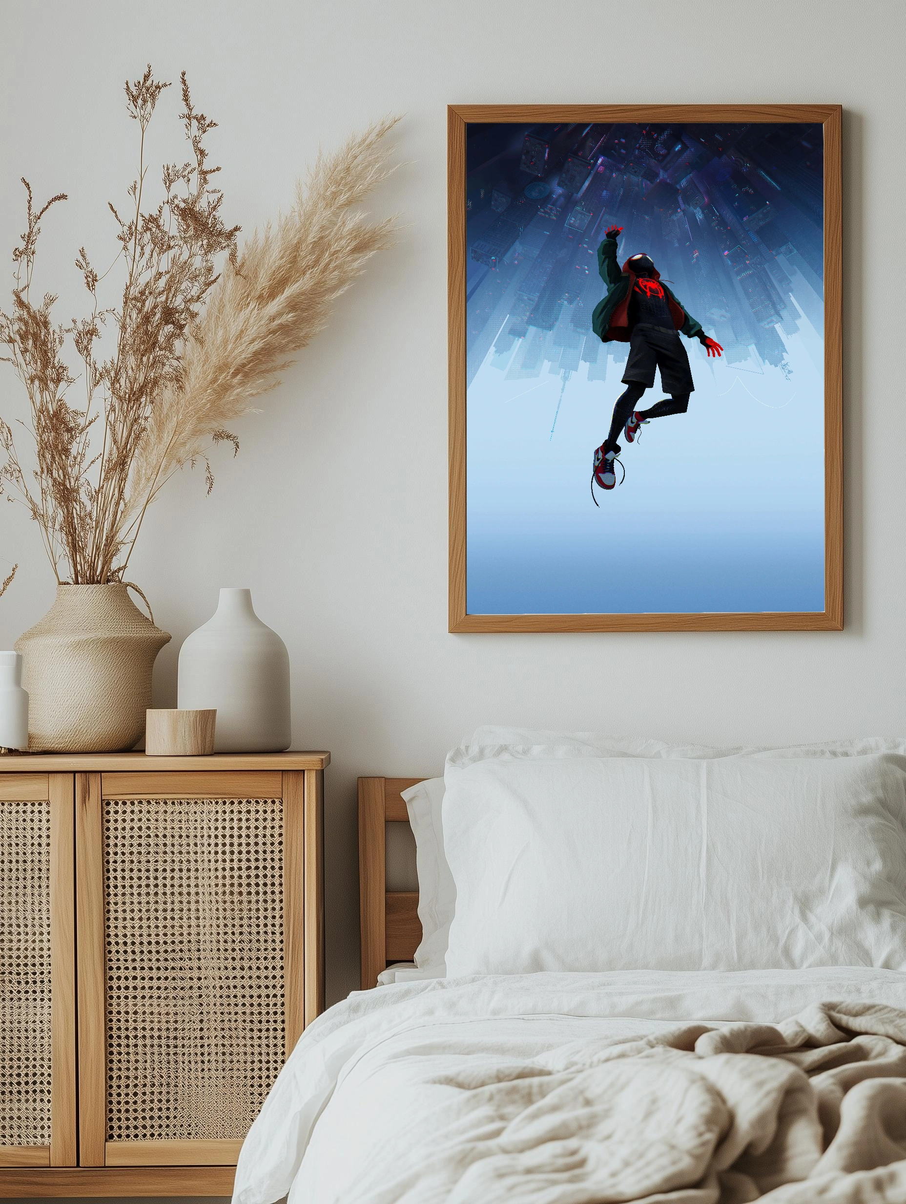 Уникальное интерьерное искусство с изображением Майлза Моралеса — Человека-паука, парящего в футуристическом городе. Картина выполнена в насыщенных синих и красных тонах с контрастной подсветкой, создавая эффект динамики и движения. Идеальный декоративный плакат для гостиной или спальни с современным городским мотивом.