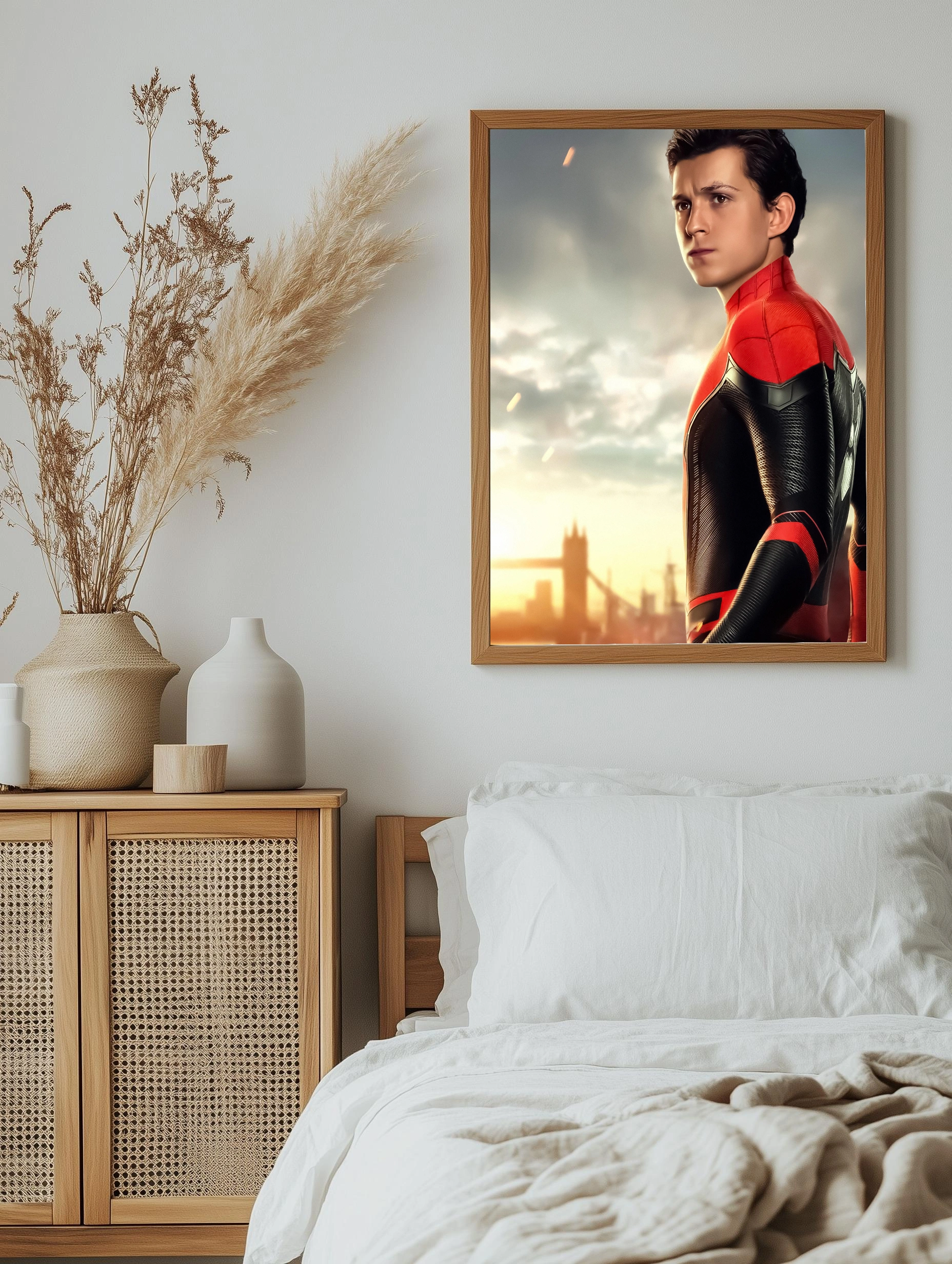 Яркий интерьерный плакат с изображением Человека-паука в исполнении Тома Холланда на фоне городского пейзажа. Детализированное изображение героя в красно-чёрном костюме, выполненное в стиле современного искусства для стен. Идеальный выбор для декоративного декора в гостиной или офисе.